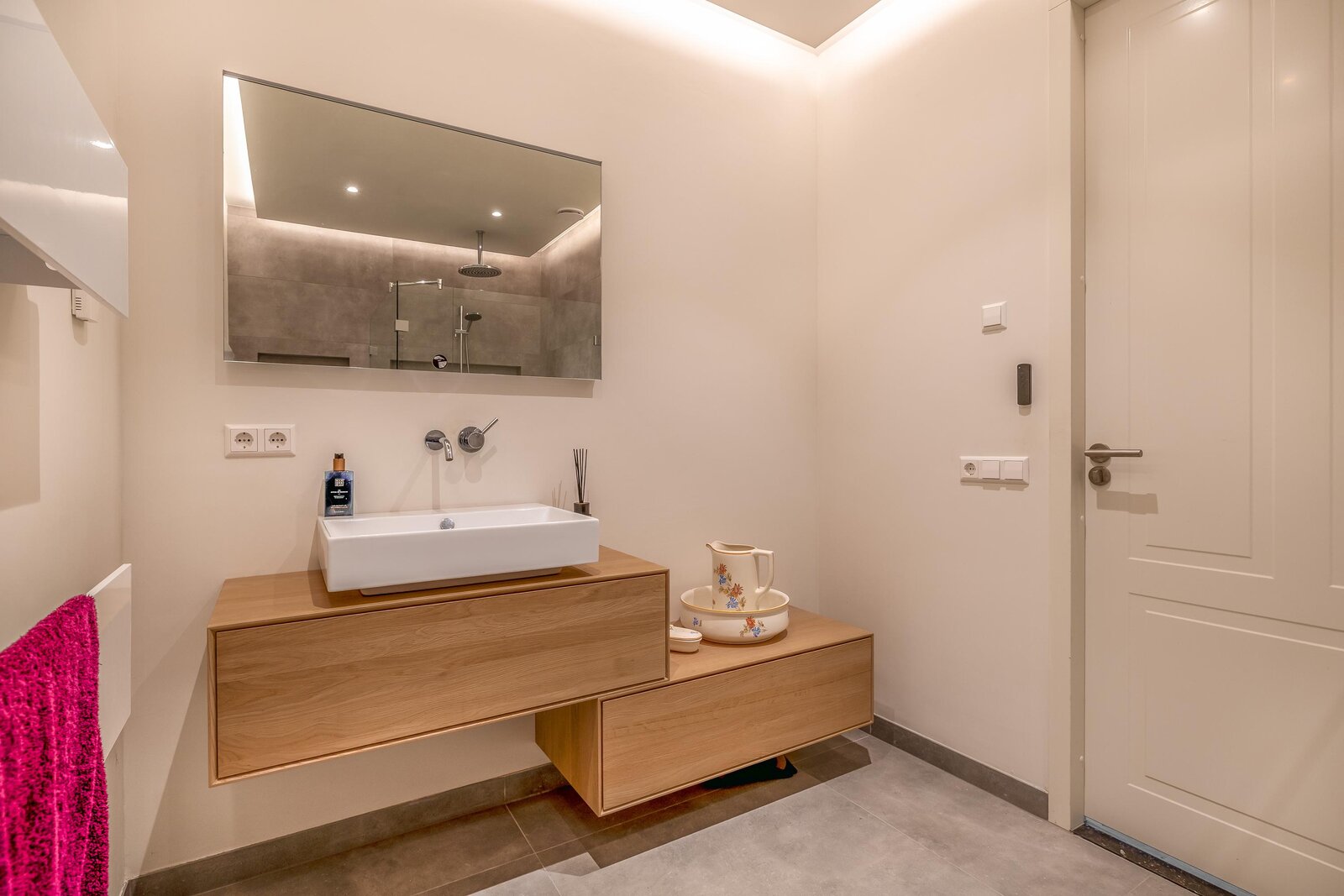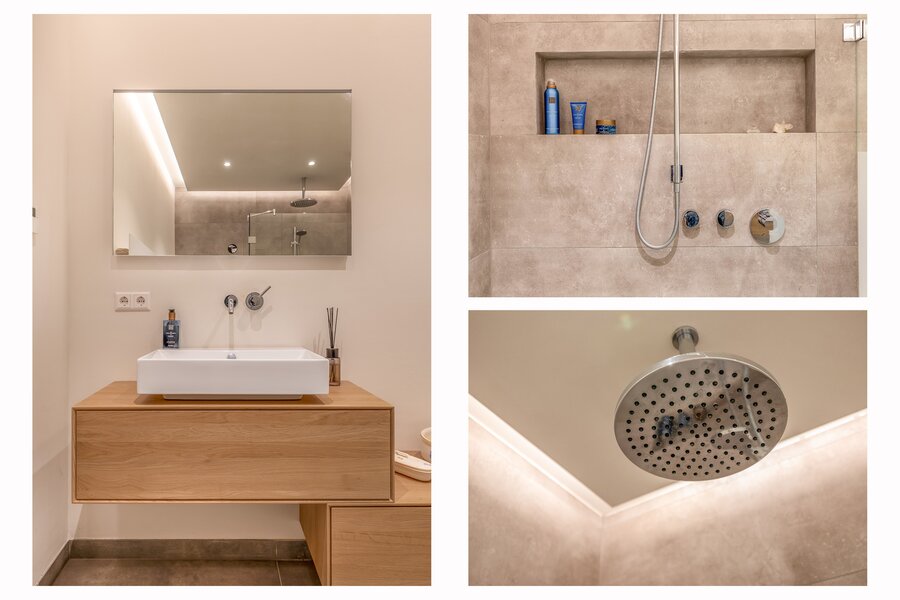 De riante badkamer is modern afgewerkt met grote tegels, een ruime inloopdouche met regendouche, een wandcloset en een strak wastafelmeubel. Het geheel is uitgevoerd in neutrale tinten en heeft een luxe hotel-uitstraling.