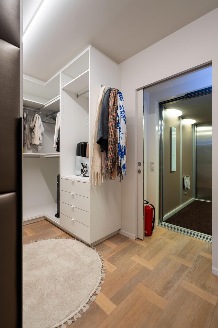 Uniek is de aanwezigheid van maar liefst drie eigen parkeerplaatsen in de afgesloten parkeergarage, met een privélift die exclusief toegang geeft tot beide woonlagen van dit penthouse.