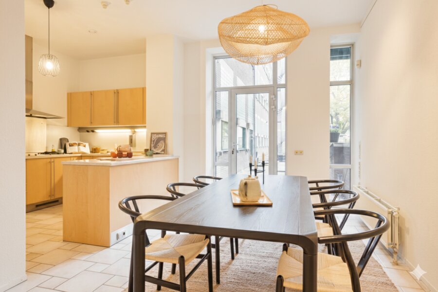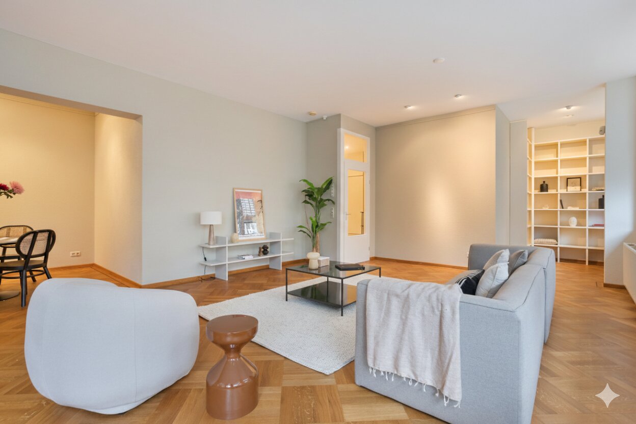 De royale woonkamer wordt gekenmerkt door een prachtige lichtinval dankzij de grote raampartijen en de indrukwekkende plafondhoogte. Aan de achterzijde bevindt zich de ruime keuken, voorzien van inbouwapparatuur en met directe toegang tot het beschutte terras aan de binnentuin.