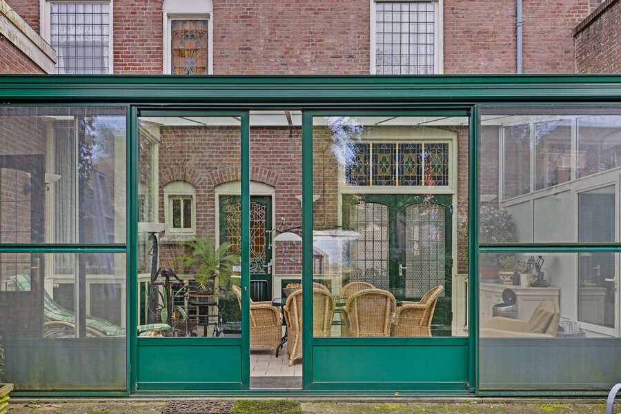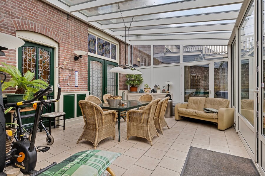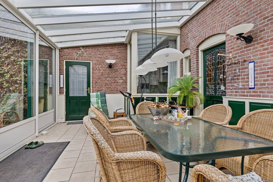 Direct grenzend aan het huis bevindt zich een ruime serre met glazen schuifwanden. Deze lichte en beschutte ruimte vormt de overgang tussen binnen en buiten en is ideaal om het hele jaar door te genieten van de tuin. De serre is voorzien van verwarmingsradiatoren. Vanuit de serre loopt u direct het sfeervolle terras op, een heerlijke plek om te ontspannen, te dineren of van de zon te genieten.