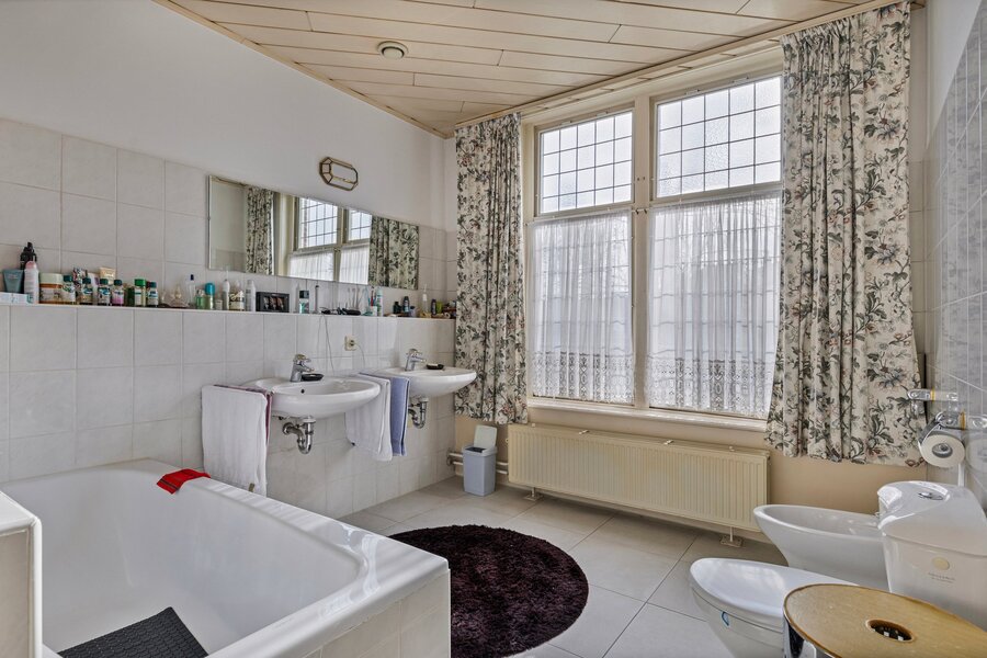 De badkamer is van alle gemakken voorzien en beschikt over een ligbad, douche, dubbele wastafels, een toilet en een bidet.