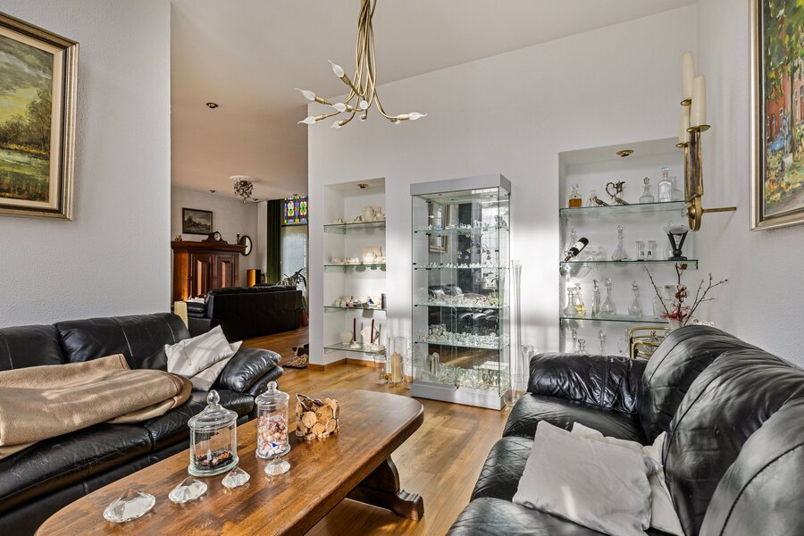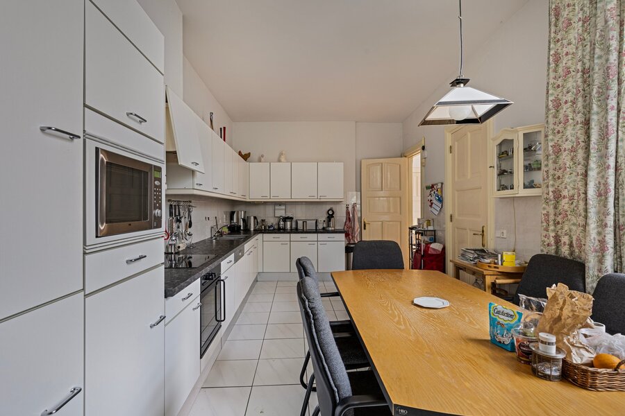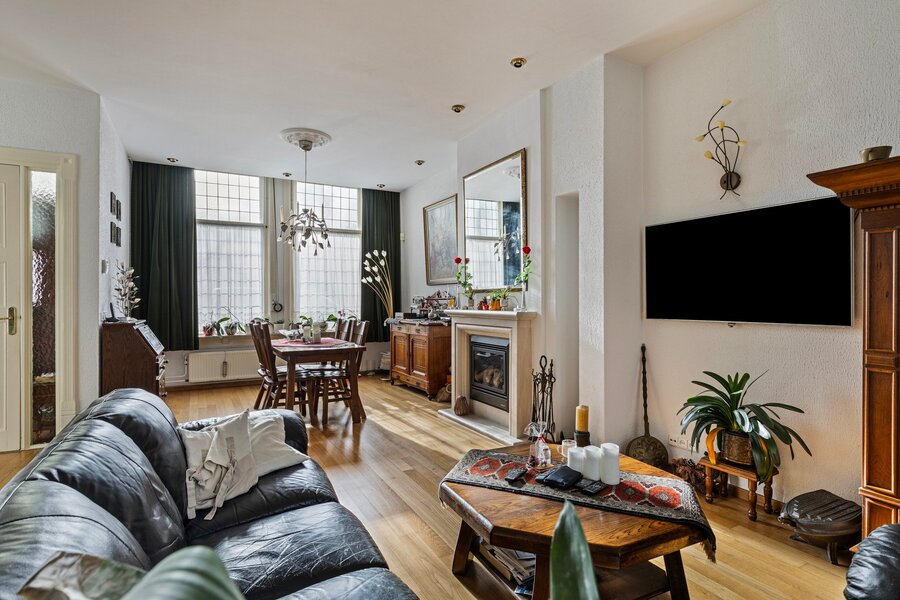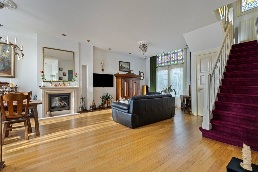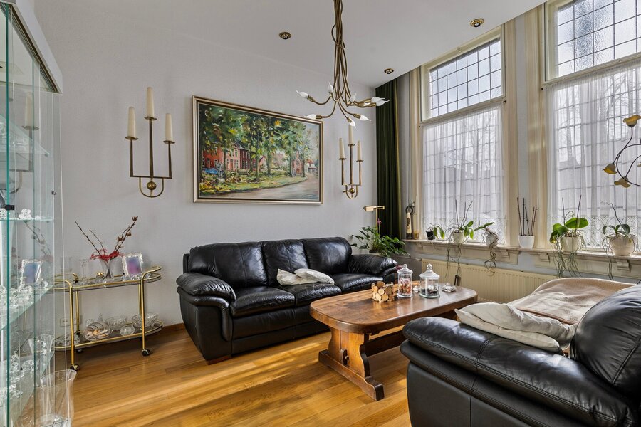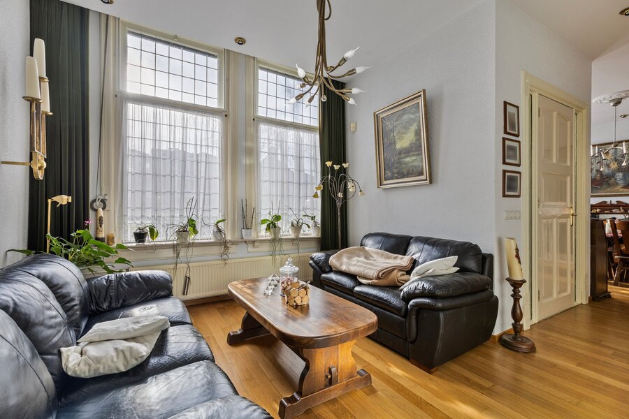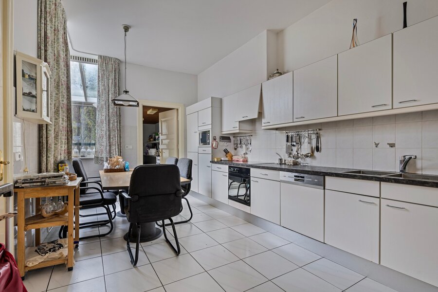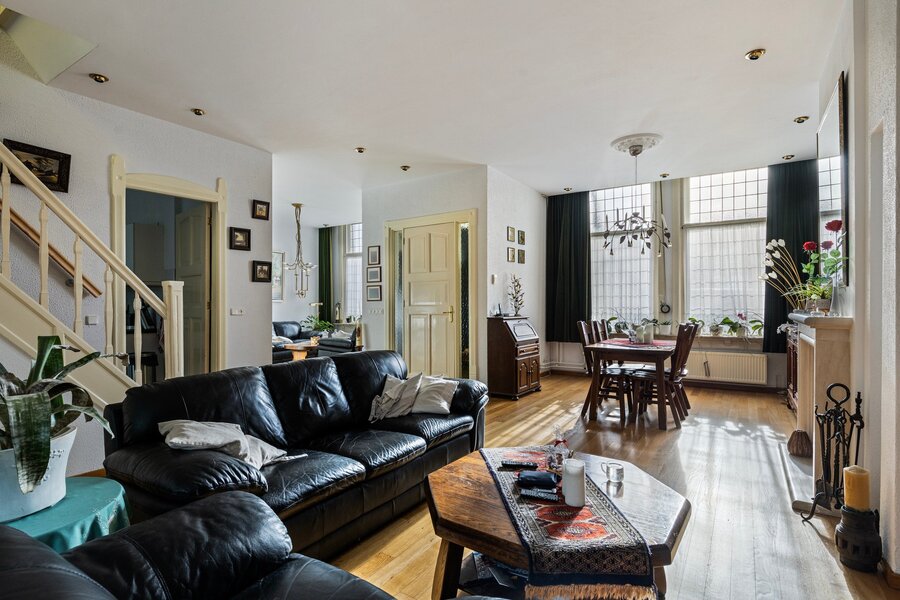 De woonkamer is een prachtige, open ruimte met veel lichtinval dankzij de hoge raampartijen aan zowel de voor- als achterzijde van de woning. De combinatie van het houten parket, de klassieke gashaard en de hoge plafonds met stijlvolle verlichting zorgen voor een warme en gezellige sfeer. Aan de voorzijde bevindt zich een comfortabele zithoek met grote raampartijen. Centraal in de ruimte is een grote eethoek geplaatst, perfect voor gezellige etentjes met familie en vrienden. Aan de achterzijde van de woning is nog ruimte voor het plaatsen van een extra zithoek. Openslaande deuren met glas-in-lood bieden toegang tot de grote serre, waarin nog een zee van ruimte voor bijvoorbeeld een grote loungeset. Hier kunt u zomer en winter heerlijk verblijven en genieten. Via de serre kunt u ook de achterliggende bijkeuken bereiken. Centraal in de woonkamer ligt de trapopgang naar de eerste verdieping en de toegang naar een halletje met de toiletruimte. Ook de grote leefkeuken is via een deur in de woonkamer bereikbaar en biedt veel kastruimte. Alle belangrijke apparatuur is hier aanwezig, zoals een inductiekookplaat, magnetron, oven en vaatwasser. U kunt in de keuken met gemak een grote tafel plaatsen om ’s morgens lekker te genieten van een kopje koffie en het lezen van uw krantje.