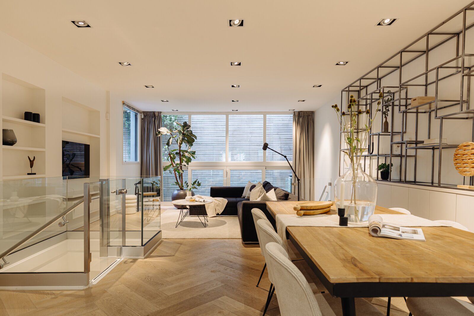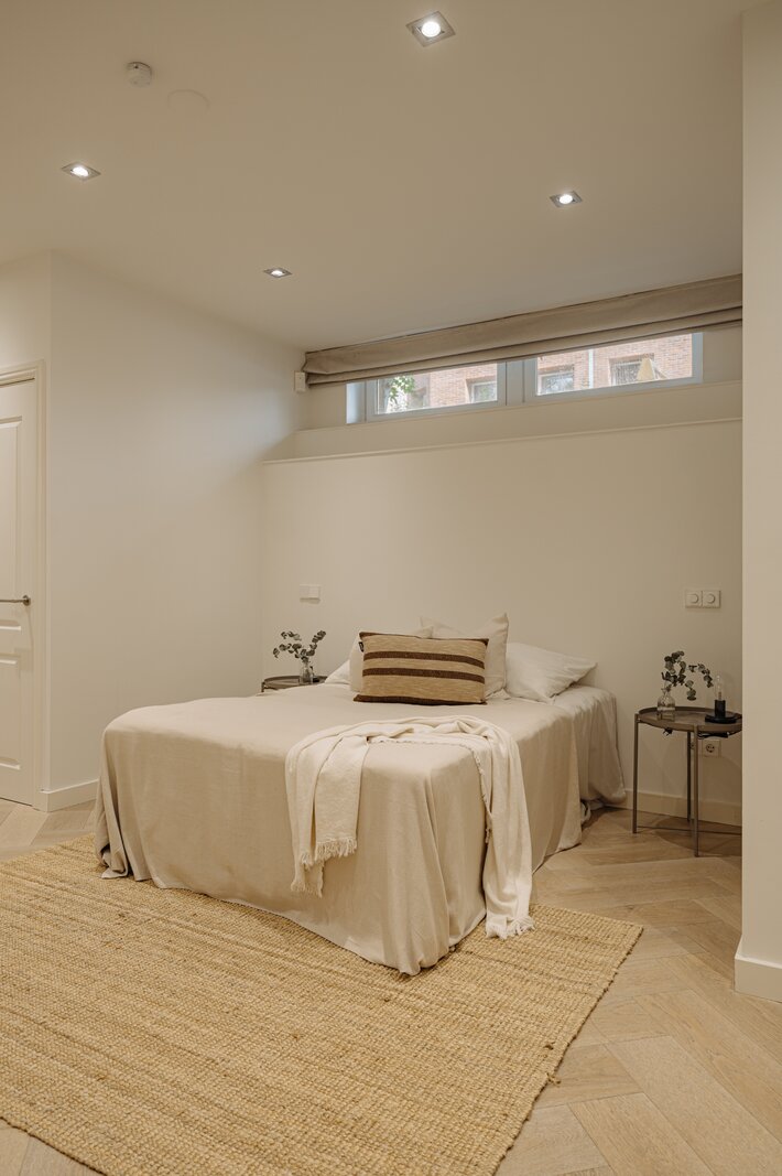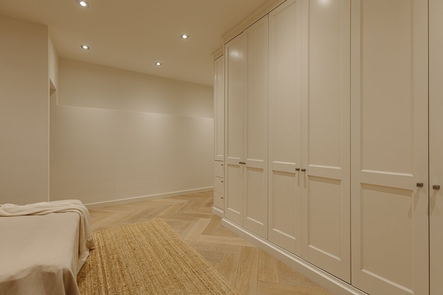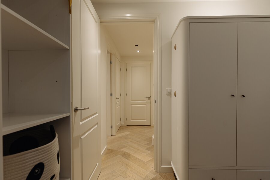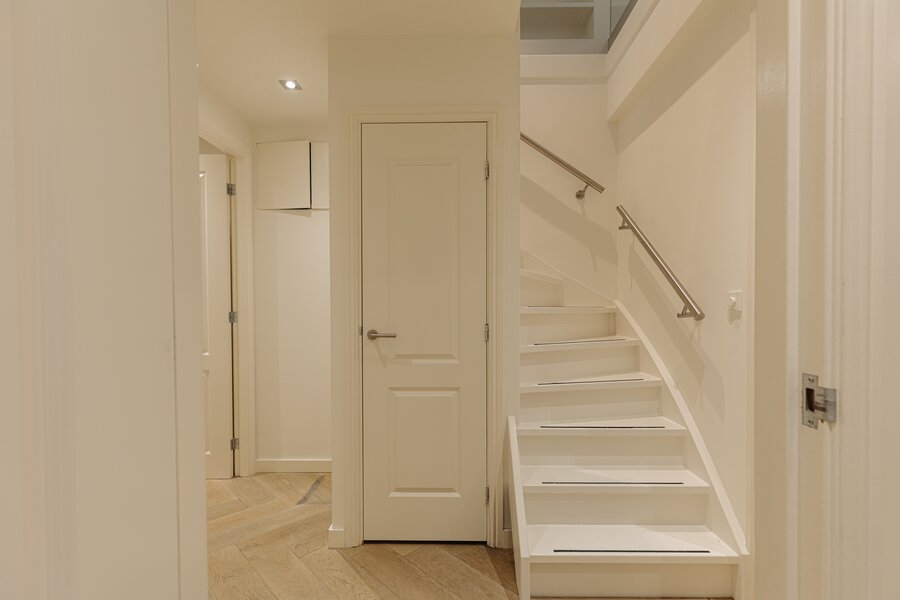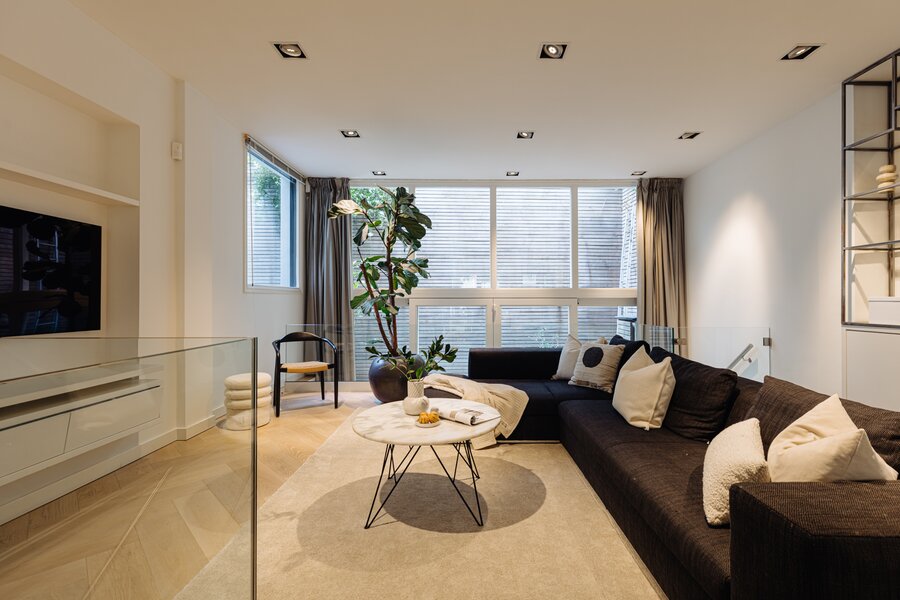 Entree via eigen voordeur op de begane grond. Bij binnenkomst valt direct de ruime en lichte sfeer op. De woonkamer wordt gekenmerkt door hoge plafonds, een elegante visgraatvloer en geïntegreerde inbouwverlichting. Aan de achterzijde bevindt zich toegang tot het terras (12m²).