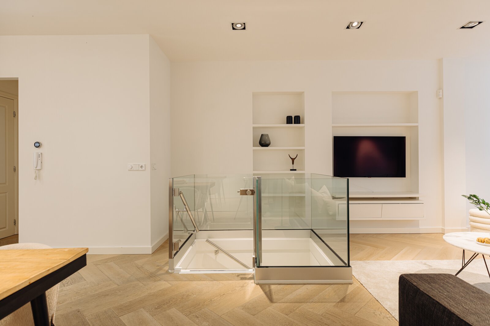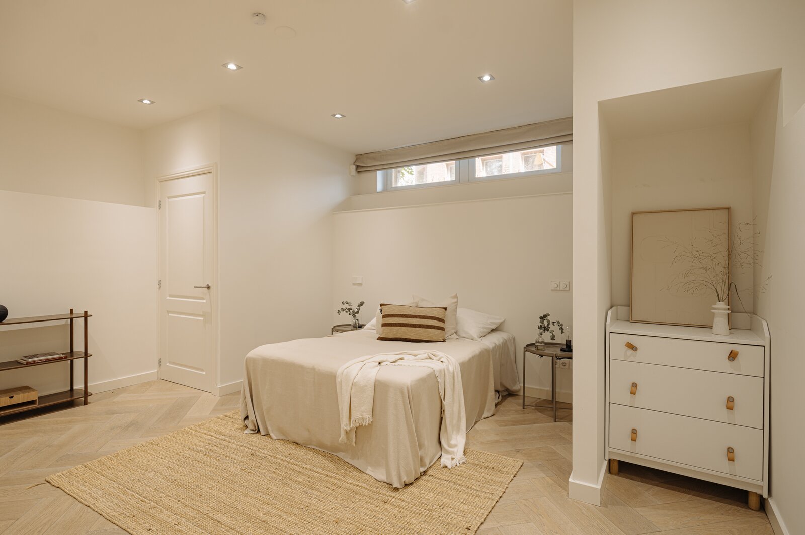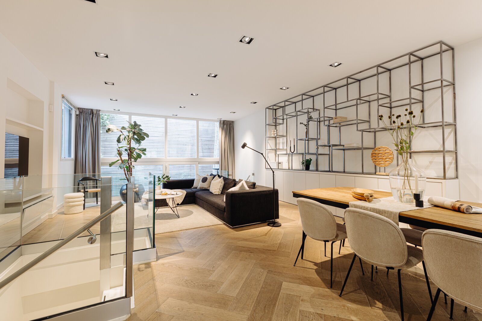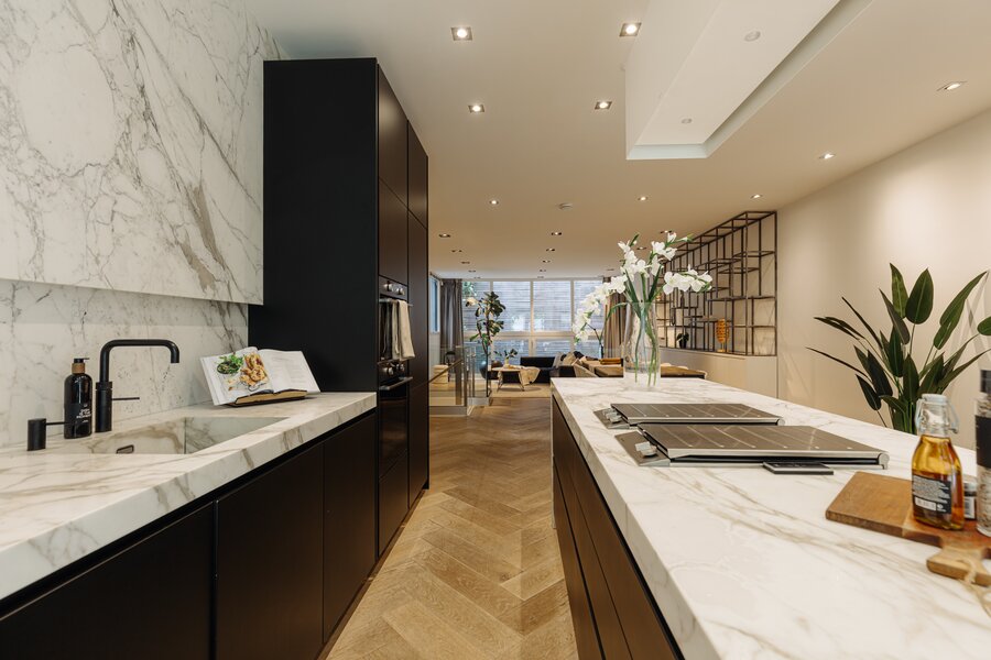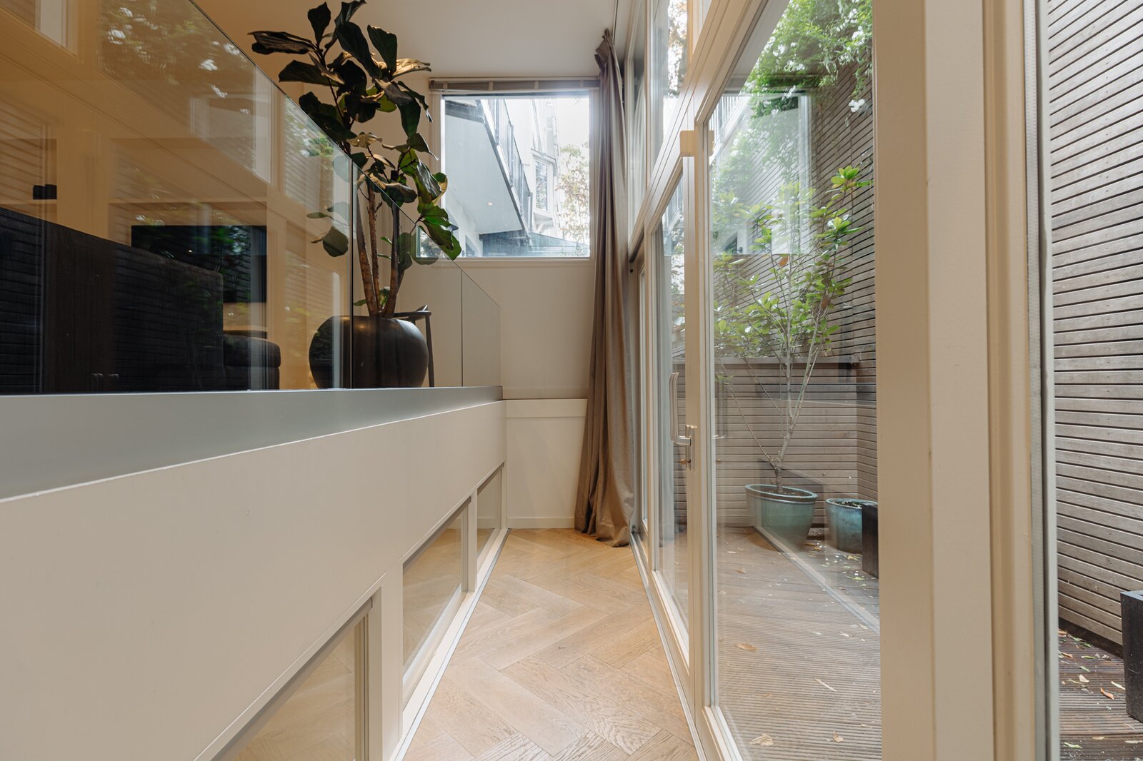 Entree via eigen voordeur op de begane grond. Bij binnenkomst valt direct de ruime en lichte sfeer op. De woonkamer wordt gekenmerkt door hoge plafonds, een elegante visgraatvloer en geïntegreerde inbouwverlichting. Aan de achterzijde bevindt zich toegang tot het terras (12m²).