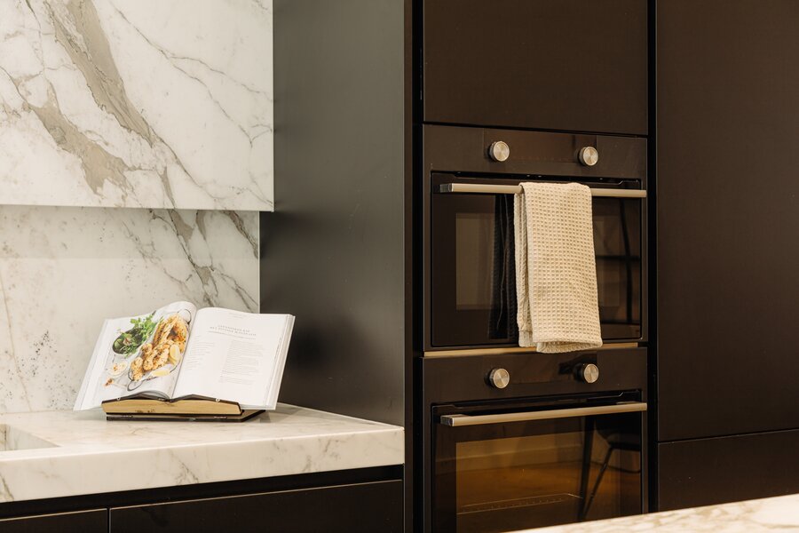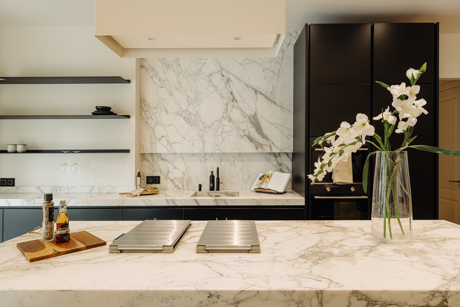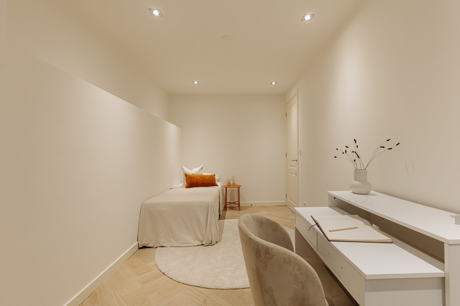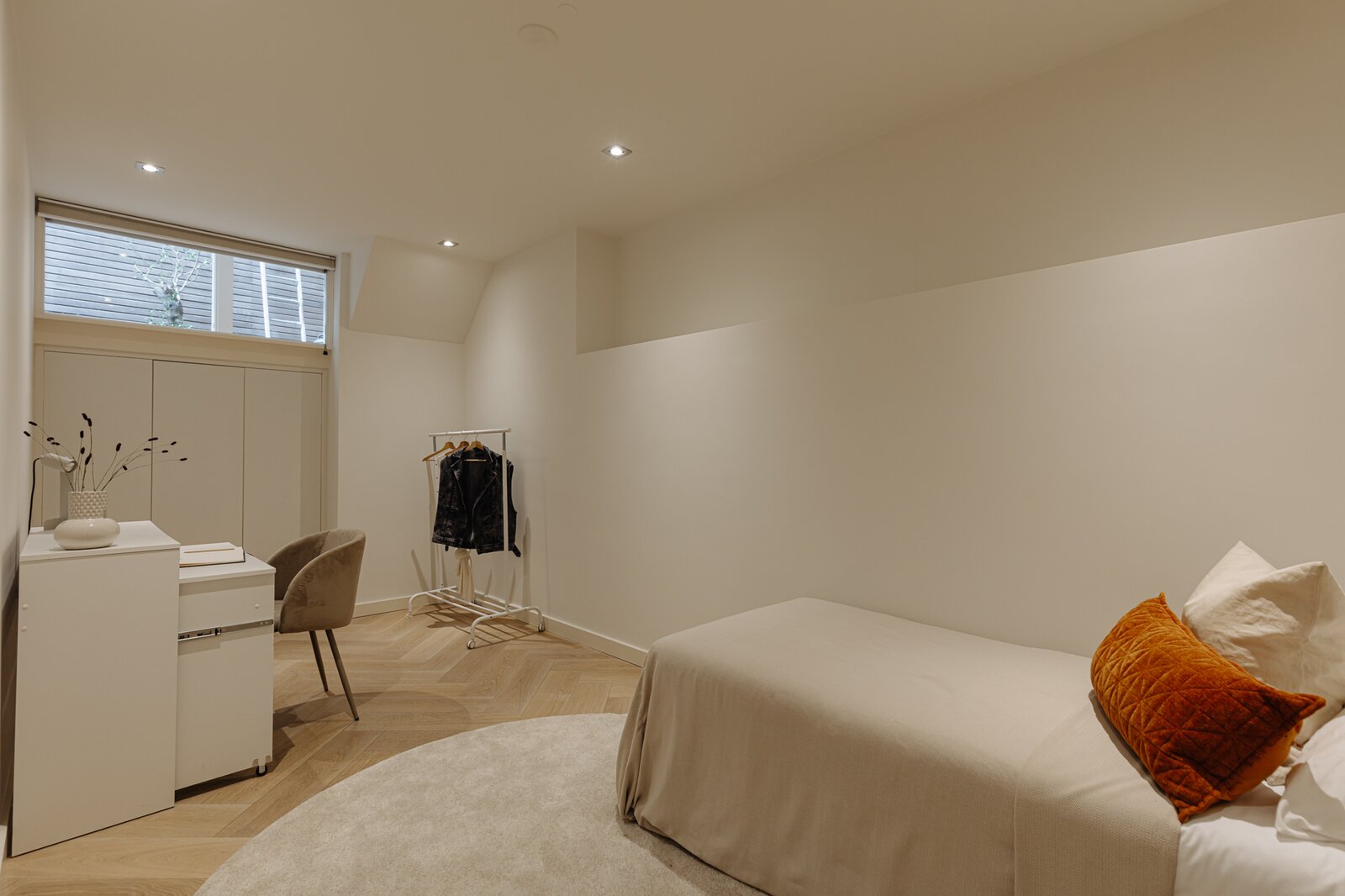 Entree via eigen voordeur op de begane grond. Bij binnenkomst valt direct de ruime en lichte sfeer op. De woonkamer wordt gekenmerkt door hoge plafonds, een elegante visgraatvloer en geïntegreerde inbouwverlichting. Aan de achterzijde bevindt zich toegang tot het terras (12m²).