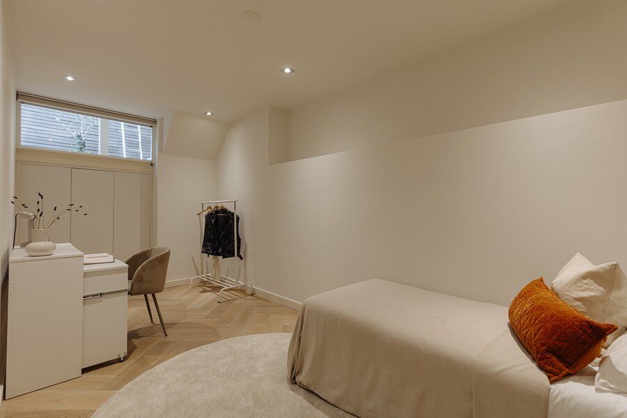 Een vaste trap leidt naar het souterrain, waar zich drie goed geproportioneerde slaapkamers bevinden. De royale hoofdslaapkamer ligt aan de voorzijde, terwijl de overige twee kamers uitstekend kunnen dienen als kinderkamer, werkkamer of logeerruimte.