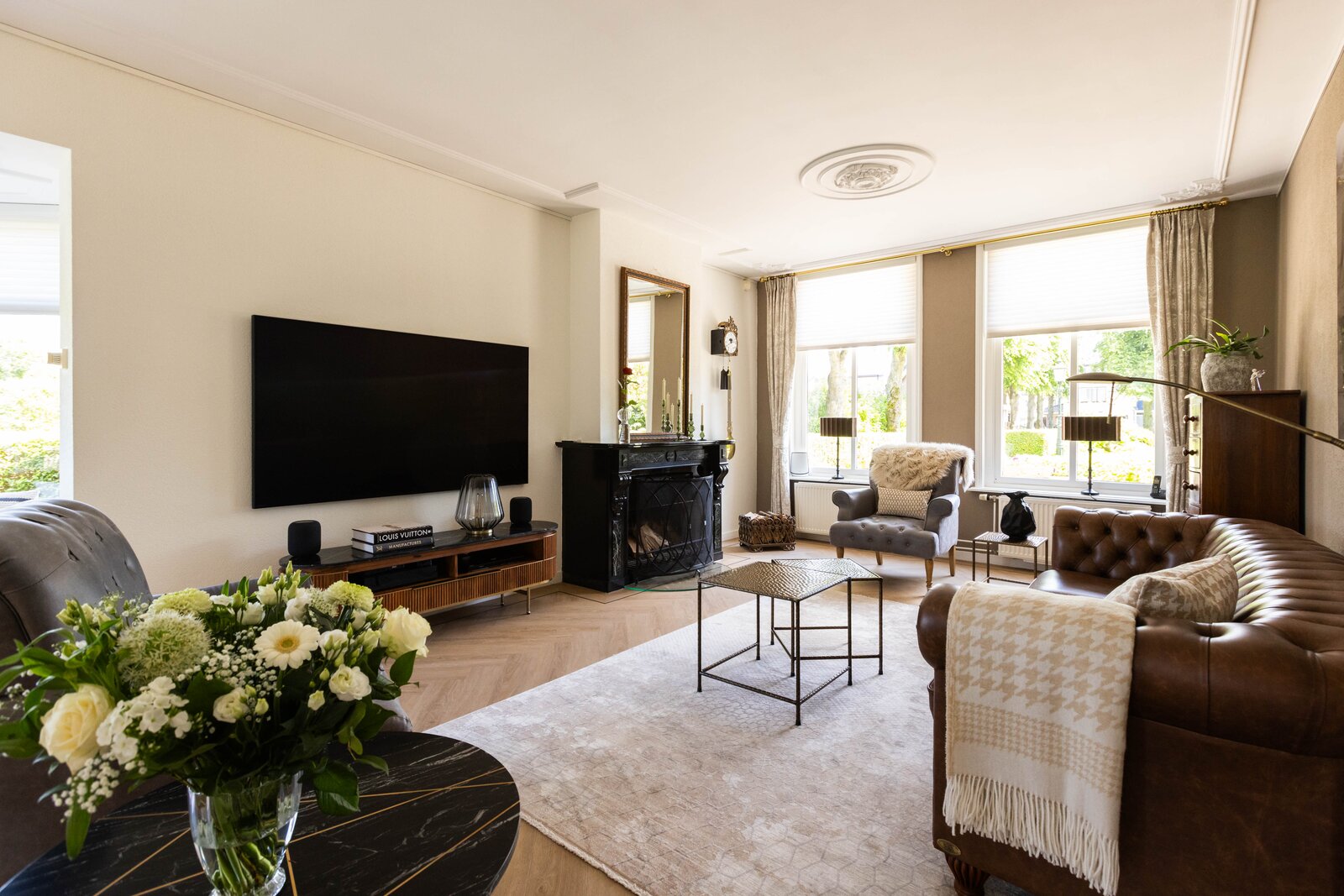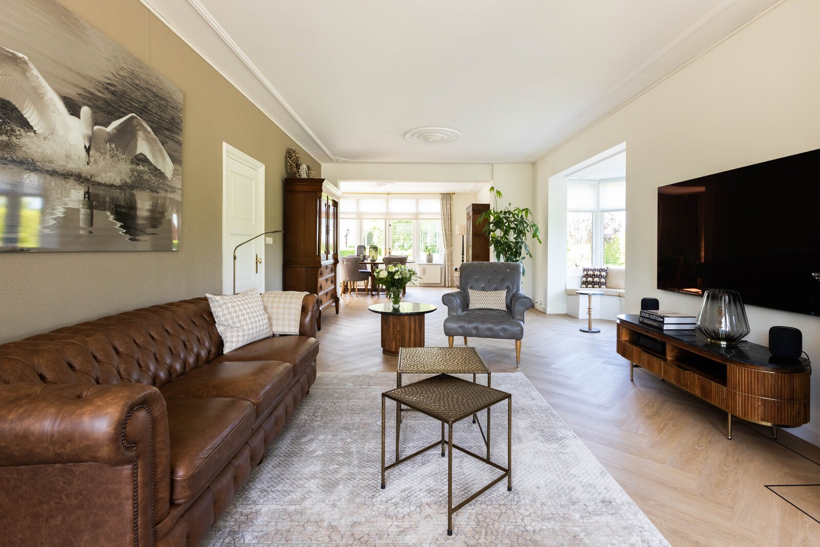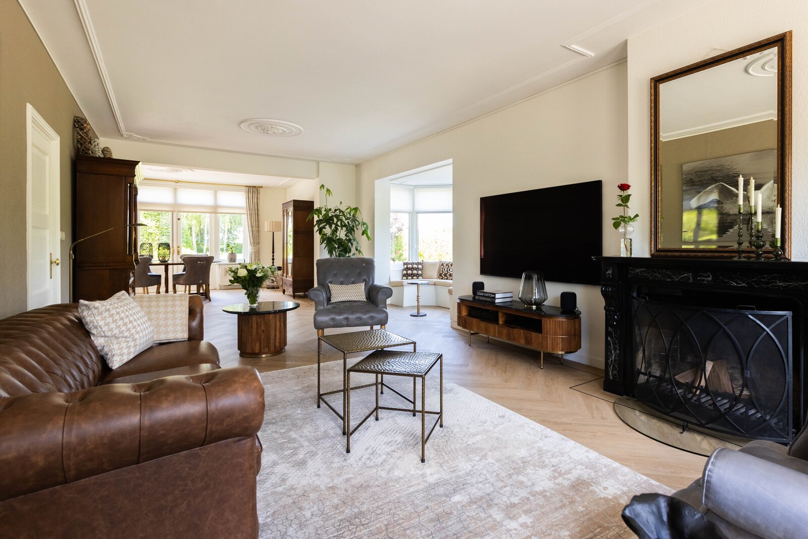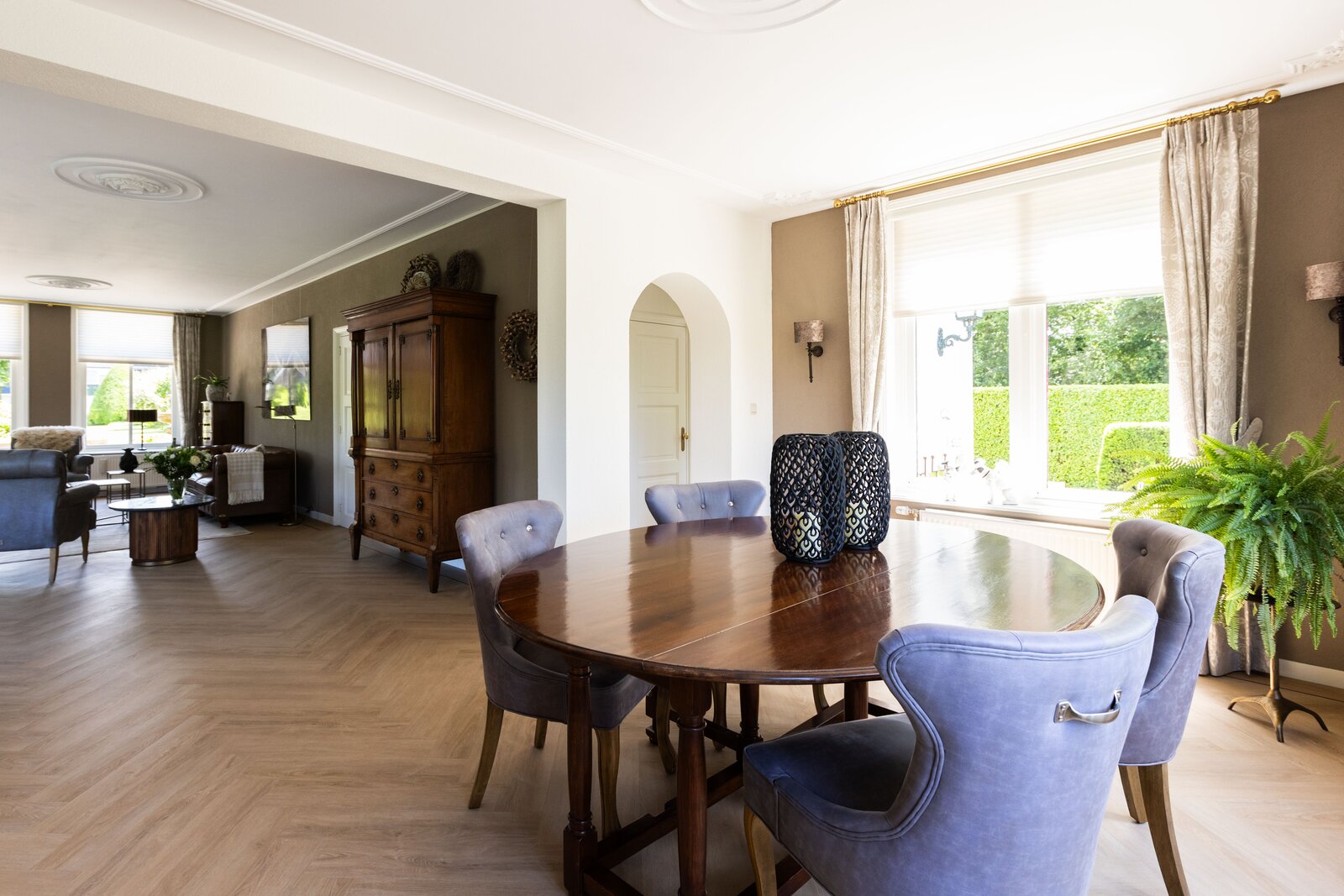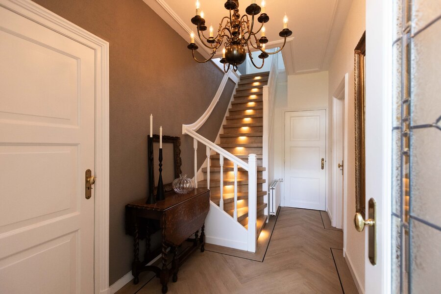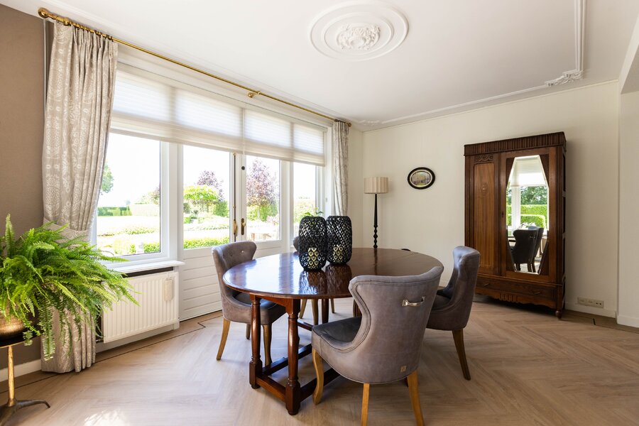 Via de entree komt u in de mooie en chique hal wat ook gelijk een juist beeld geeft van de gehele woning, chique, keurig en een hoogwaardige afwerking. Wanneer u in de hal staat wilt u eigenlijk maar één ding, de deur openen naar de prachtige woonkamer. En dan, wanneer u deze deur heeft geopend, zult u volop genieten van de mooie elementen zoals het hoge plafond, de erker en de hoeveelheid lichtinval wat u hier heeft. De woonkamer is over de gehele lengte van de begane grond waarbij er een leuk zithoekje is in de erker en de eetgelegenheid een prachtige plek heeft aan de achterzijde. De open haard met marmeren schouw maakt het plaatje compleet. Het maakt in deze woning eigenlijk niet uit waar u nu bent, ieder plekje heeft zijn eigen mooie uitzicht over de meer dan mooie tuin welke zich rondom de gehele woning bevindt.
