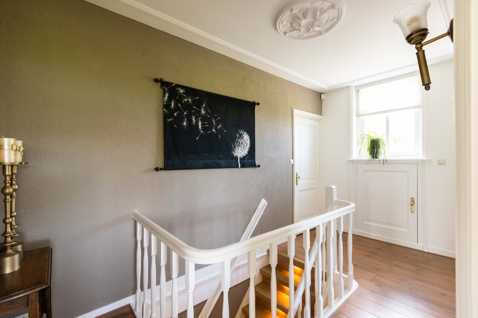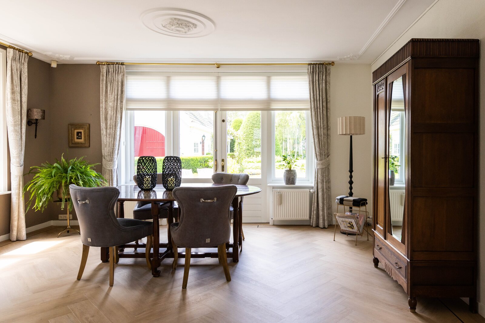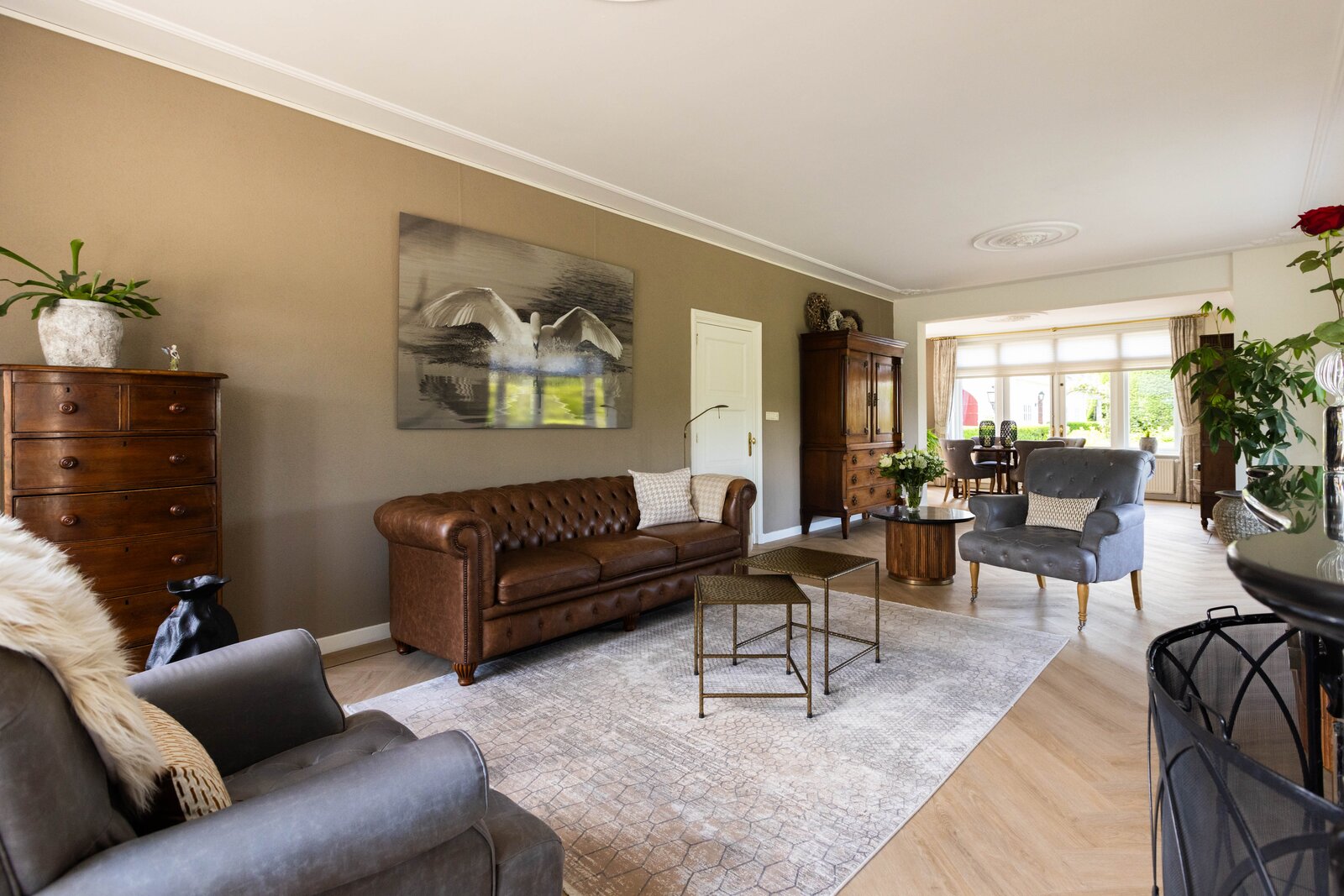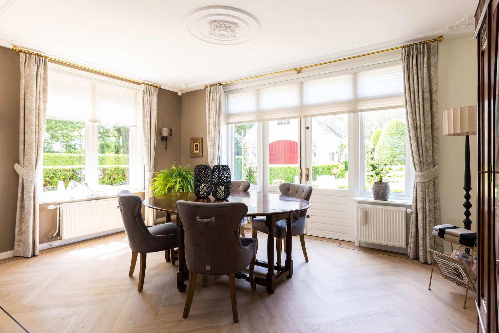 Via de entree komt u in de mooie en chique hal wat ook gelijk een juist beeld geeft van de gehele woning, chique, keurig en een hoogwaardige afwerking. Wanneer u in de hal staat wilt u eigenlijk maar één ding, de deur openen naar de prachtige woonkamer. En dan, wanneer u deze deur heeft geopend, zult u volop genieten van de mooie elementen zoals het hoge plafond, de erker en de hoeveelheid lichtinval wat u hier heeft. De woonkamer is over de gehele lengte van de begane grond waarbij er een leuk zithoekje is in de erker en de eetgelegenheid een prachtige plek heeft aan de achterzijde. De open haard met marmeren schouw maakt het plaatje compleet. Het maakt in deze woning eigenlijk niet uit waar u nu bent, ieder plekje heeft zijn eigen mooie uitzicht over de meer dan mooie tuin welke zich rondom de gehele woning bevindt.