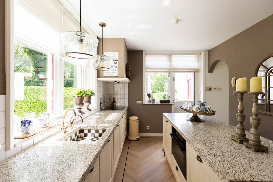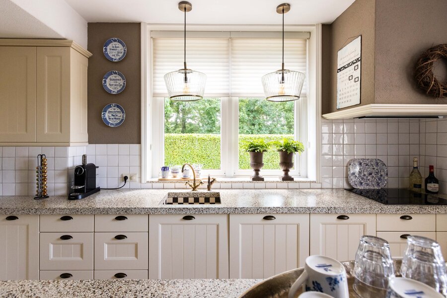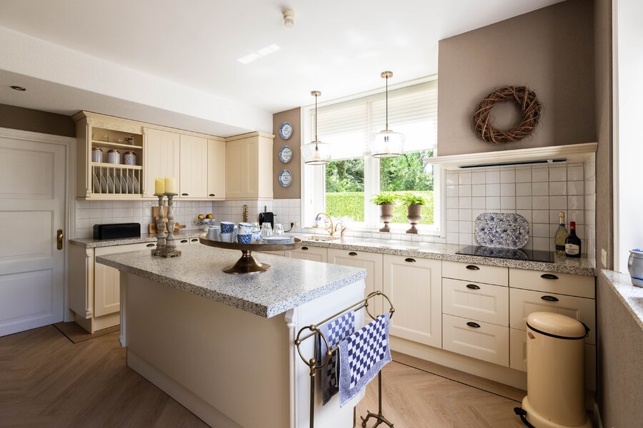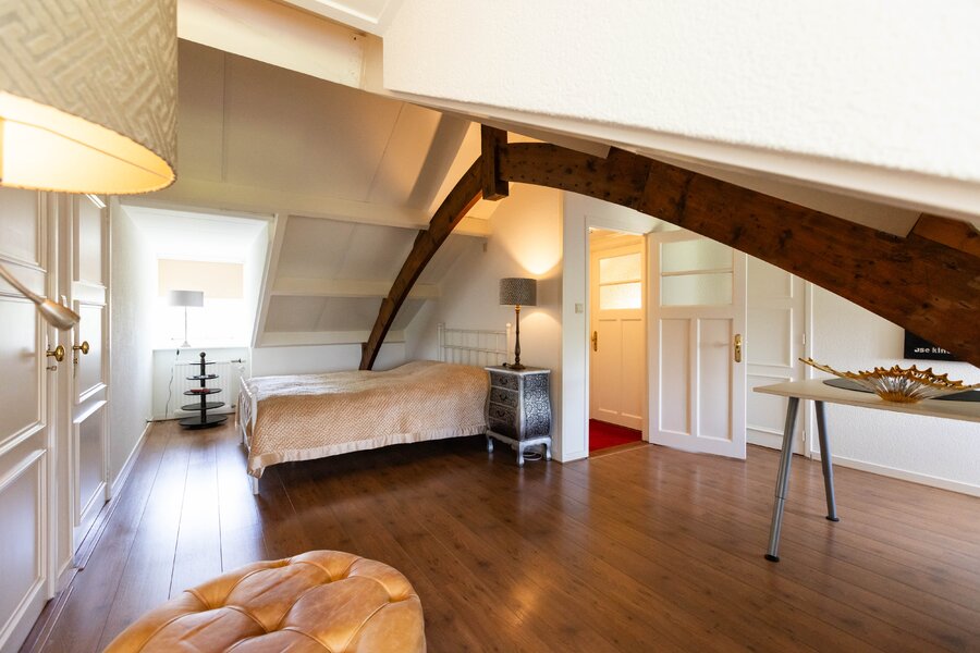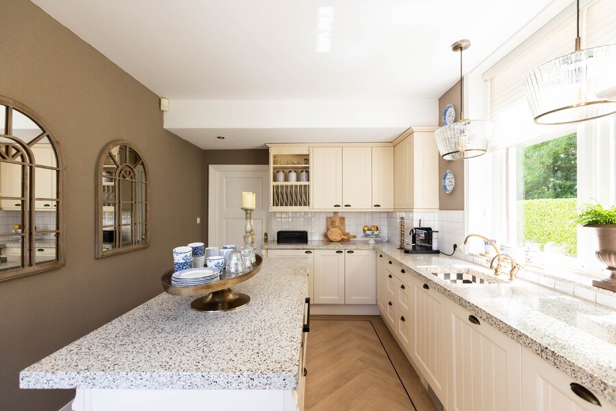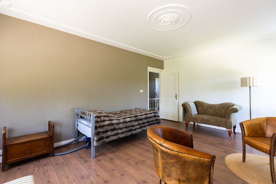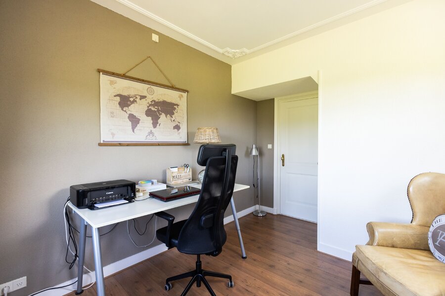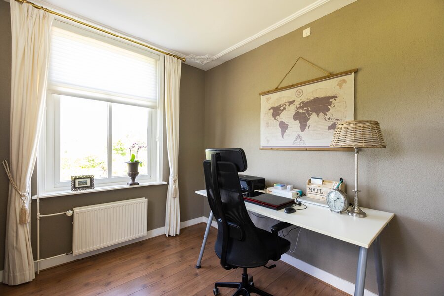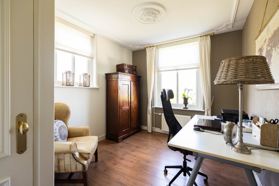 De woonkeuken is in stijl afgewerkt met veel kastruimte, een granieten blad en inbouwapparatuur als een koelkast, vriezer, vaatwasser, heteluchtoven en inductie kookplaat. Passend bij het statige karakter van een villa is de separate kamer welke zich aan de andere zijde van de hal bevindt. Verschillende benamingen als een heuse sigarenkamer, studeerkamer of zitkamer kunnen hiervoor bedacht worden. Ook in deze ruimte is het woord statig weer op zijn plaats. De gashaard met sierlijke schouw ontbreekt ook in deze ruimte niet.