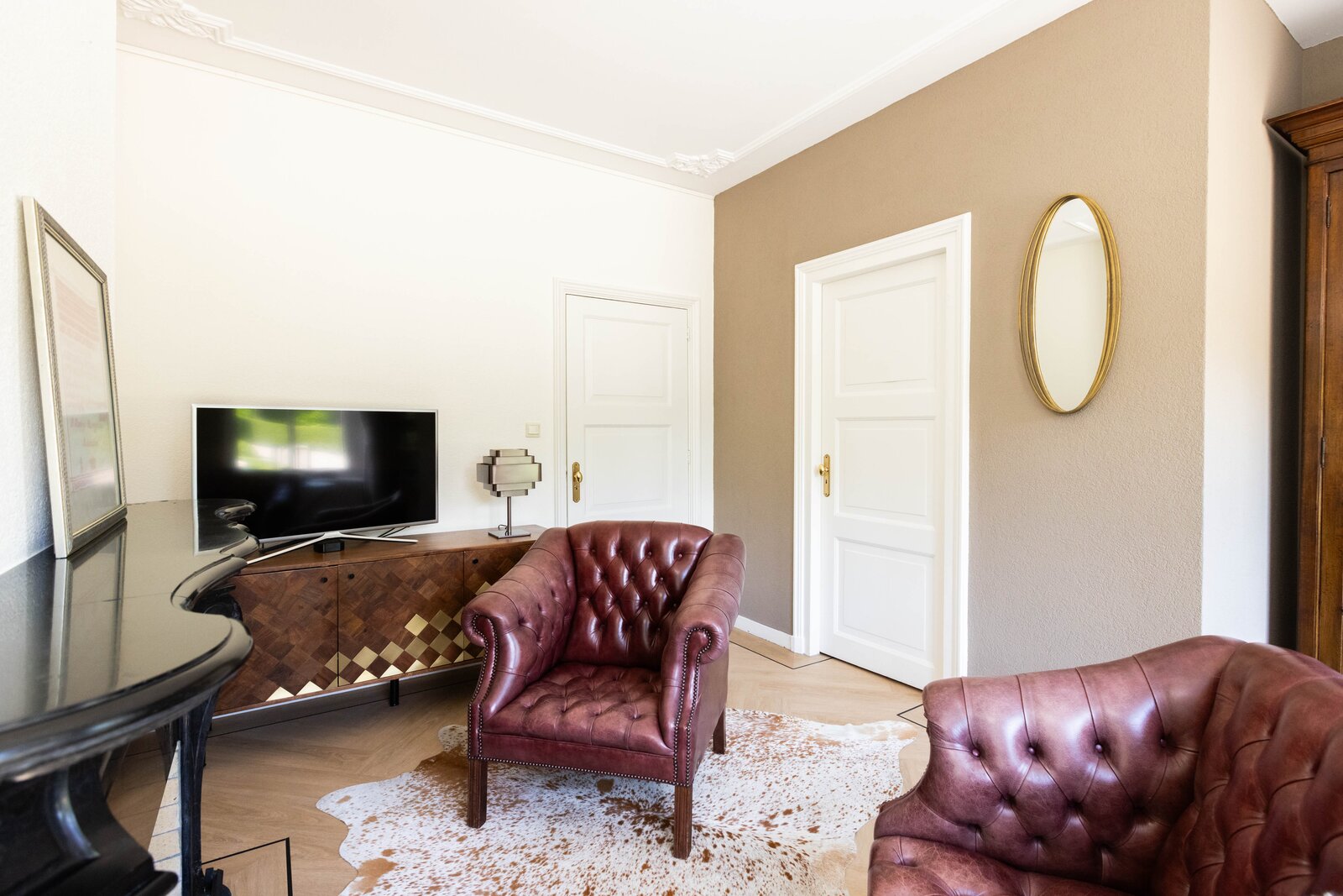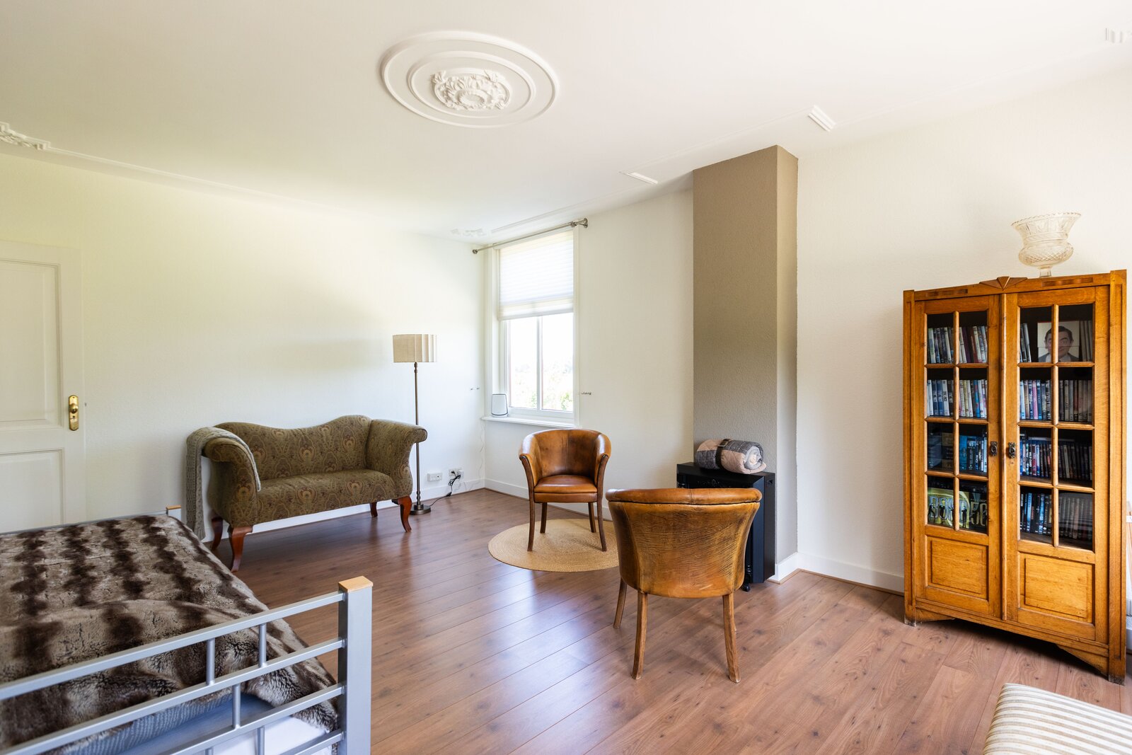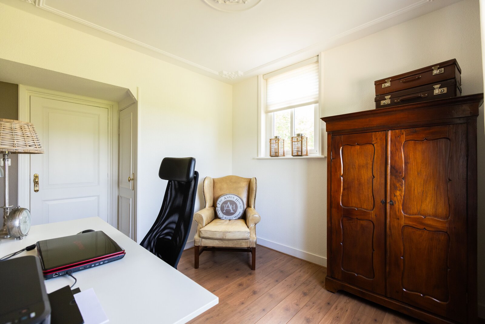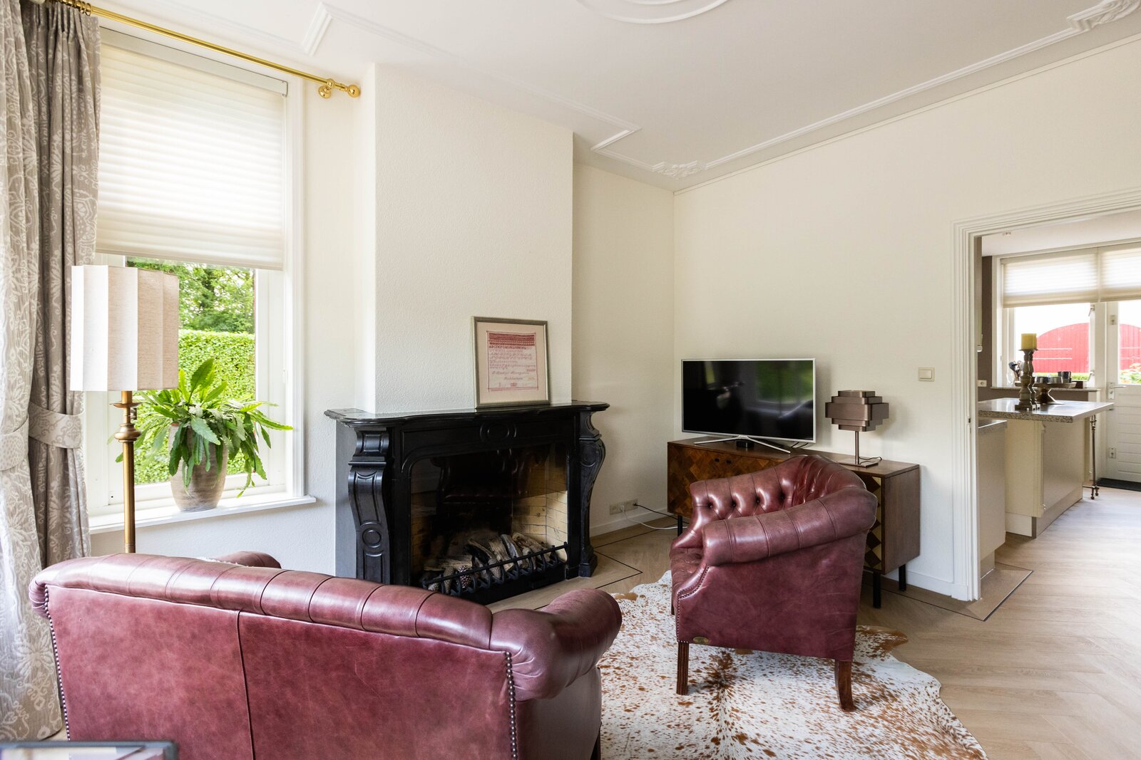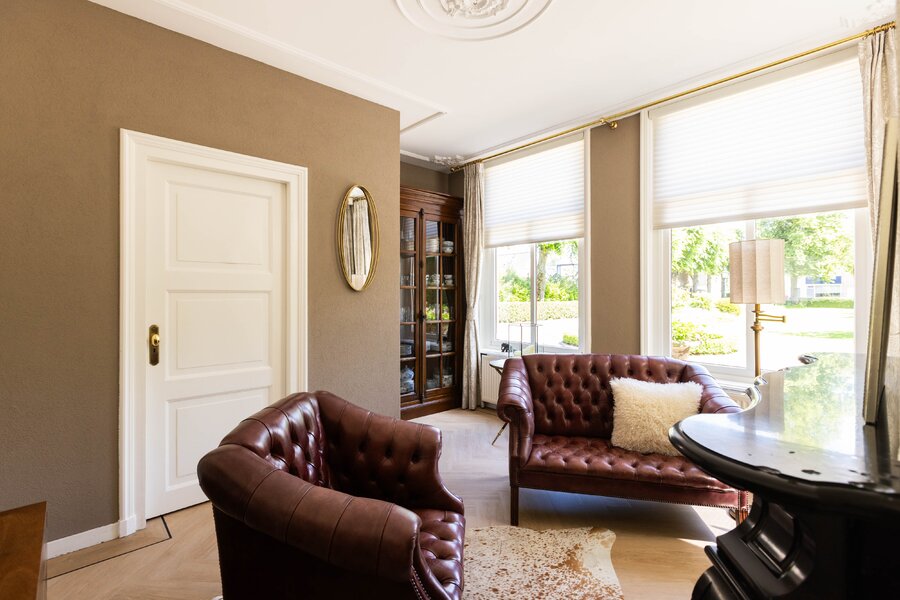 De woonkeuken is in stijl afgewerkt met veel kastruimte, een granieten blad en inbouwapparatuur als een koelkast, vriezer, vaatwasser, heteluchtoven en inductie kookplaat. Passend bij het statige karakter van een villa is de separate kamer welke zich aan de andere zijde van de hal bevindt. Verschillende benamingen als een heuse sigarenkamer, studeerkamer of zitkamer kunnen hiervoor bedacht worden. Ook in deze ruimte is het woord statig weer op zijn plaats. De gashaard met sierlijke schouw ontbreekt ook in deze ruimte niet.