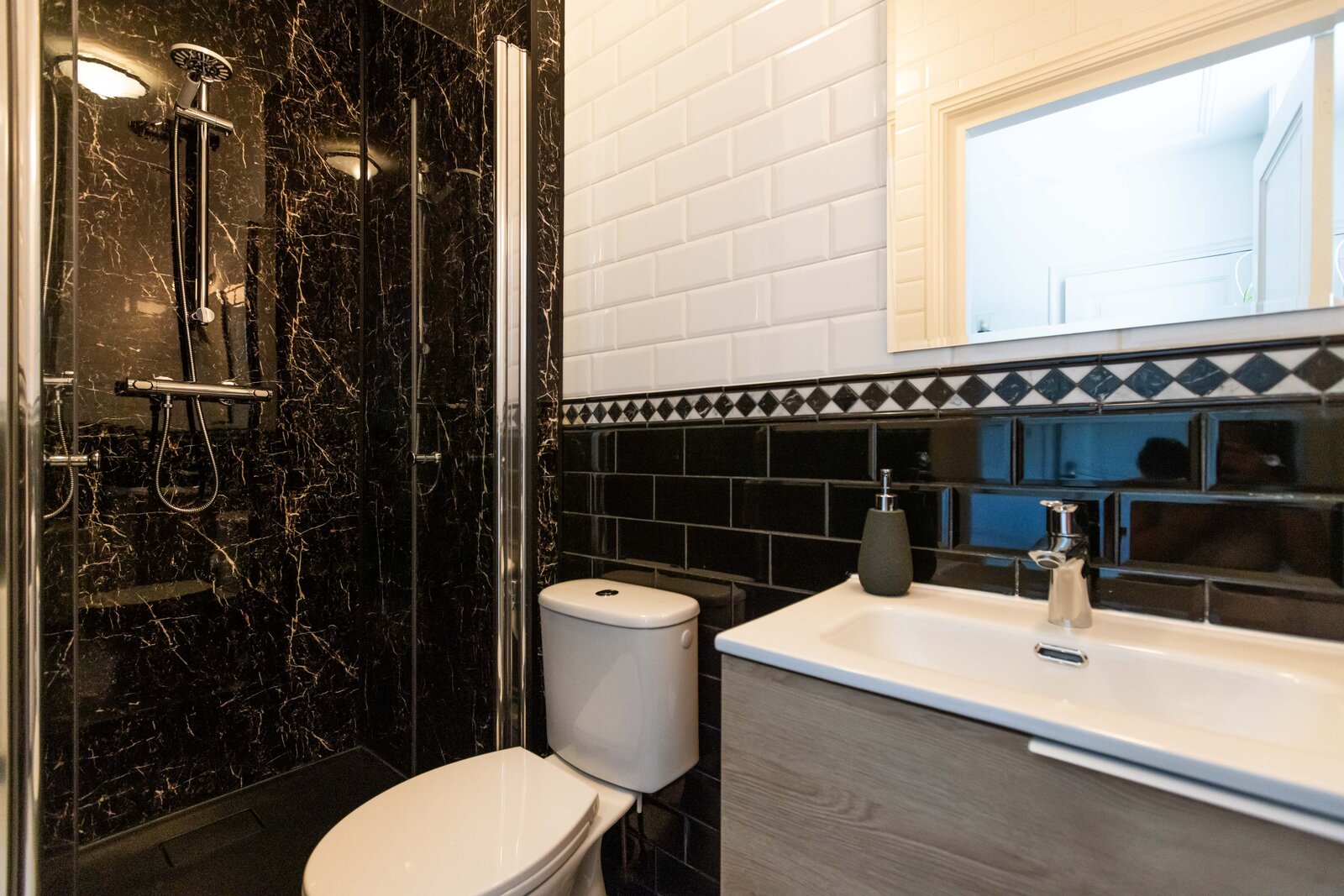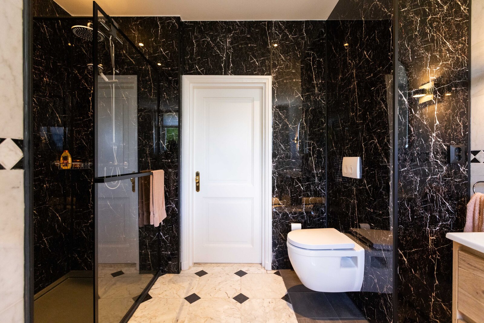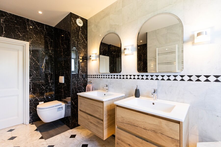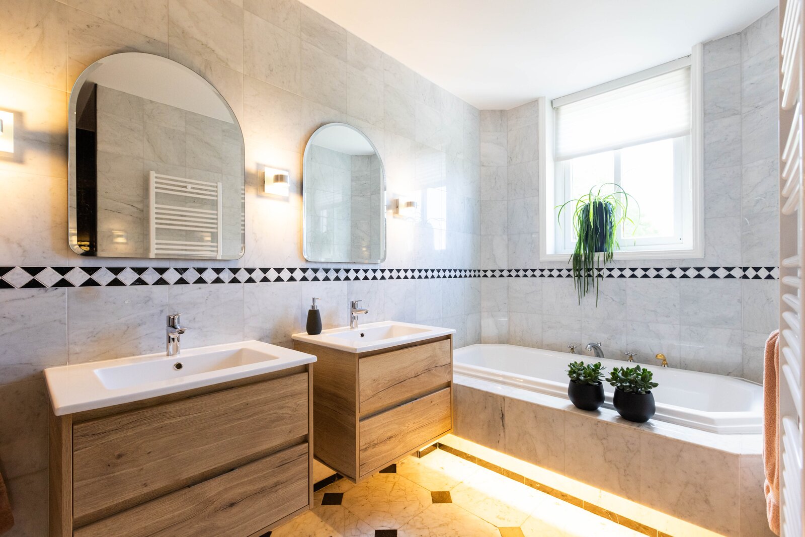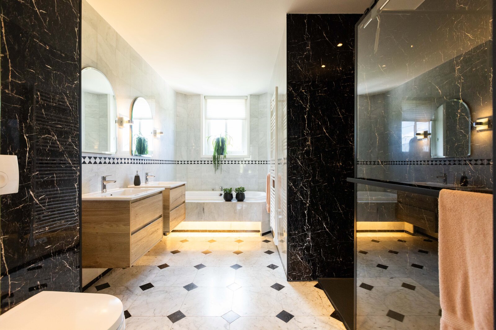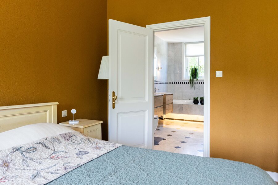 Op de 1e verdieping zijn er 3 slaapkamers en 2 badkamers. De royale master bedroom beschikt over een aangrenzende badkamer met inloopdouche, zwevend toilet, ligbad en dubbele wastafel met meubel. De 2 andere slaapkamers zijn eveneens van een prima afmeting waarbij er 1 slaapkamer beschikt over een vaste kast. De 2e badkamer is ingericht met een douche, toilet en wastafel met meubel.