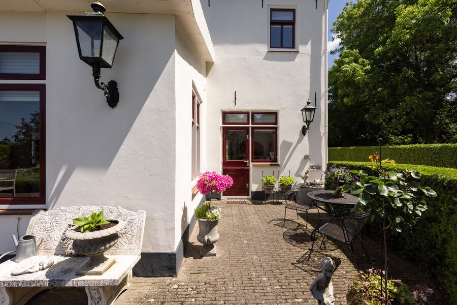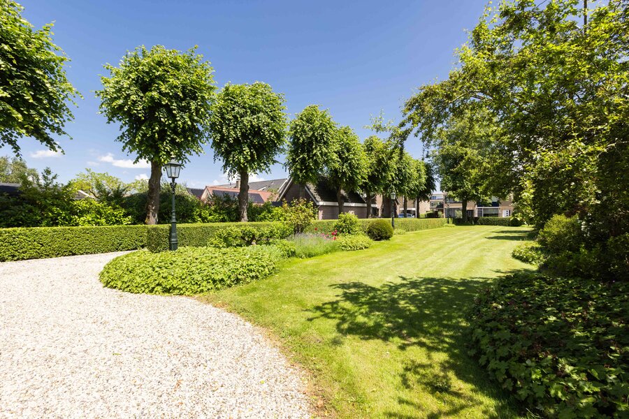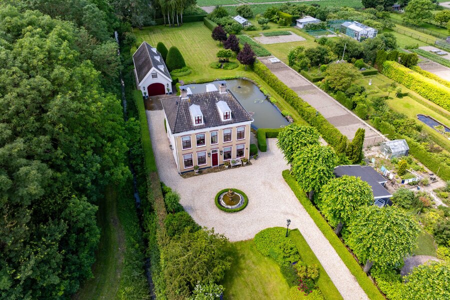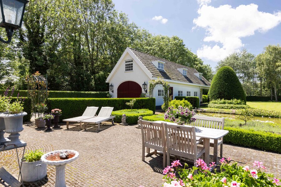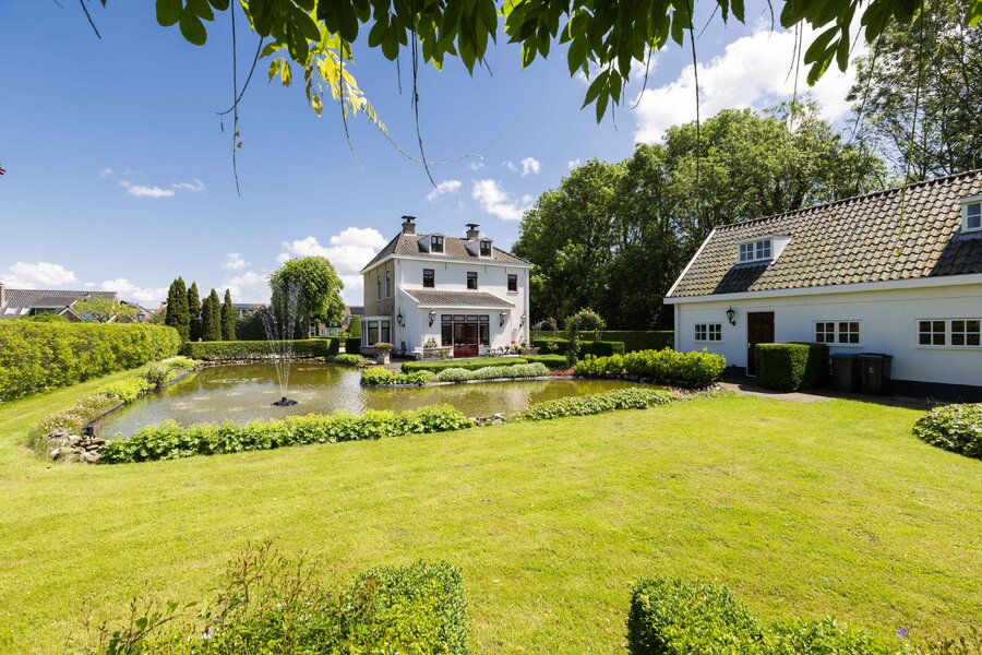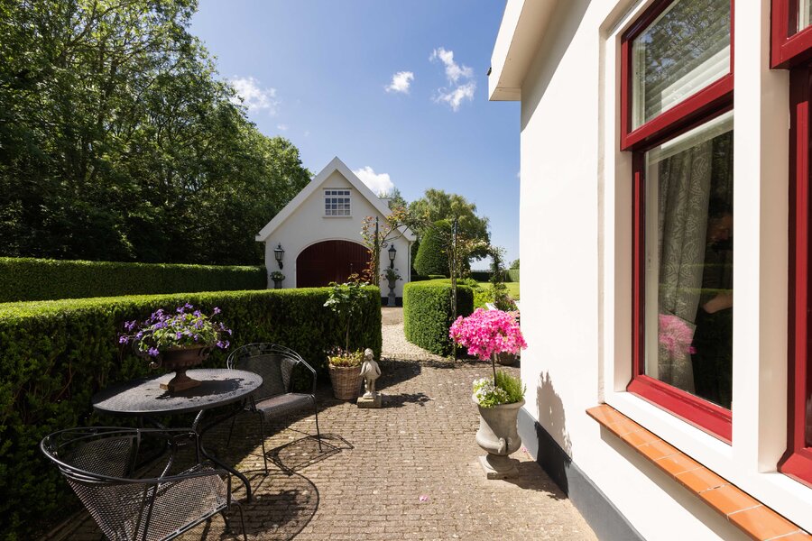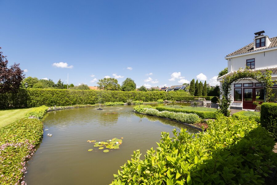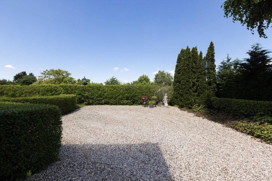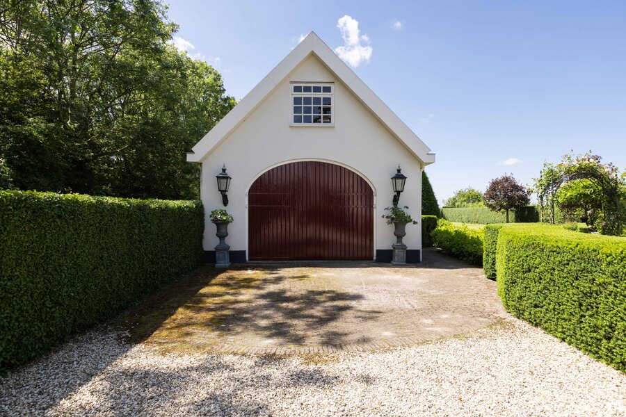 De prachtige tuin is keurig onderhouden en aangelegd met de mooie vijver als middelpunt. Het voormalige koetshuis is zoals al eerder is aangegeven momenteel in gebruik als garage. Het is mogelijk om hier meerdere auto’s te stallen. Boven deze ruimte is er een volwaardige zolder en de garage is toegankelijk via elektrische en op afstand bedienbare houten deuren. De verschillende bordessen zorgen voor mooie kleurscharkeringen en de privacy die u hier ervaart is werkelijk fantastisch. De vogeltjes die fluiten, de rust en het vrije uitzicht zorgen er voor dat u weer in dat sprookje terechtkomt.