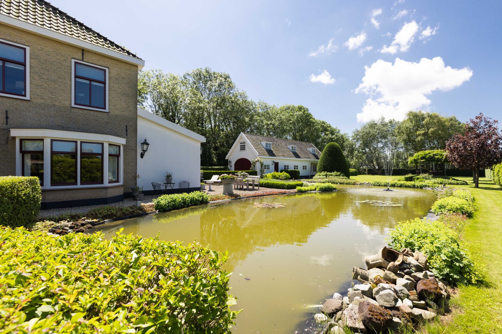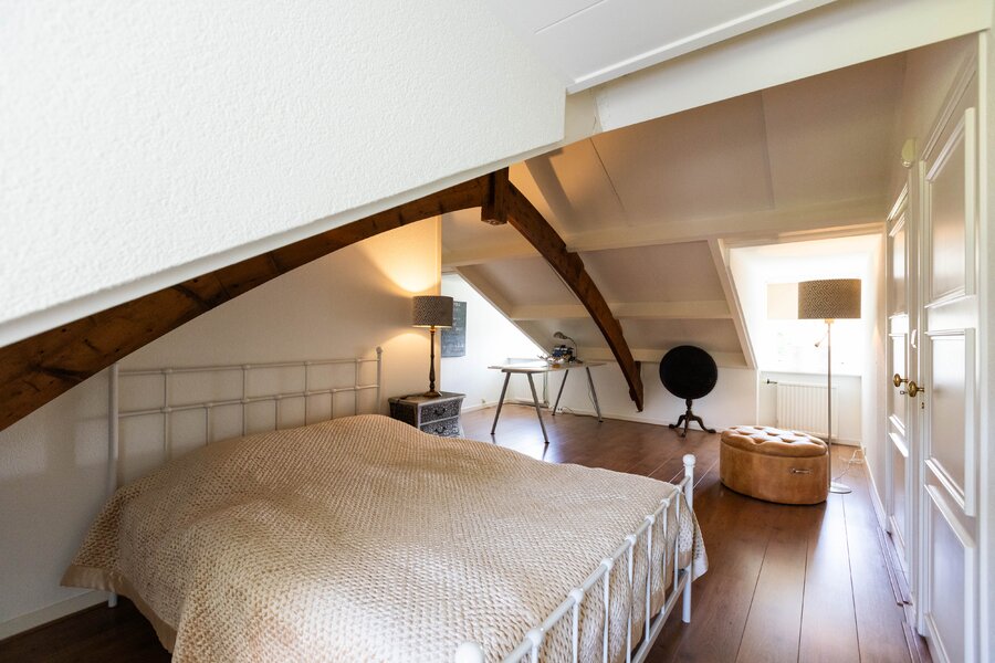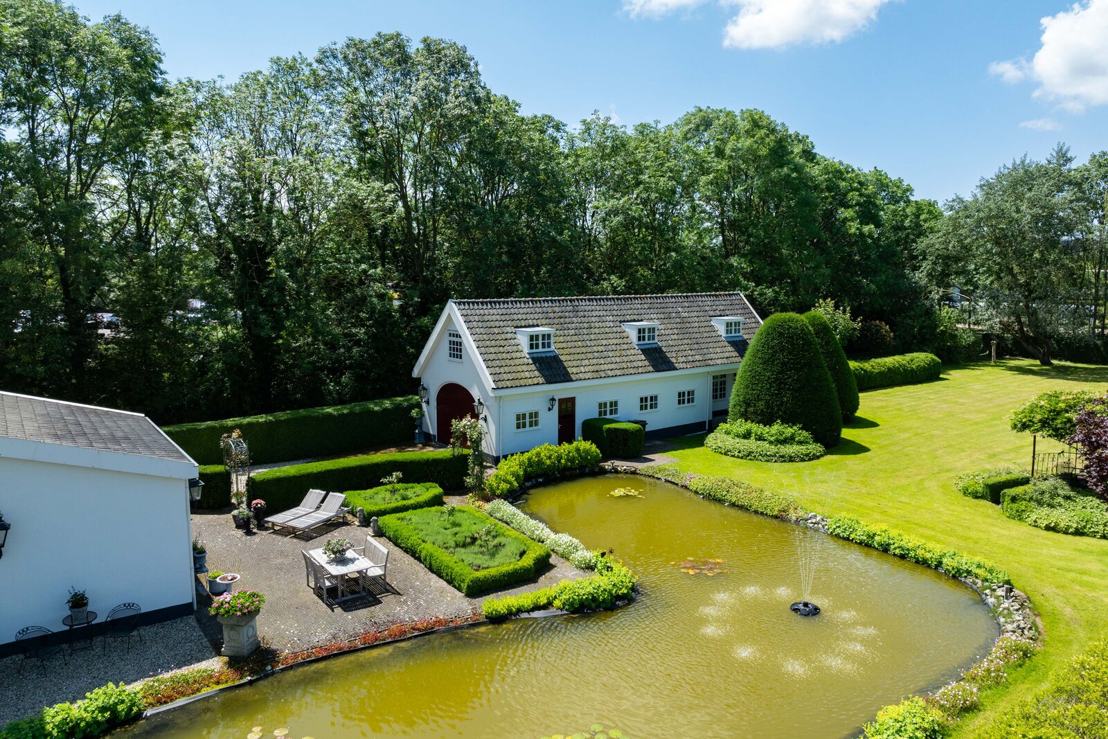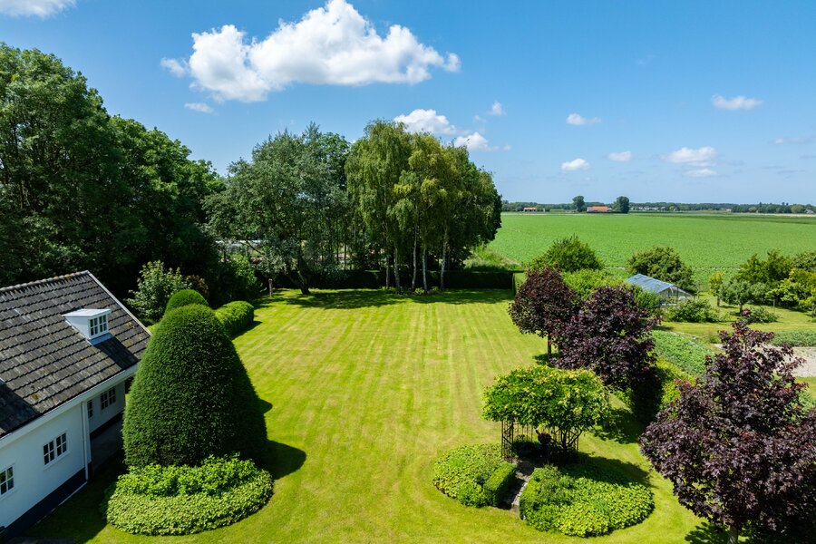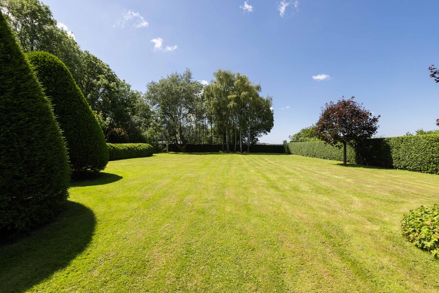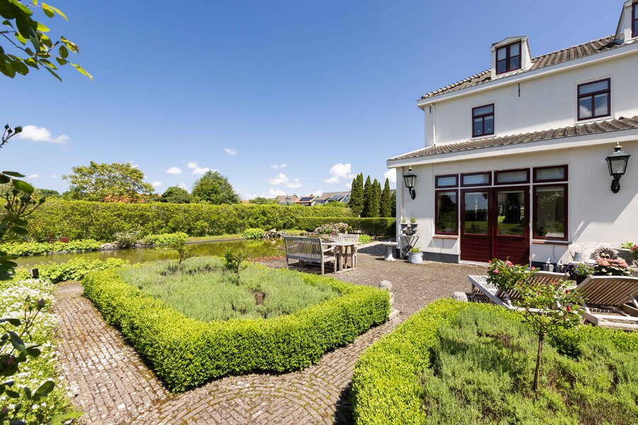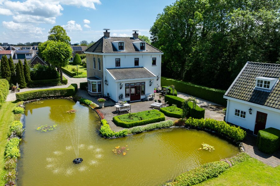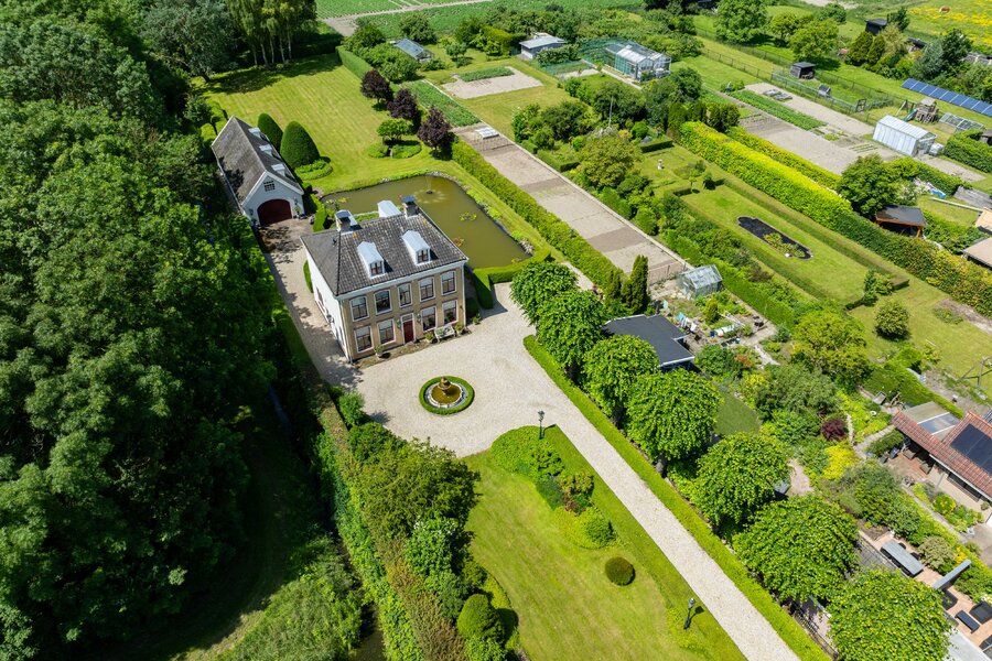 De prachtige tuin is keurig onderhouden en aangelegd met de mooie vijver als middelpunt. Het voormalige koetshuis is zoals al eerder is aangegeven momenteel in gebruik als garage. Het is mogelijk om hier meerdere auto’s te stallen. Boven deze ruimte is er een volwaardige zolder en de garage is toegankelijk via elektrische en op afstand bedienbare houten deuren. De verschillende bordessen zorgen voor mooie kleurscharkeringen en de privacy die u hier ervaart is werkelijk fantastisch. De vogeltjes die fluiten, de rust en het vrije uitzicht zorgen er voor dat u weer in dat sprookje terechtkomt.