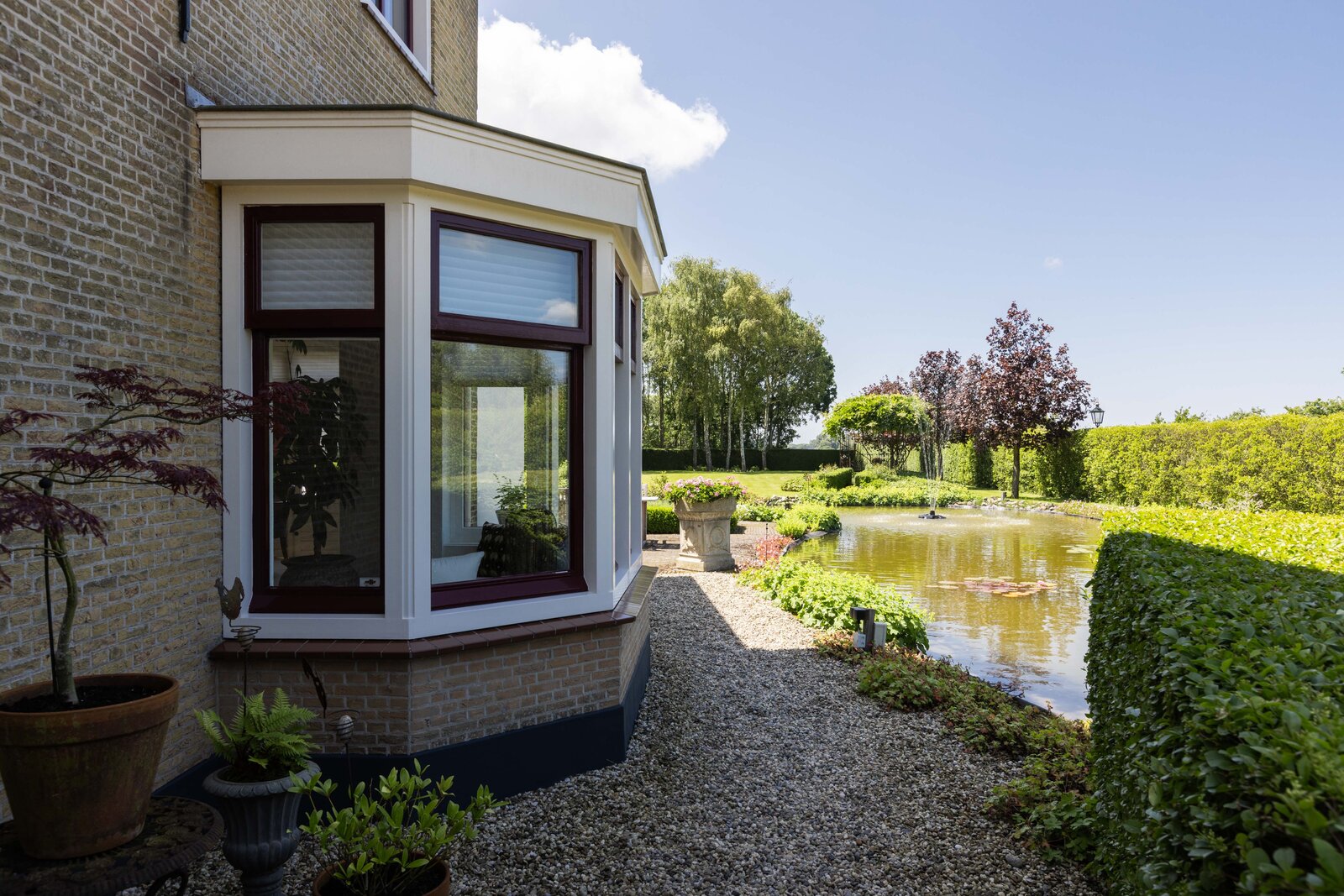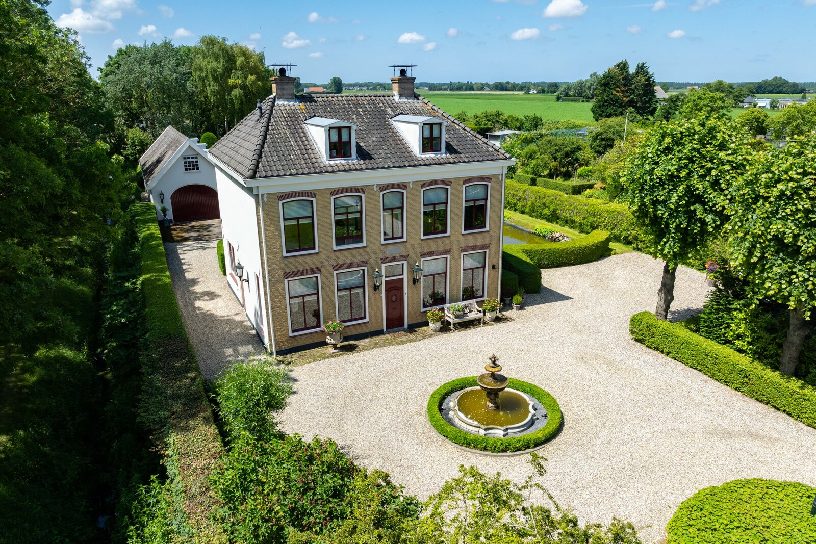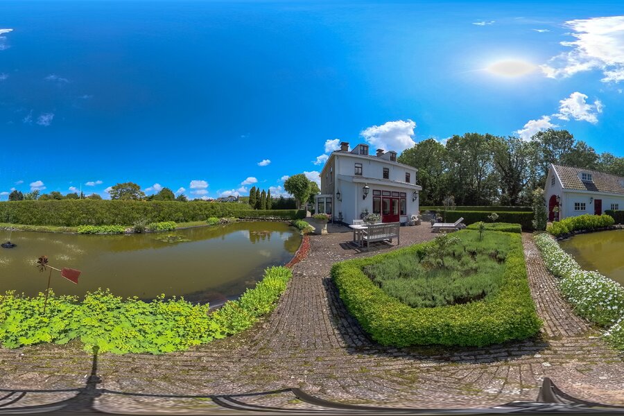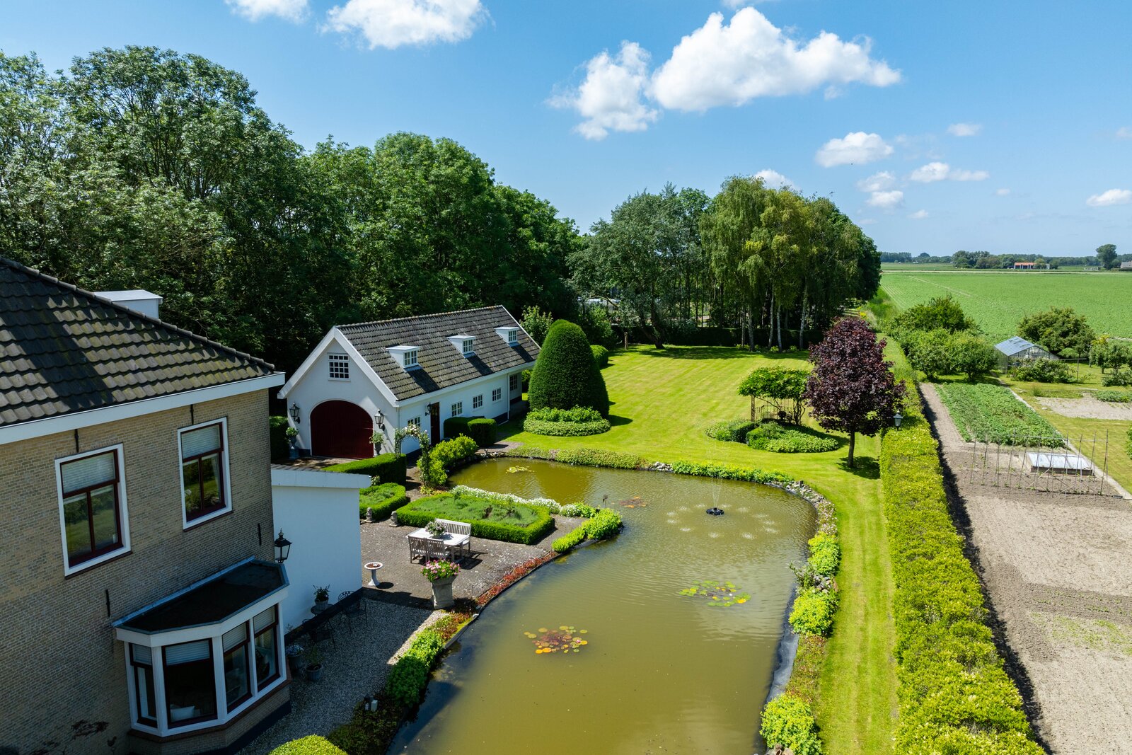 De prachtige tuin is keurig onderhouden en aangelegd met de mooie vijver als middelpunt. Het voormalige koetshuis is zoals al eerder is aangegeven momenteel in gebruik als garage. Het is mogelijk om hier meerdere auto’s te stallen. Boven deze ruimte is er een volwaardige zolder en de garage is toegankelijk via elektrische en op afstand bedienbare houten deuren. De verschillende bordessen zorgen voor mooie kleurscharkeringen en de privacy die u hier ervaart is werkelijk fantastisch. De vogeltjes die fluiten, de rust en het vrije uitzicht zorgen er voor dat u weer in dat sprookje terechtkomt.