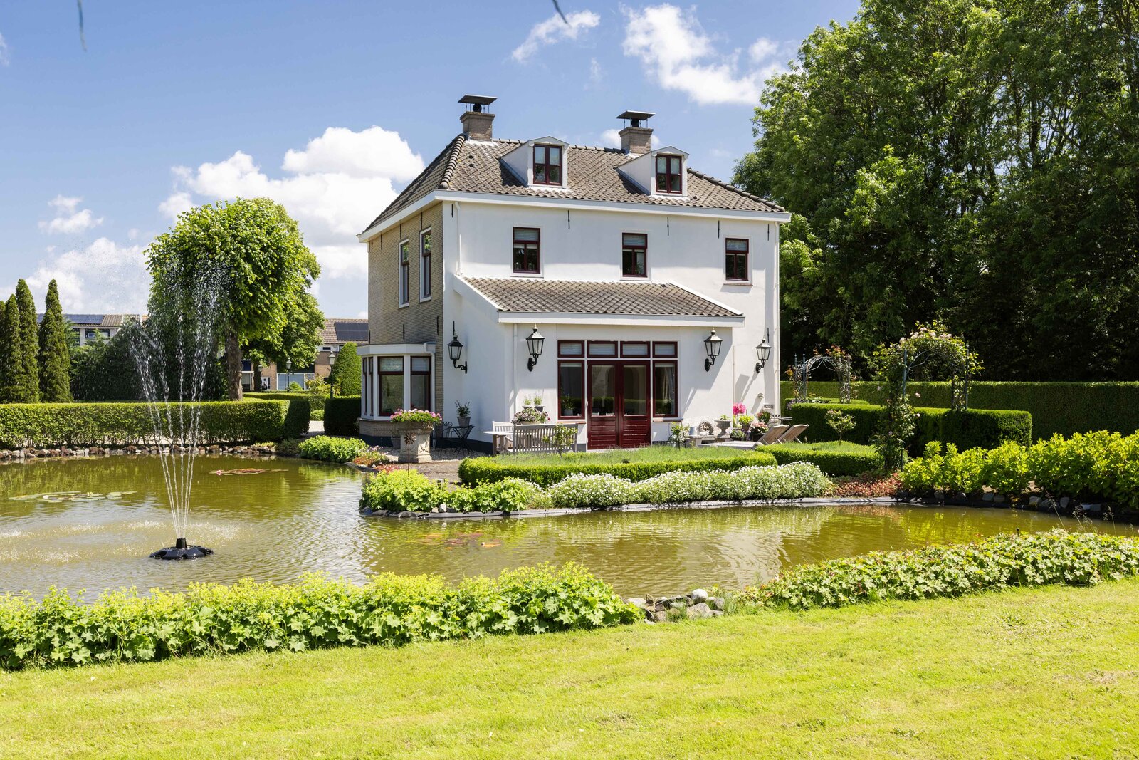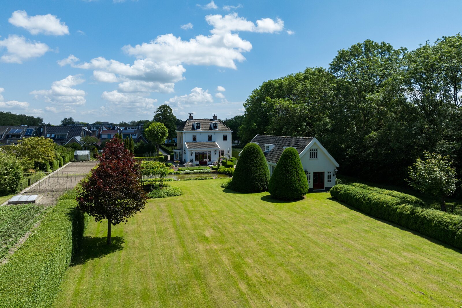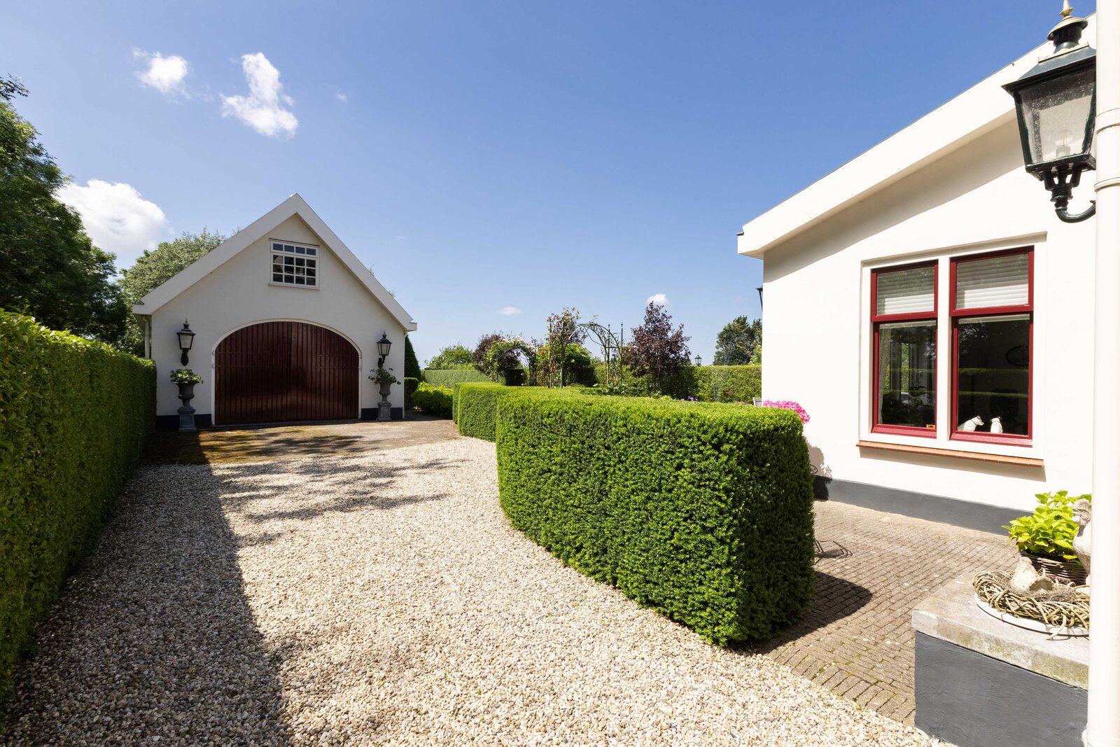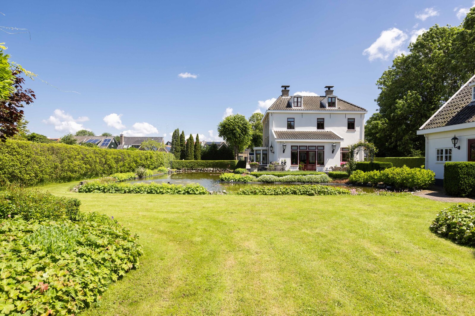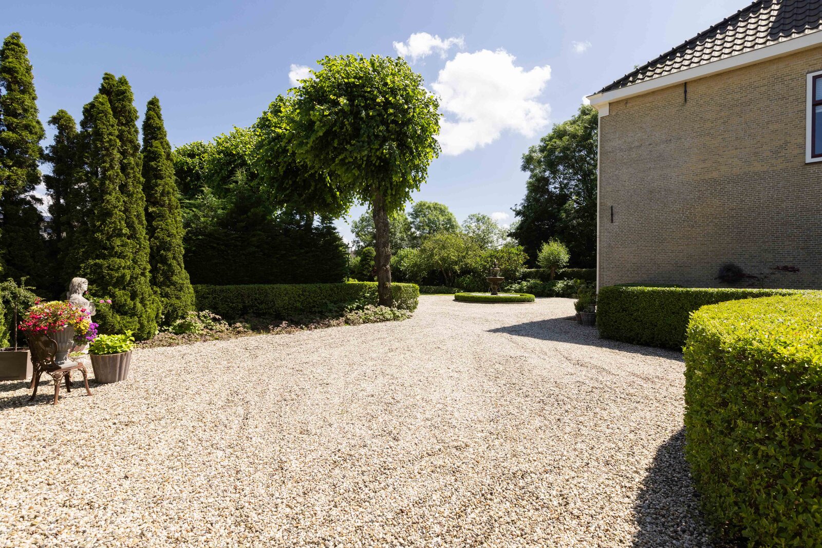 De prachtige tuin is keurig onderhouden en aangelegd met de mooie vijver als middelpunt. Het voormalige koetshuis is zoals al eerder is aangegeven momenteel in gebruik als garage. Het is mogelijk om hier meerdere auto’s te stallen. Boven deze ruimte is er een volwaardige zolder en de garage is toegankelijk via elektrische en op afstand bedienbare houten deuren. De verschillende bordessen zorgen voor mooie kleurscharkeringen en de privacy die u hier ervaart is werkelijk fantastisch. De vogeltjes die fluiten, de rust en het vrije uitzicht zorgen er voor dat u weer in dat sprookje terechtkomt.