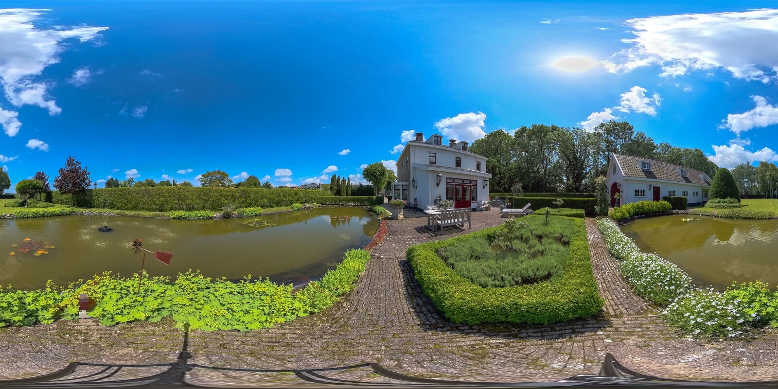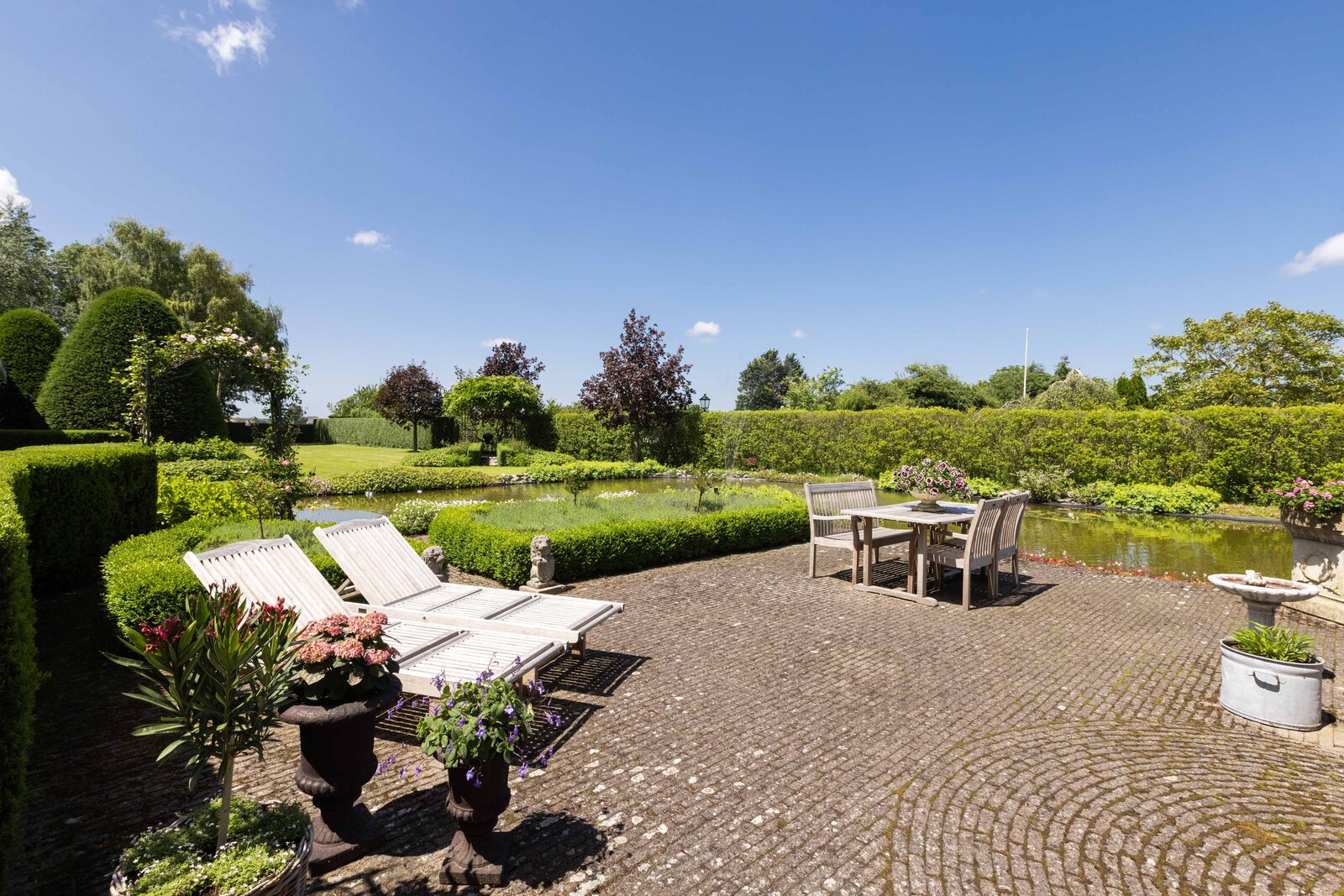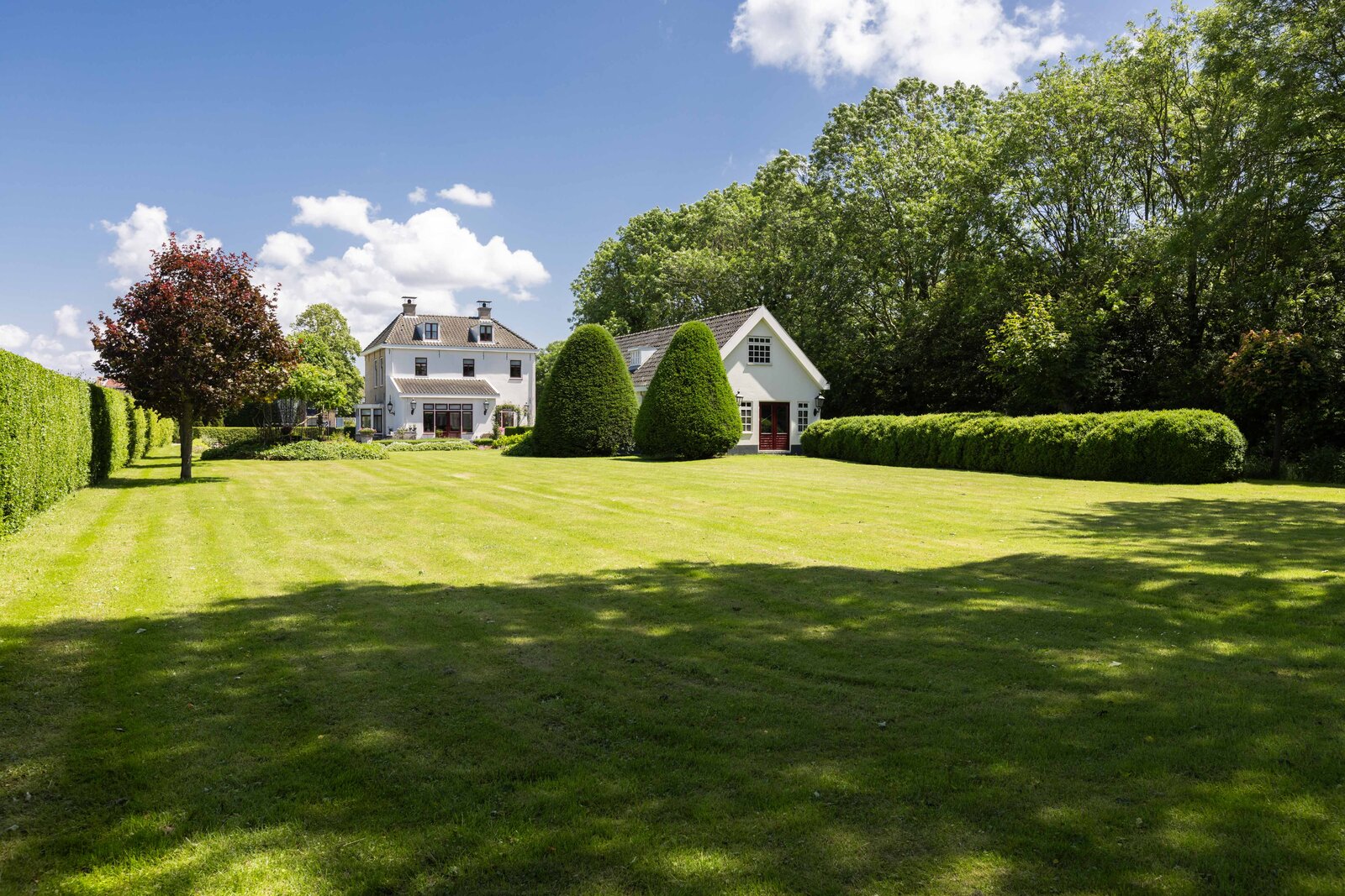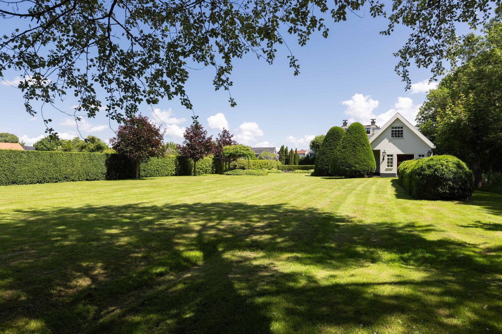 De prachtige tuin is keurig onderhouden en aangelegd met de mooie vijver als middelpunt. Het voormalige koetshuis is zoals al eerder is aangegeven momenteel in gebruik als garage. Het is mogelijk om hier meerdere auto’s te stallen. Boven deze ruimte is er een volwaardige zolder en de garage is toegankelijk via elektrische en op afstand bedienbare houten deuren. De verschillende bordessen zorgen voor mooie kleurscharkeringen en de privacy die u hier ervaart is werkelijk fantastisch. De vogeltjes die fluiten, de rust en het vrije uitzicht zorgen er voor dat u weer in dat sprookje terechtkomt.