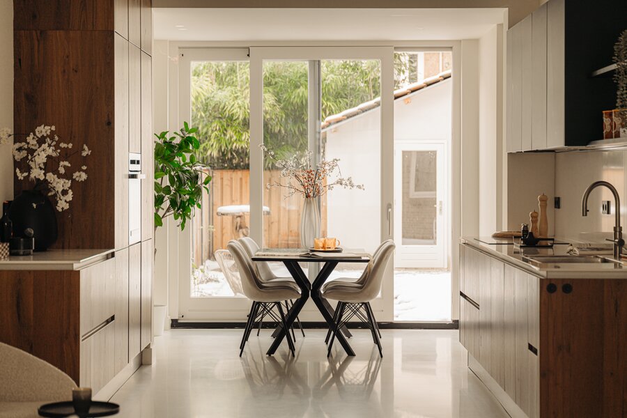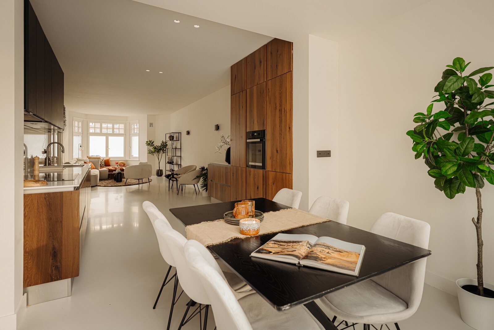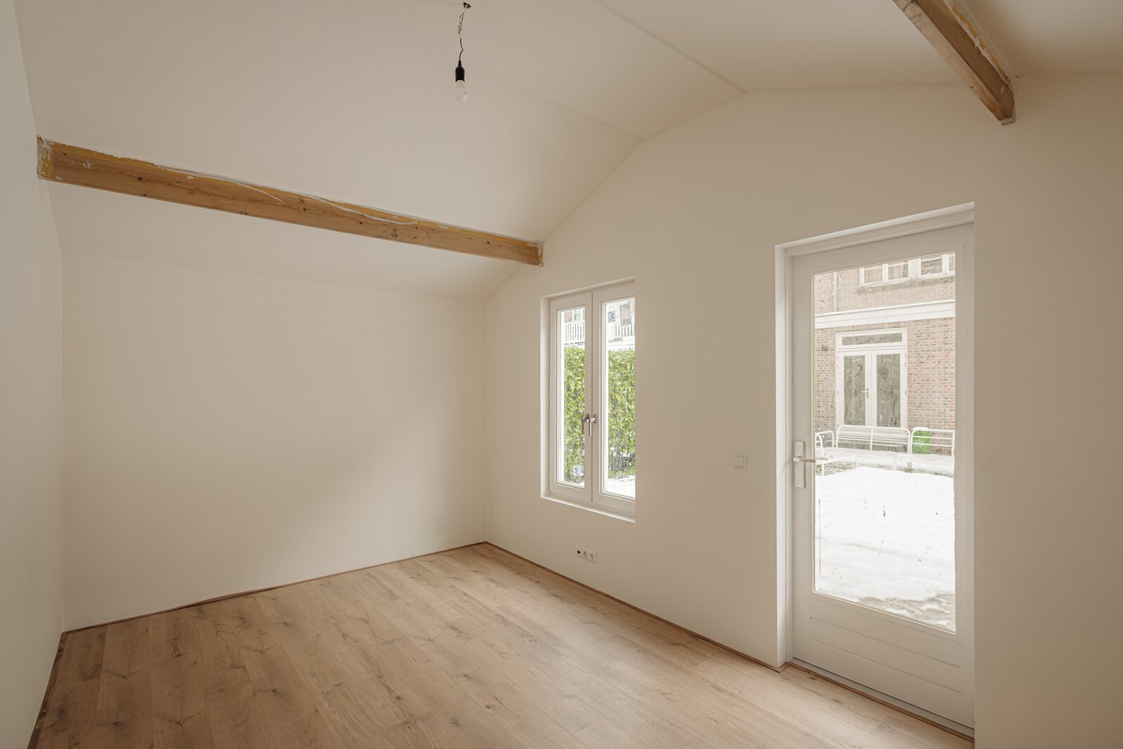 Het benedenhuis beschikt over een licht overgoten woonkamer, met aan de voorzijde een karakteristieke erker. Aan de achterzijde geven openslaande deuren toegang tot de prachtige tuin van circa 119 m². Dankzij de afmetingen kan hier gedurende een groot deel van de dag van de zon worden genoten. De moderne open keuken is zeer hoogwaardig en heeft alle hedendaagse inbouwapparatuur.