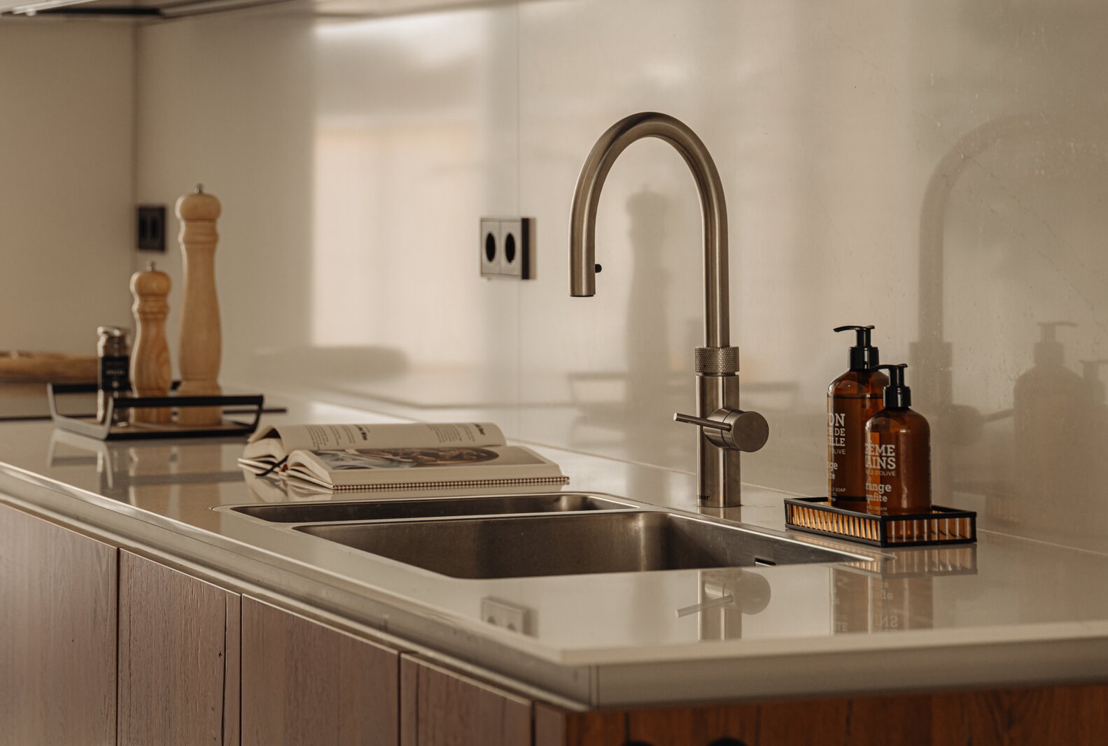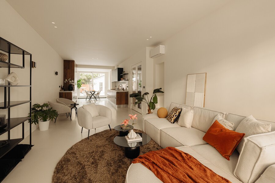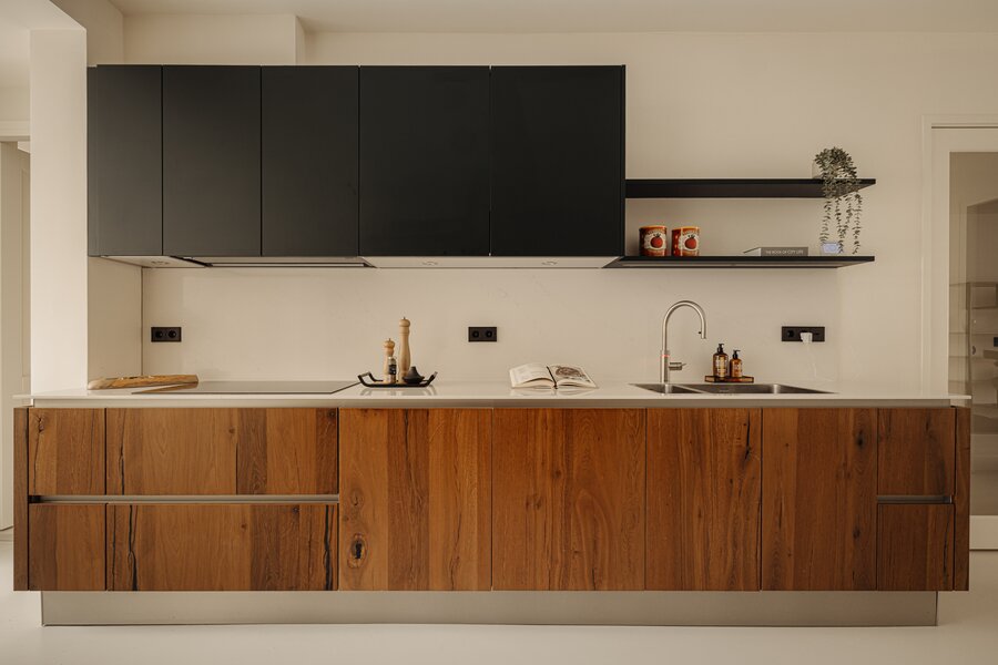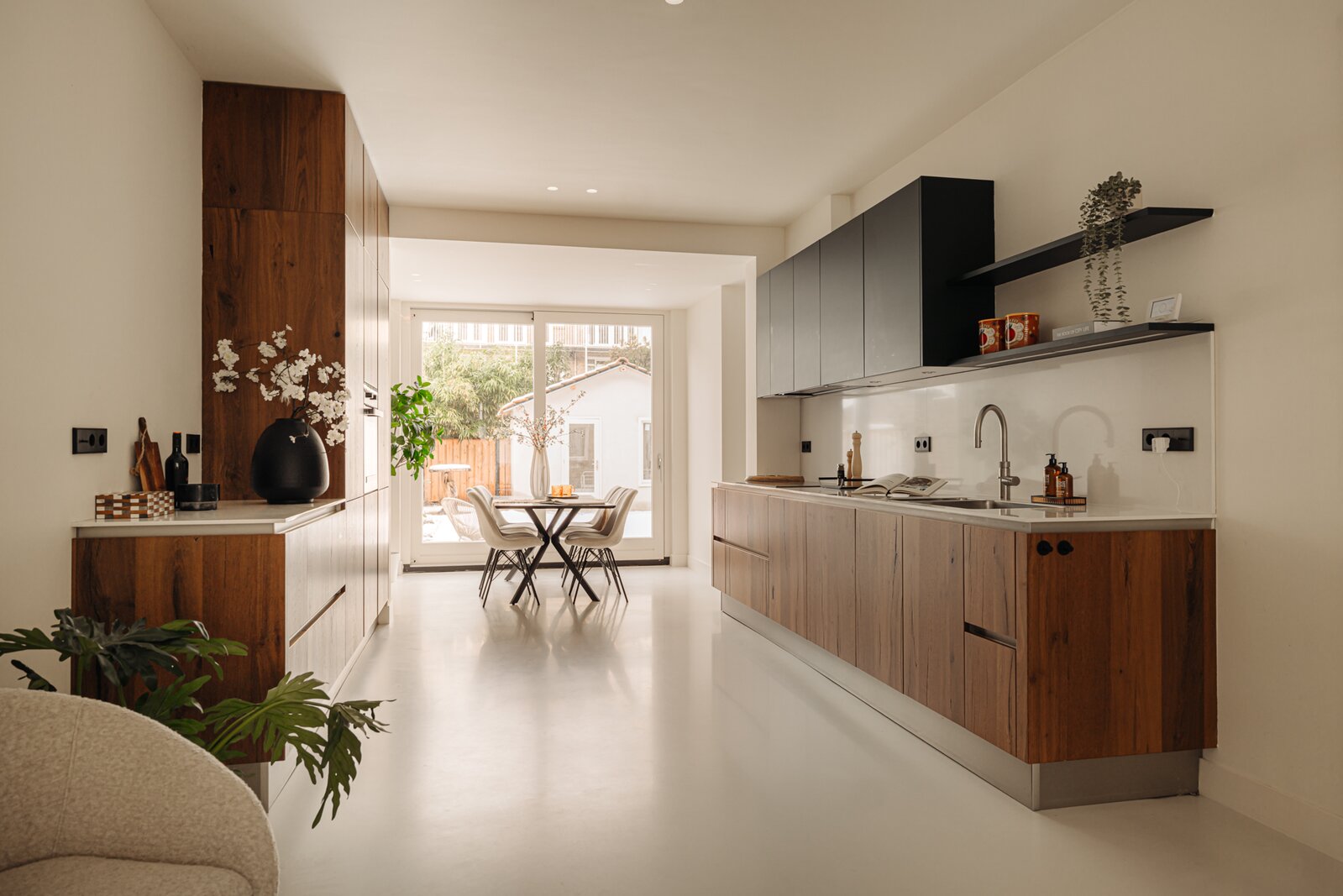 Het benedenhuis beschikt over een licht overgoten woonkamer, met aan de voorzijde een karakteristieke erker. Aan de achterzijde geven openslaande deuren toegang tot de prachtige tuin van circa 119 m². Dankzij de afmetingen kan hier gedurende een groot deel van de dag van de zon worden genoten. De moderne open keuken is zeer hoogwaardig en heeft alle hedendaagse inbouwapparatuur.