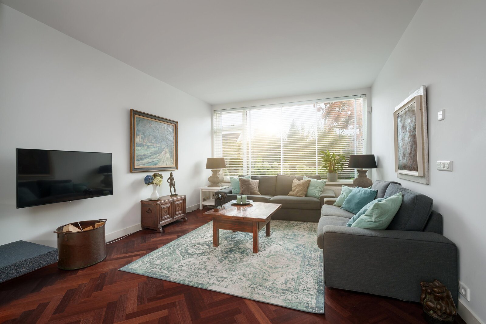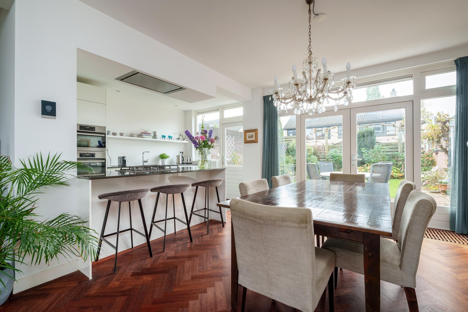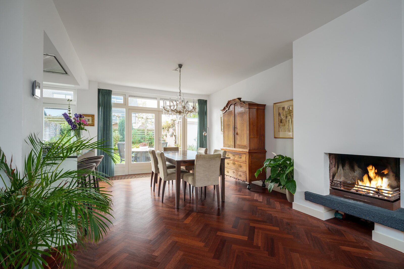 Overdekte entree, hal met vernieuwde meterkast, garderobe en toilet. De royale woon-/eetkamer beschikt over een sfeervolle open haard, grote raampartijen en dubbele openslaande deuren naar de achtertuin en een fraaie houten parketvloer. De moderne open woonkeuken met eiland is voorzien van diverse inbouwapparatuur en biedt eveneens toegang tot de tuin.