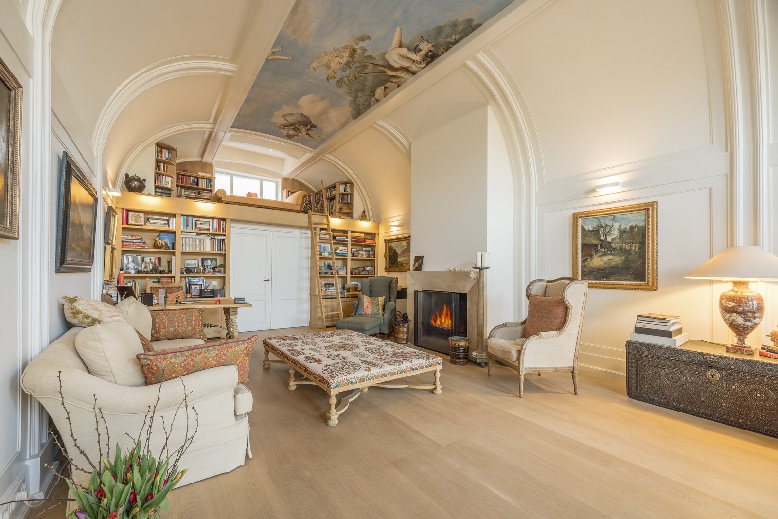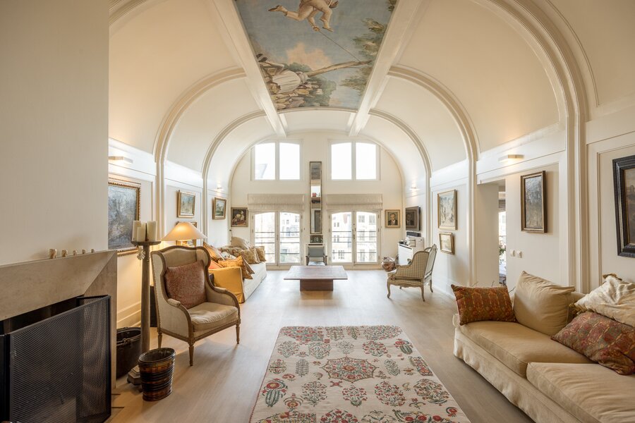 Het appartement wordt betreden op de derde verdieping in een fraaie hal en beschikt hier over een royale woonkamer met uniek beschilderd en zeer hoog plafond. Aan de achterzijde van de woonkamer is een kleine vide gebouwd welke de uitstraling van het gehele compleet maakt. De woonkamer met “echte” open haard heeft een prettige breedte en diepte en biedt volop mogelijkheden voor diverse zit- en werkopstellingen.