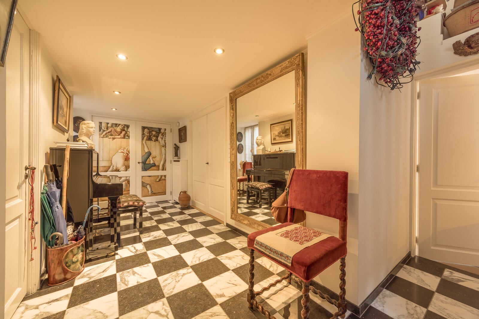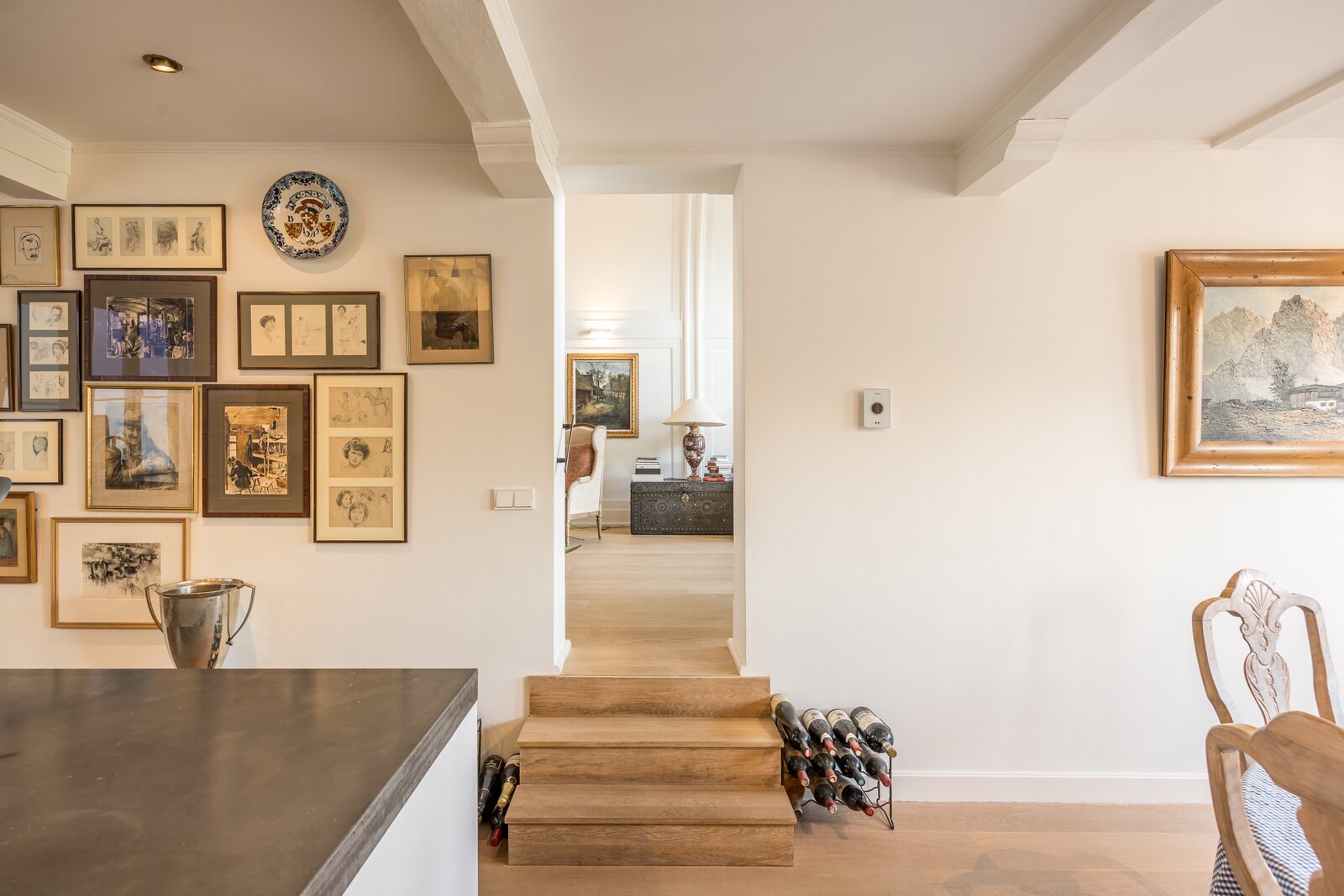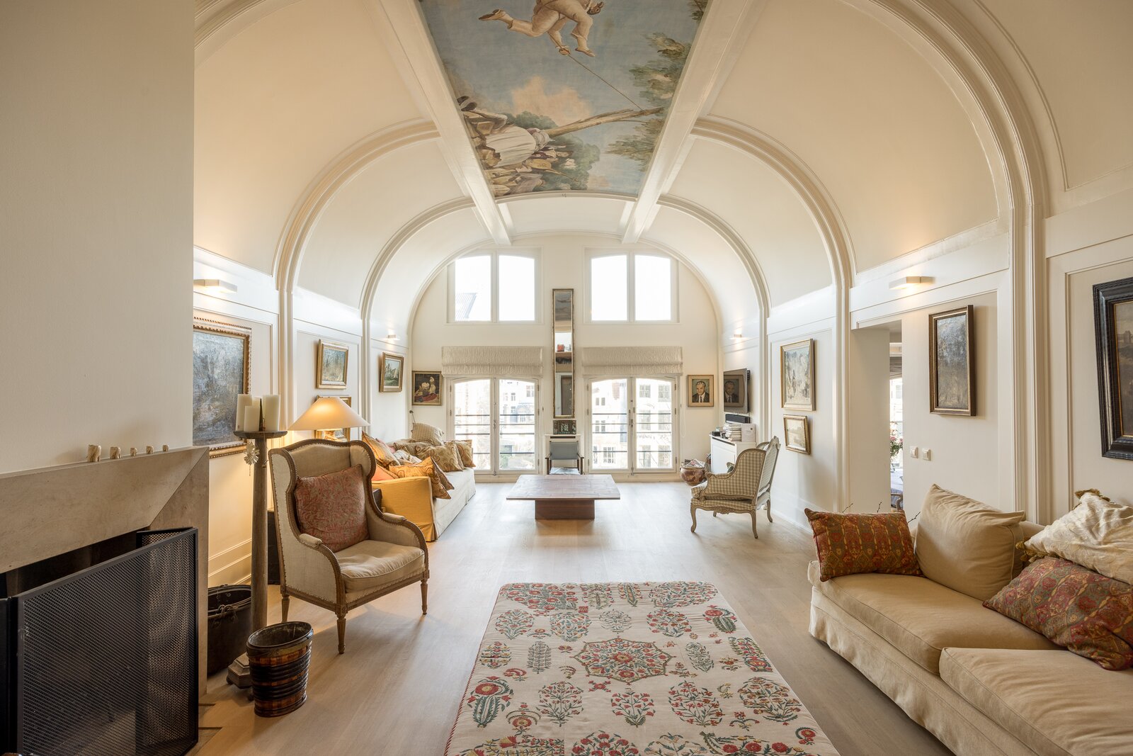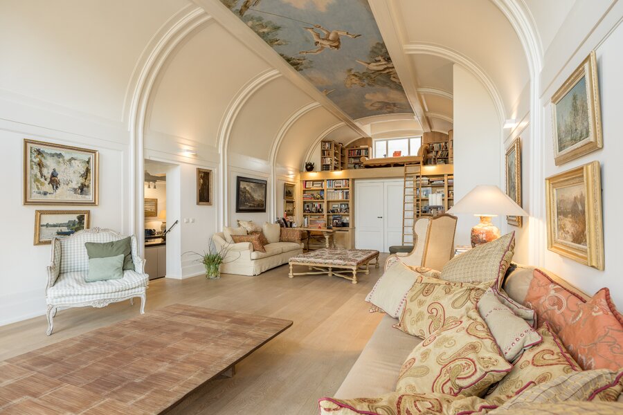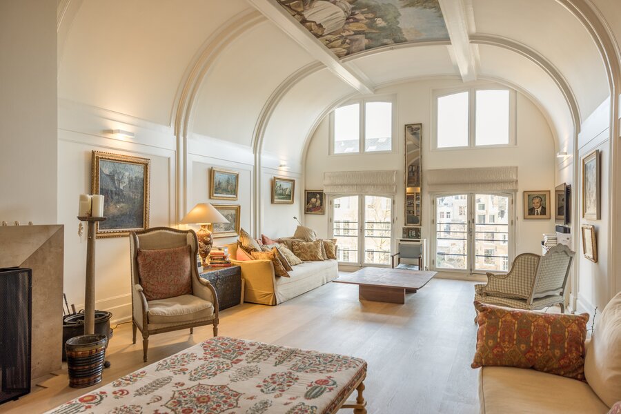 The apartment is accessed on the third floor via an elegant entrance hall, leading to a spacious living room with a uniquely painted and exceptionally high ceiling. At the rear of the living room, a charming mezzanine has been created, enhancing the character and overall aesthetic of the space.