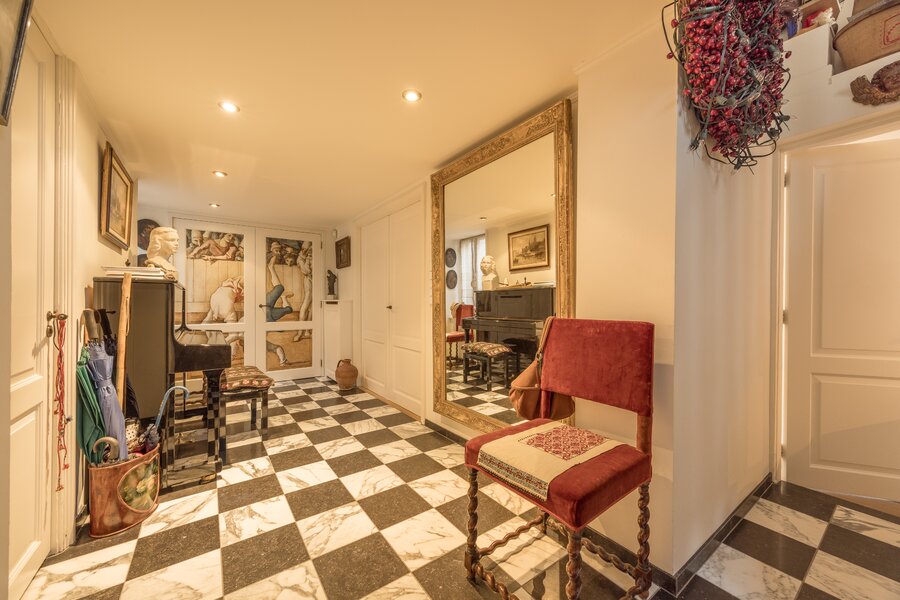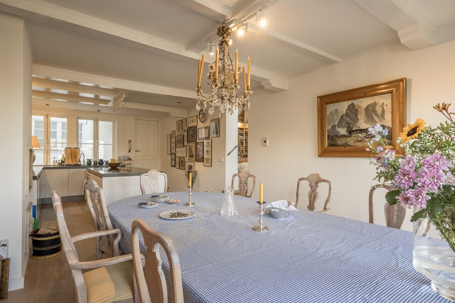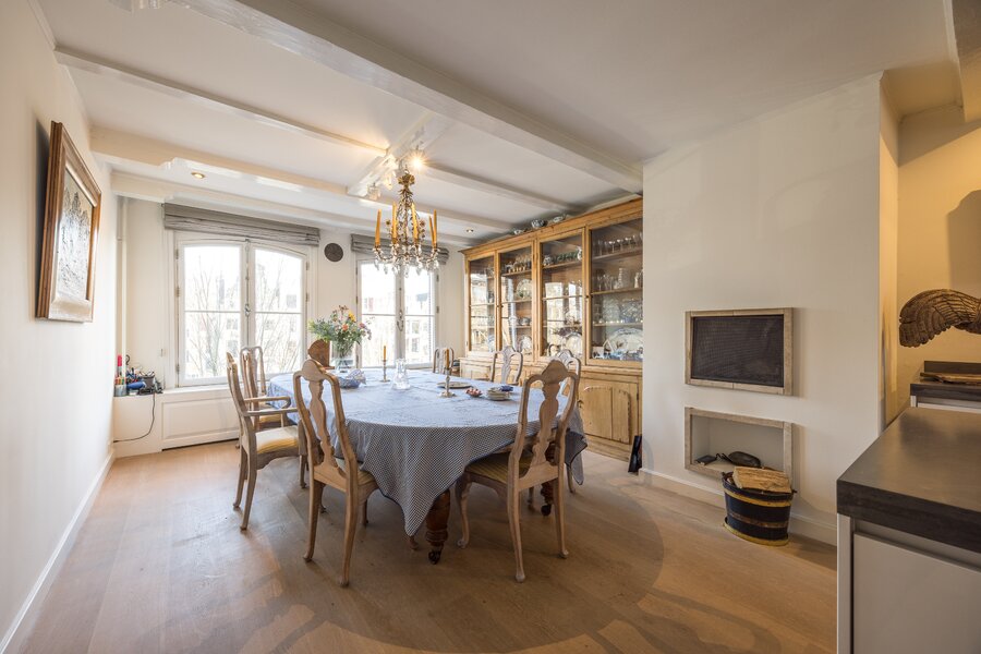 The apartment is spread over three levels and is distinguished by its impressive 9-meter-wide façade with four large windows, its warm and inviting atmosphere, and its timeless, high-quality finishes. Located in a well-maintained building with an elevator, it offers abundant natural light and a large, sunny terrace at the rear, with expansive views of the Westerkerk tower, an exceptionally rare outdoor space of this size in the heart of the city.