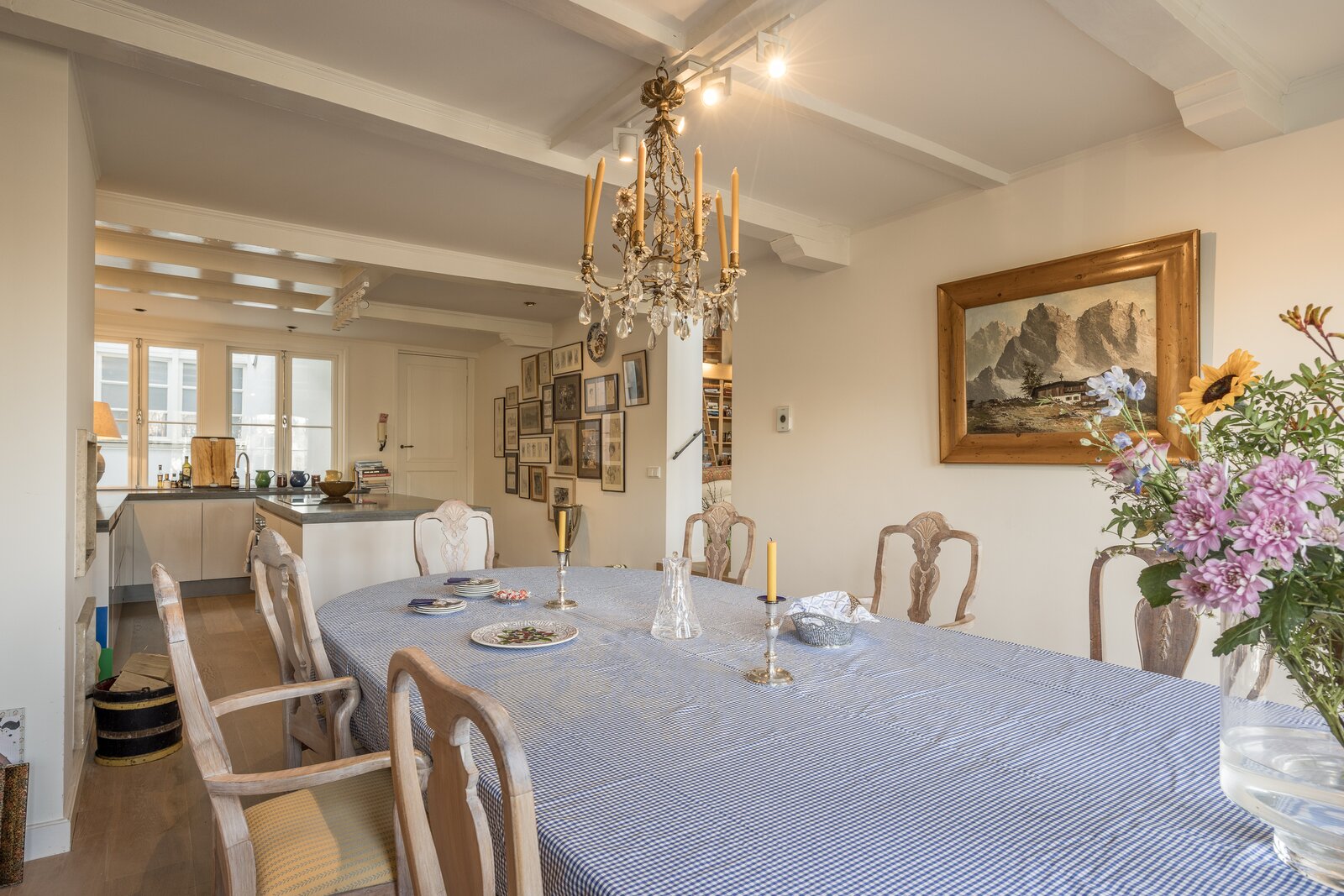 De woonkeuken, eveneens voorzien van een open haard, is ruim opgezet en biedt plaats aan een grote eettafel, ideaal voor lange diners en het ontvangen van gasten. Daarnaast bevinden zich op deze verdieping de garderoberuimte en een separaat toilet.