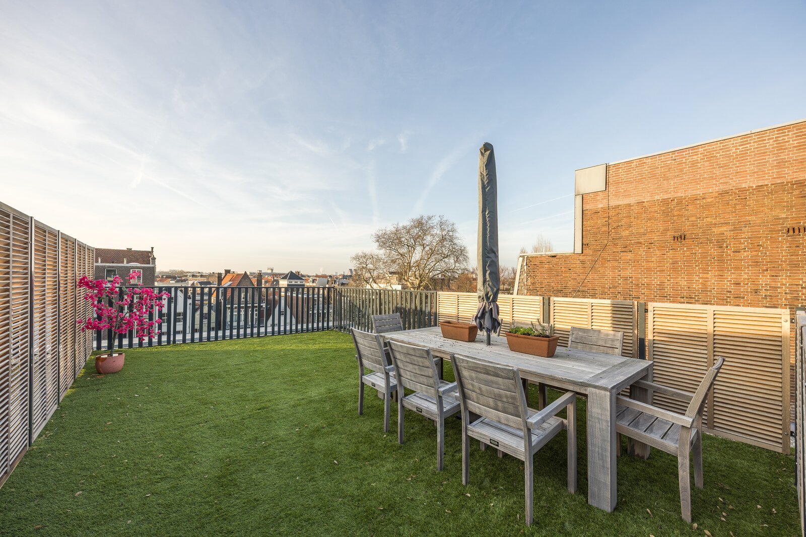 This rooftop terrace of approximately 50 m² provides ample space for multiple seating areas, a large dining table, and lounge furniture, an exceptionally rare luxury in central Amsterdam.
