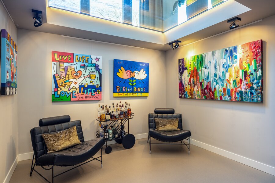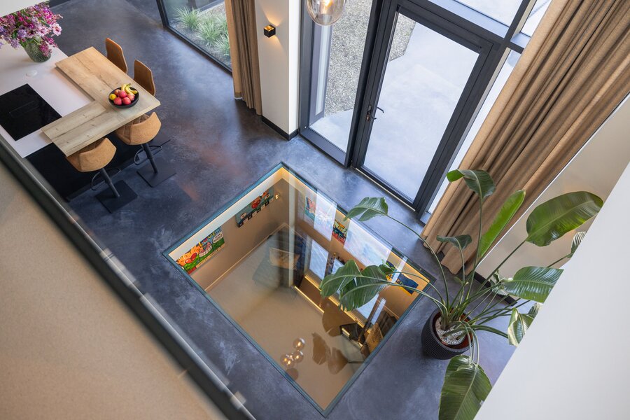 Momenteel wordt deze ruimte gebruikt als extra werkkamer. Het glazen plafond – zichtbaar vanuit de woonkamer en leefkeuken – zorgt voor een bijzondere visuele verbinding tussen het souterrain en de leefruimte erboven.