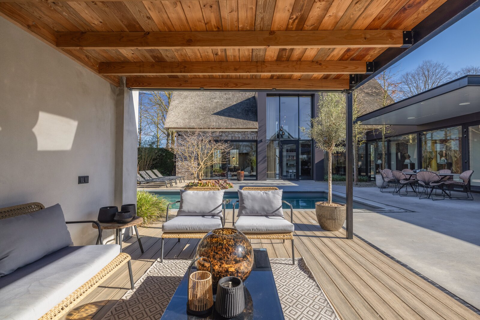 Grenzend aan de woning bevindt zich een royaal monolithisch terras met overkapping, voorzien van ingebouwde speakers en aansluitingen voor elektra en internet. Daarnaast beschikt de tuin over een tweede terras met een Douglas-houten overkapping en een jacuzzi.