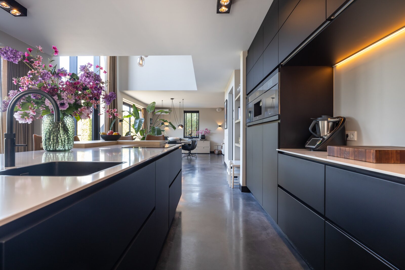 Dit is hét hart van de woning: een plek waar koken, samenzijn en gastvrijheid samenkomen. Het royale kookeiland met Novy-inductiekookplaat en geïntegreerde afzuiging, fungeert als centraal punt voor lange diners en gezellige momenten met familie en vrienden.