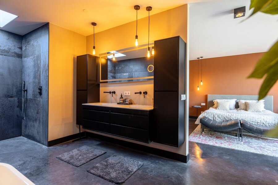 Via de steektrap in de open vide wordt de eerste verdieping bereikt, waarbij de ruimtelijkheid van de woning direct voelbaar blijft. Hier bevinden zich drie comfortabele slaapkamers, elk afgewerkt met hoogwaardige materialen zoals maatwerkkasten en een strakke troffelvloer.