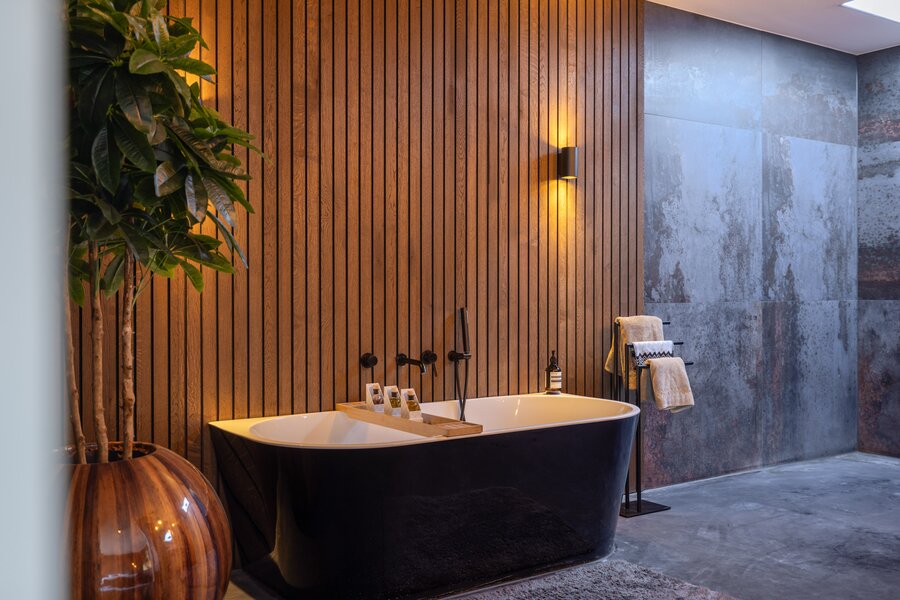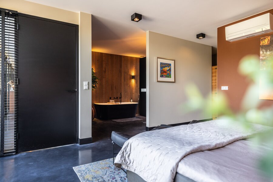 Op de begane grond bevindt zich de privé-slaapsuite van de villa: een royale hoofdslaapkamer met een eigen luxe badkamer én tweepersoons infrarood cabine. De badkamer is ingericht als een comfortabele wellnessruimte en beschikt over een ligbad, een meer dan ruime inloopdouche en een maatwerk wastafelmeubel.
