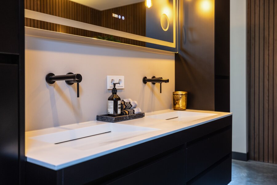 De tweede badkamer is eveneens zeer royaal opgezet en uitgerust met een ligbad, een ruime inloop(regen)douche en een dubbel wastafelmeubel. Via het geïntegreerde Sonos-audiosysteem kan ook hier eenvoudig muziek worden afgespeeld.
