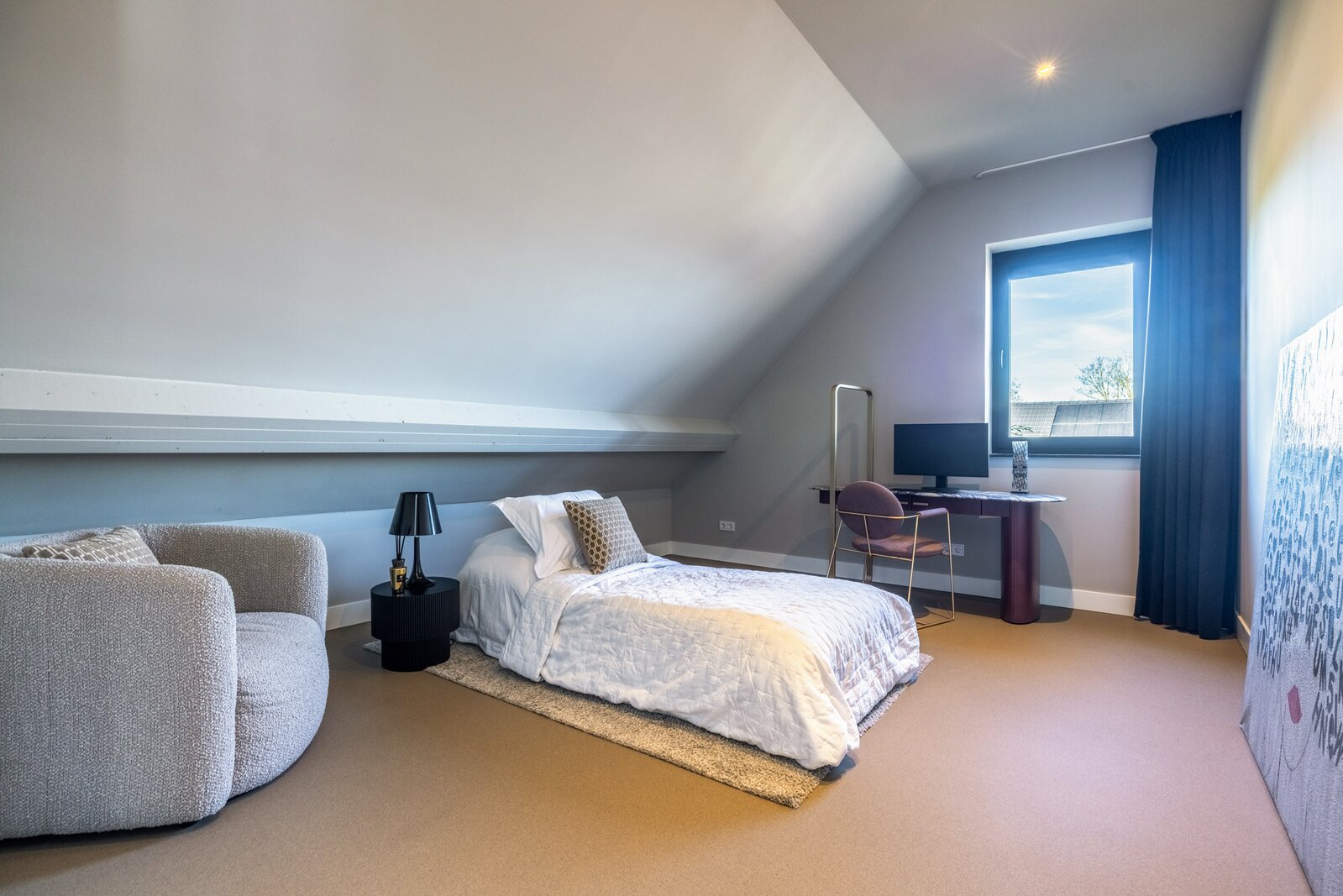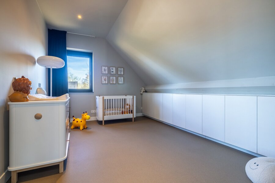 De suite wordt compleet gemaakt door een zeer ruime garderoberuimte, waar kleding en accessoires overzichtelijk en stijlvol kunnen worden opgeborgen. Vanuit deze slaapkamervleugel kijkt u uit over de fraai aangelegde achtertuin.
