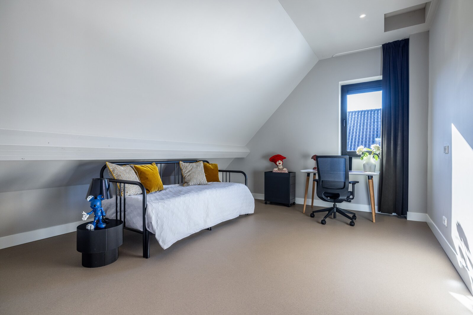 Aan de voorzijde van de woning bevindt zich een multifunctionele werkkamer, momenteel in gebruik als speelkamer. Deze ruimte leent zich uitstekend als representatief thuiskantoor, studeerkamer of hobbyruimte.