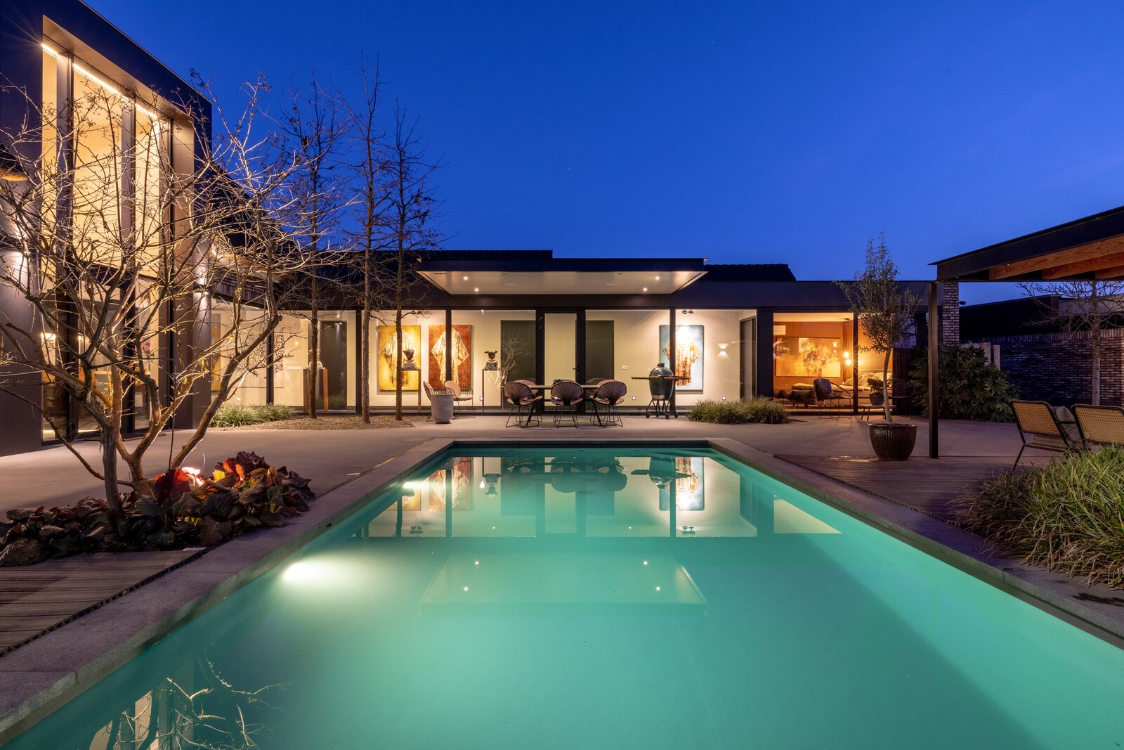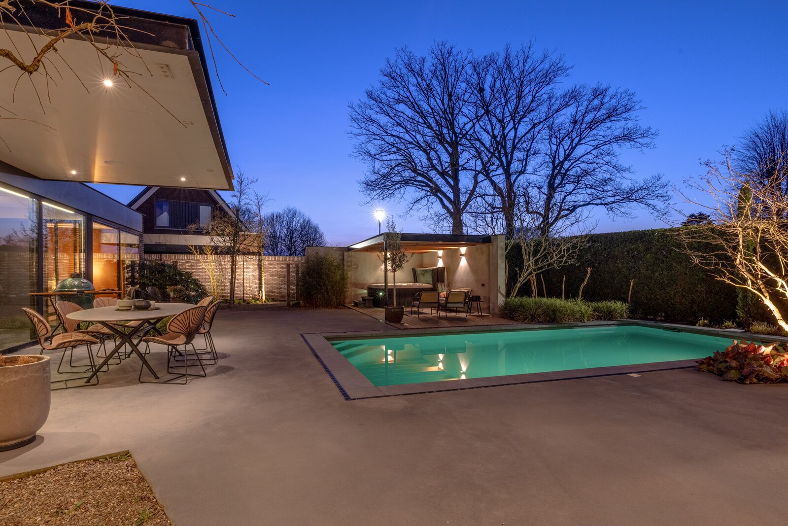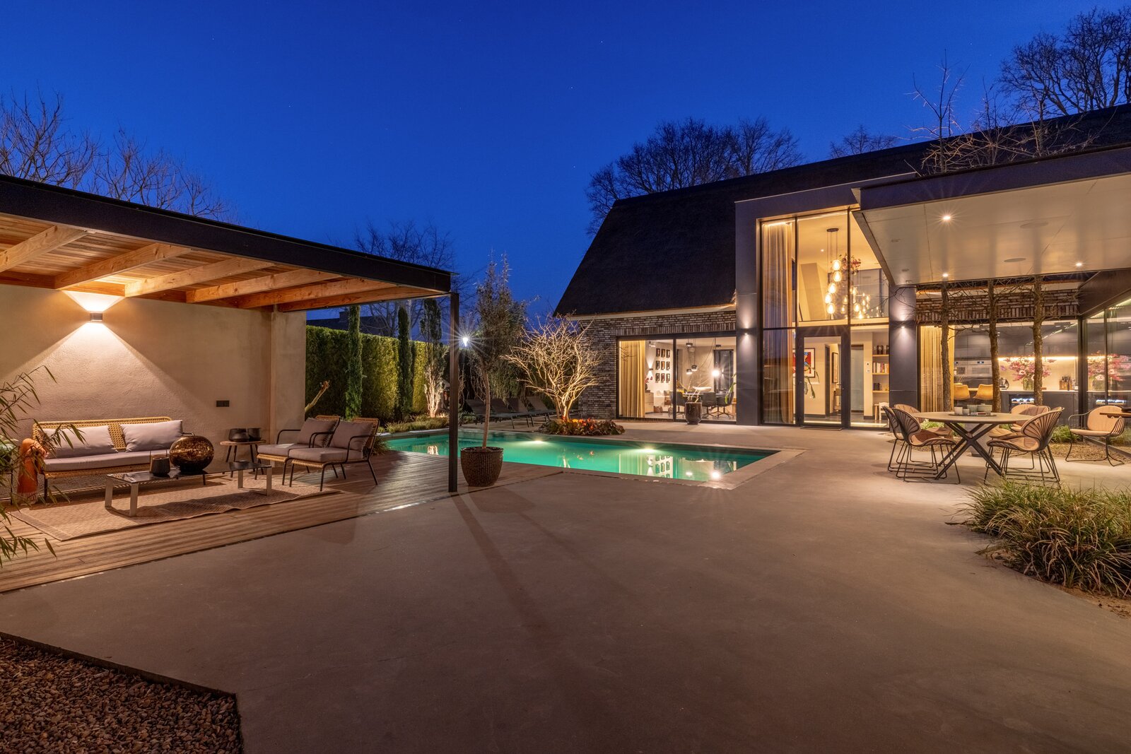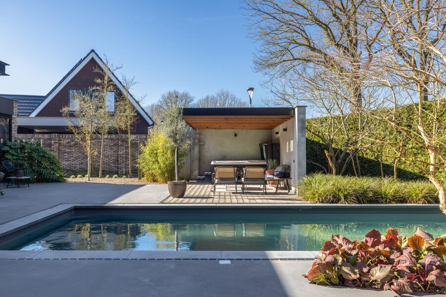 Ook buiten is het hoogwaardige afwerkingsniveau moeiteloos doorgetrokken. De onder architectuur aangelegde tuin op het zuidwesten biedt optimale privacy en vormt een sfeervolle plek om van het buitenleven te genieten. Volwassen beplanting, sfeervolle verlichting en een automatische beregeningsinstallatie zorgen ervoor dat de tuin het hele jaar door verzorgd oogt. Het volledig geautomatiseerde en verwarmde zwembad van circa 8 x 4 meter vormt het middelpunt van de tuin.