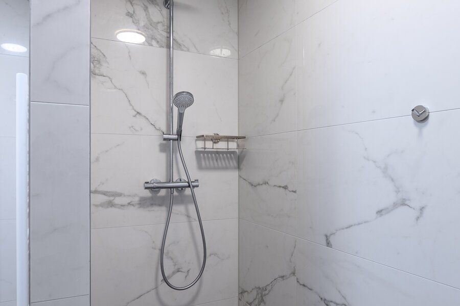 De moderne, geheel betegelde, badkamer is voorzien van een ligbad, ruime inloopdouche, dubbele wastafel in meubel en wandcloset. De badkamer en het tweede toilet zijn in dezelfde stijl afgewerkt en eveneens voorzien van vloerverwarming.