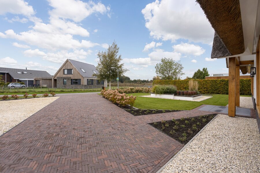 Rondom de woning is een fraai aangelegde tuin. De voortuin beschikt over een oprit en parkeerplek voor meerdere auto's. In de achtertuin is het genieten van het groen, het water en de natuur. De doorgetrokken dakpartij overkapt een heerlijk terras met buitenhaard. Daarnaast bevindt zich hier een gazon, de insteekhaven en een groot tuinhuis. Het tuinhuis beschikt over een keuken, toilet, grote overkapping en aangrenzend een garage.