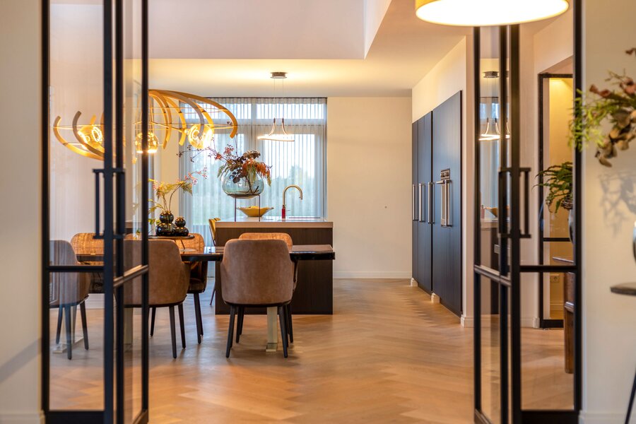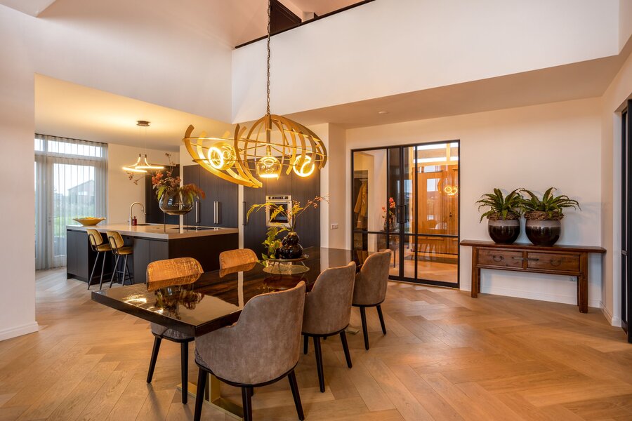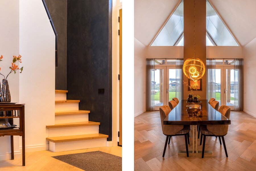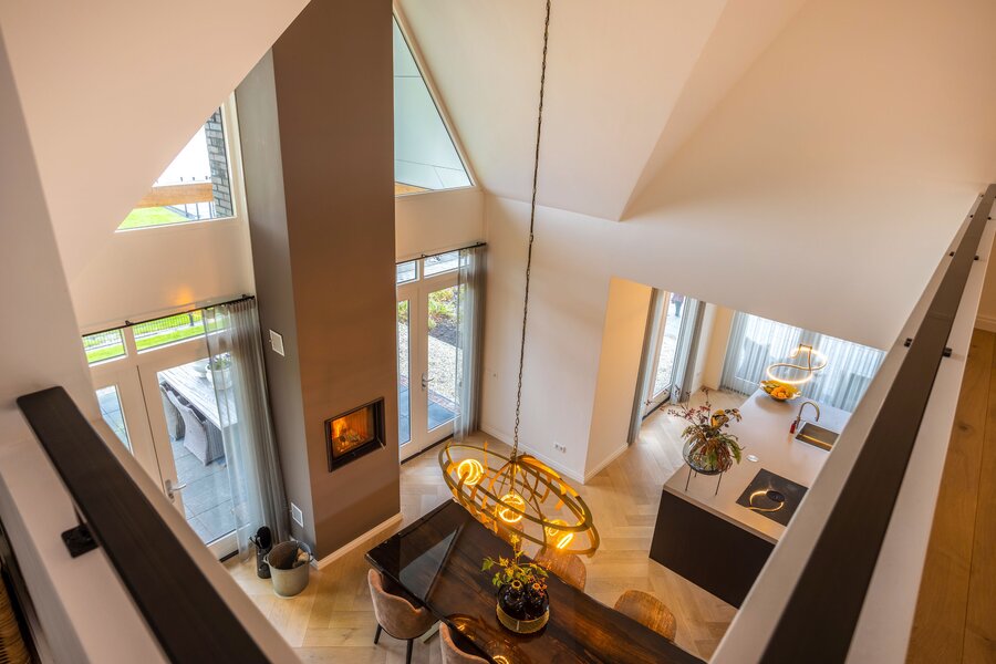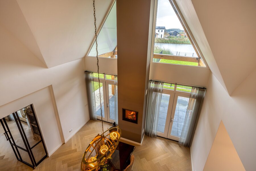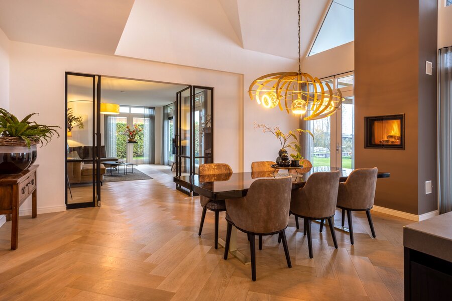 U komt binnen in de entree met de garderobe, meterkast, het toilet, de trapopgang naar de eerste verdieping, toegang tot de slaapkamer op de begane grond en deur naar de eetkamer. De riante eetkamer is het centrale punt van de woning; met haar hoge plafondpartij, haard en fraai uitzicht over het water is dit een echte blikvanger. De moderne open keuken aan de rechterzijde is uitgerust met hoogwaardige apparatuur waaronder een inductiekookplaat met downdraft afzuiging, oven, koelkast, vaatwasser en Quooker-kraan. Aangrenzend treft u een ruime bijkeuken met