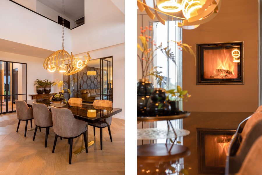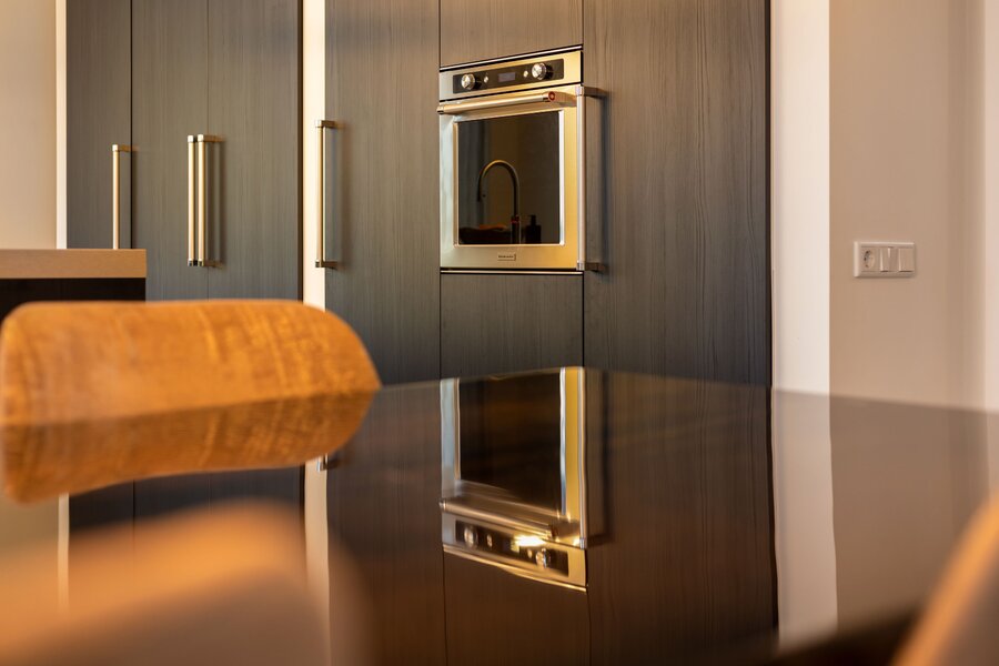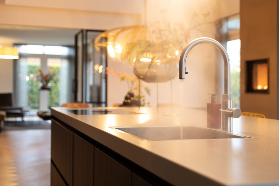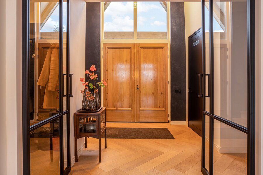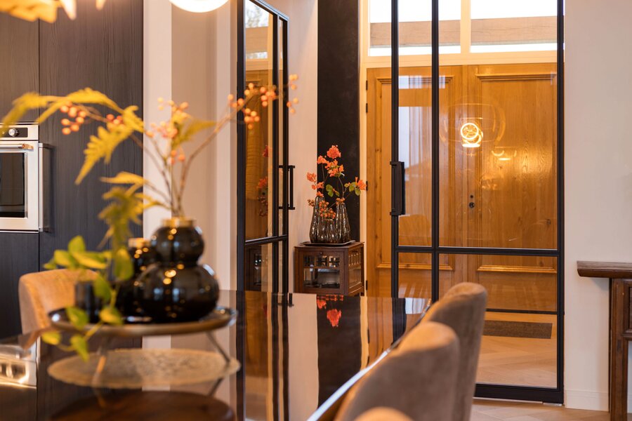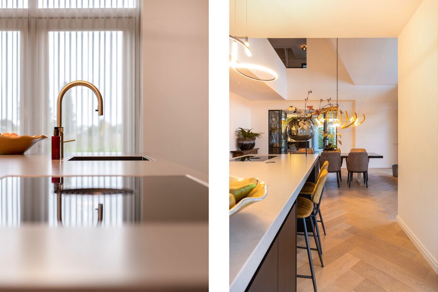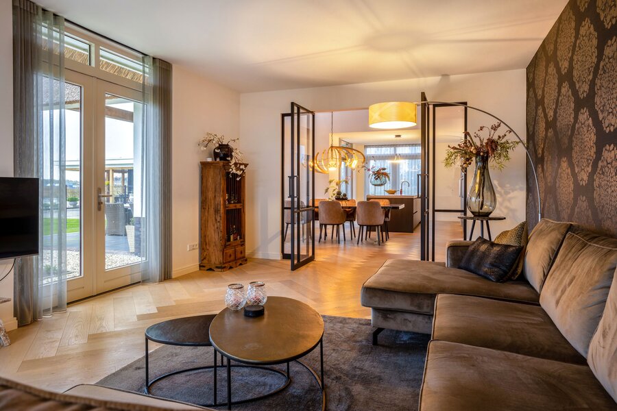 U komt binnen in de entree met de garderobe, meterkast, het toilet, de trapopgang naar de eerste verdieping, toegang tot de slaapkamer op de begane grond en deur naar de eetkamer. De riante eetkamer is het centrale punt van de woning; met haar hoge plafondpartij, haard en fraai uitzicht over het water is dit een echte blikvanger. De moderne open keuken aan de rechterzijde is uitgerust met hoogwaardige apparatuur waaronder een inductiekookplaat met downdraft afzuiging, oven, koelkast, vaatwasser en Quooker-kraan. Aangrenzend treft u een ruime bijkeuken met
