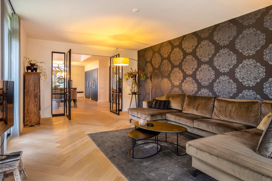 Aan de linkerzijde bevindt zich de woonkamer. Deze is net als de rest van de woning voorzien van een houten vloer, en beschikt over openslaande deuren naar de achtertuin.