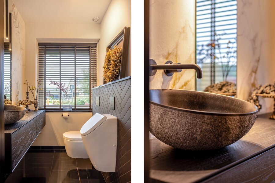 De trap in de hal leidt naar de open vide op de eerste verdieping met hier toegang tot twee slaapkamers en een badkamer. Beide slaapkamers beschikken over een walk-in closet en grote raampartijen die weids uitzicht bieden over de omgeving. De luxe badkamer is voorzien van een fraaie marmeren vloer, douchecabine, dubbel wastafelmeubel, ligbad en vloerverwarming. Kenmerkend zijn de in de muur geïntegreerde kranen en douche en de sfeervolle designverlichting .