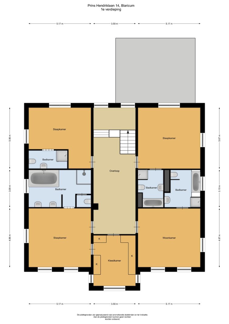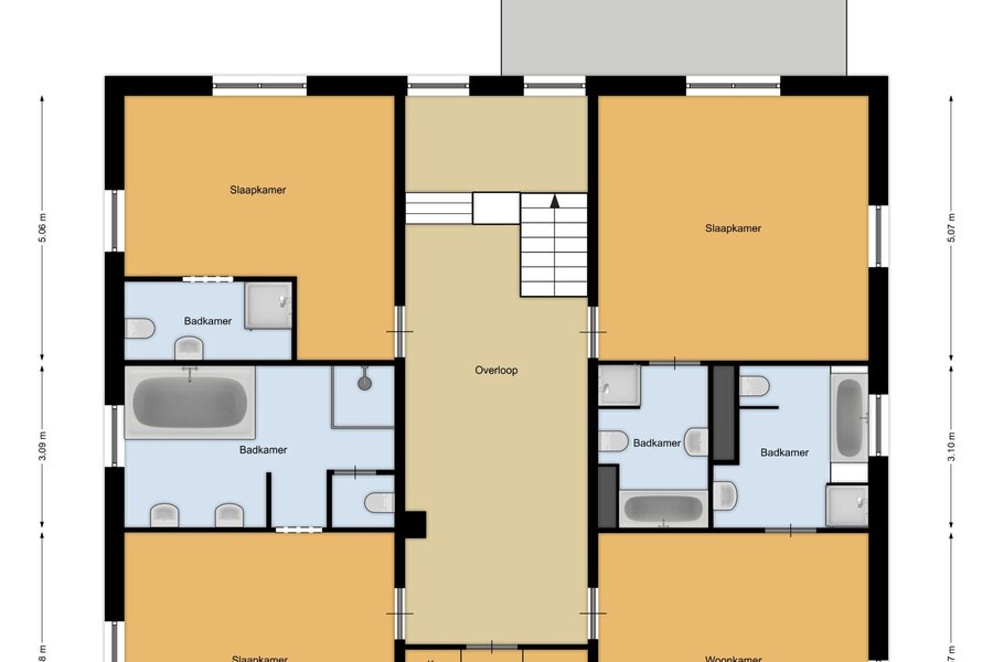 Terug naar het landhuis: op de eerste verdieping treft u vier vierkante slaapkamers. Voor wie het nog nooit ervaren heeft, niets is zo fijn qua indeling en inrichting als een vierkante kamer. Iedere slaapkamer beschikt over een eigen badkamer. De vijfde kamer op deze verdieping is de perfecte kleedkamer bij uw master-bedroom.