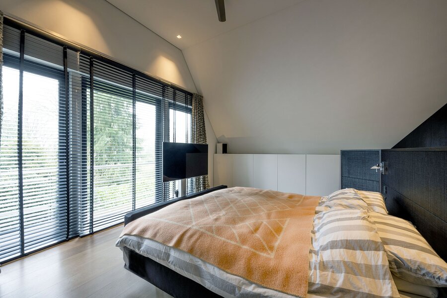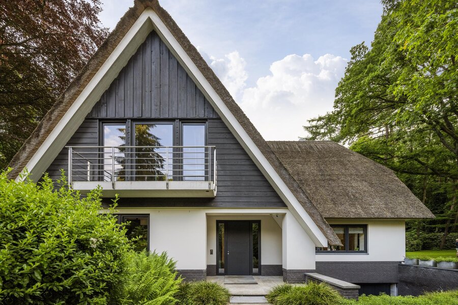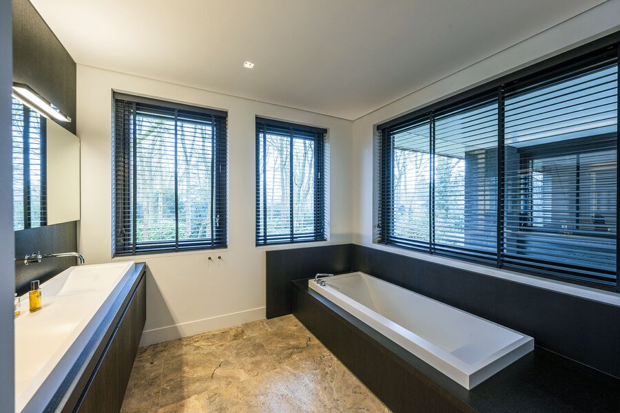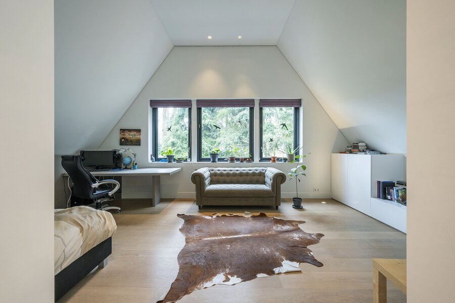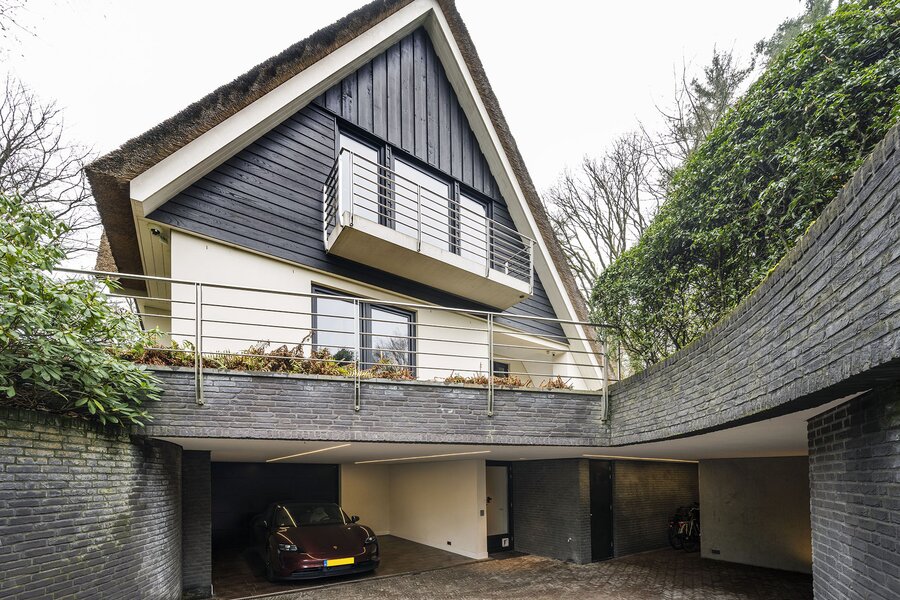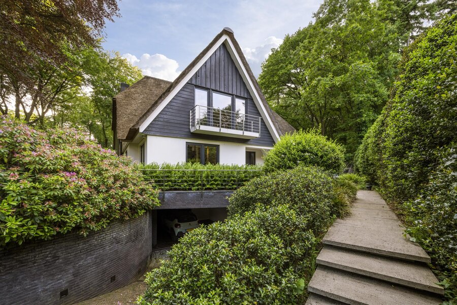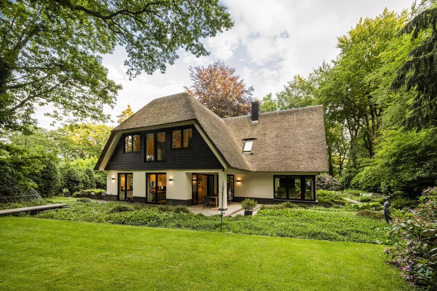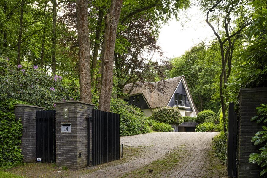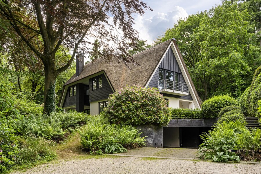 Keer op keer figureert de Zwarte Berg in Laren in lijstjes van ‘fijnste buurten om te wonen’. Geen wonder, want hier – in de ‘Gouden Driehoek’ van het Gooi – sieren majestueuze bomen, fraaie tuinen en vrijstaande villa’s de lanen. Hier ligt aan het Raboes het ultieme familiehuis op een uiterst aantrekkelijk glooiende kavel wat terecht een droomhuis genoemd kan worden. Vanuit het rustige Raboes met grote percelen en veel volwassen bomen loopt u zo het Goois Natuurreservaat binnen, met heide, heuvels en schapen en optimaal gepositioneerd ten opzicht van uitvalswegen. Er zijn simpelweg weinig plekken in het Gooi die mooier zijn. Omarmd door prachtige beuken en eiken aan de voorzijde oogt de villa – waar BOS Architecten voor tekende – een stuk bescheidener dan het met zijn maar liefst 690 m² woonoppervlak is. Het terrein waarop deze villa in 2013/2014 verrees, is inmiddels zo’n 45 jaar familiebezit en de huidige eigenaren hebben veel inbreng gehad bij het ontwerp en realisatie.