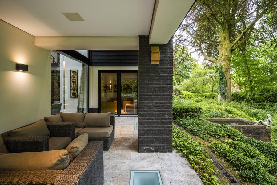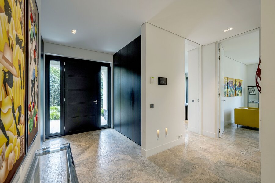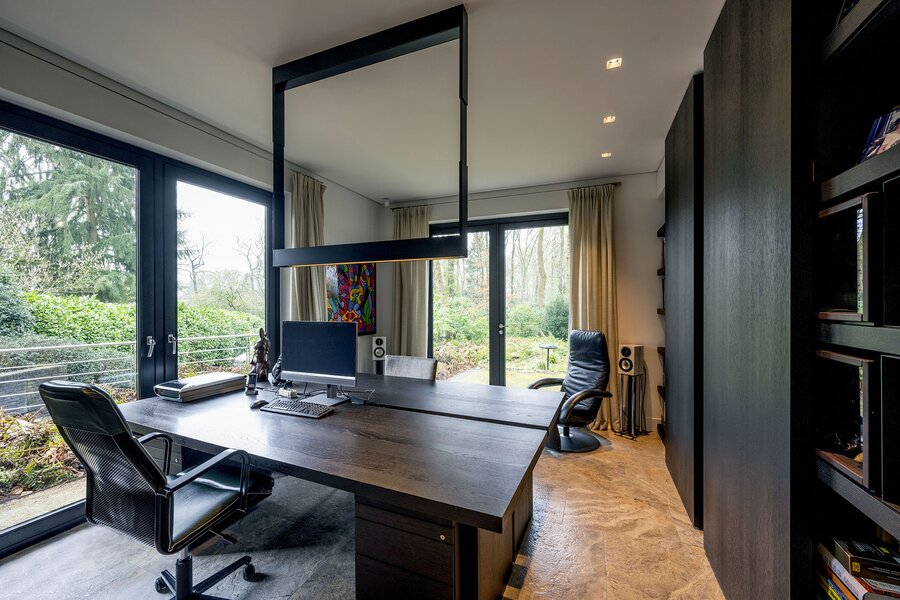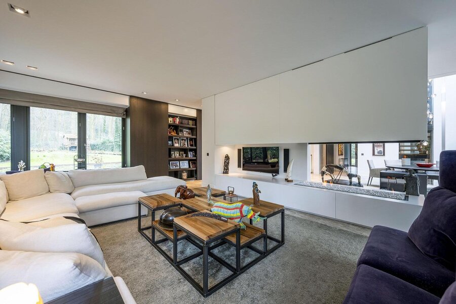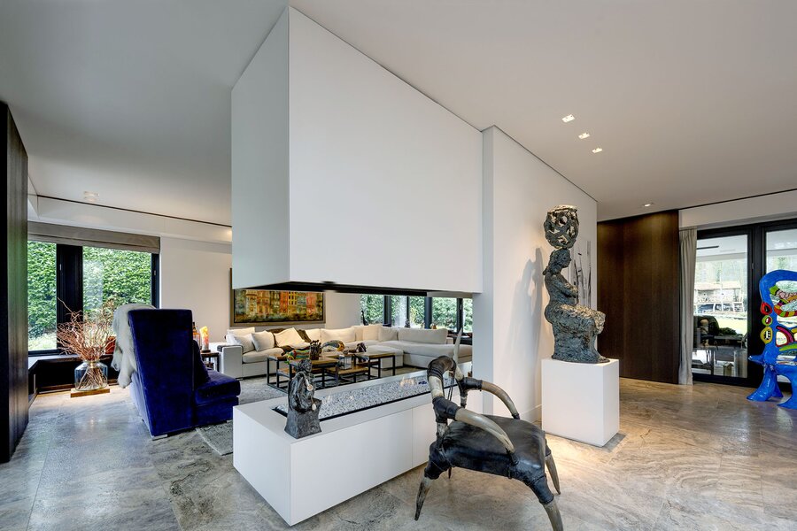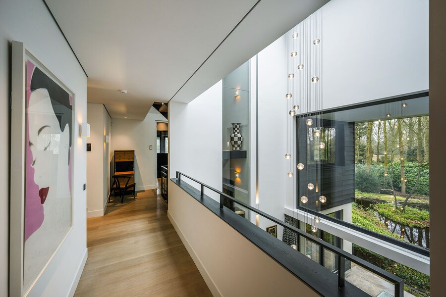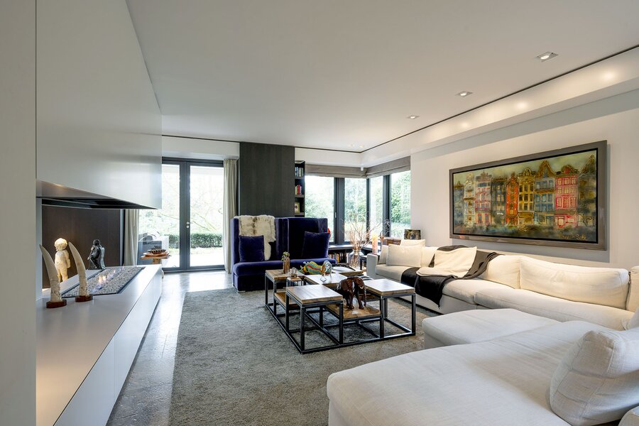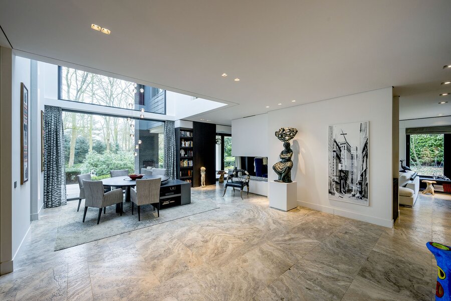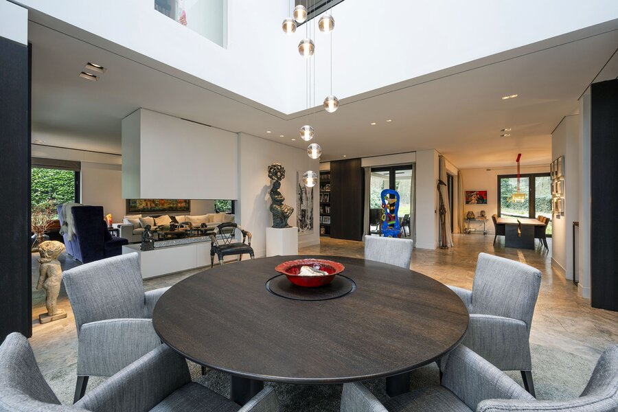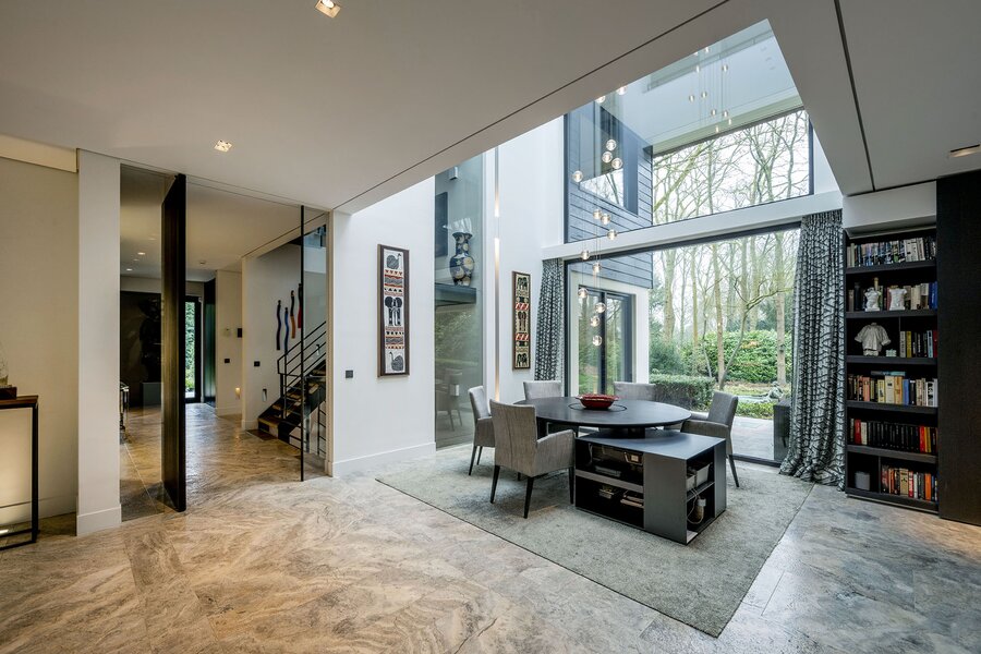 Bij aankomst treft u direct achter de toegangspoort parkeerruimte voor minimaal vier auto’s waarna een buitentrap u leidt naar de hoofdentree op de begane grond. Deze geeft toegang tot een studeerkamer en een zogenaamde Family-Room welke voorheen bedoeld was als speelkamer voor de kinderen. In de hal bevindt zich een indrukwekkend en licht trappenhuis wat de vier bouwlagen met elkaar verbindt. Via een taatsdeur komt u in de centrale ruimte met een groot atrium, oorspronkelijk gepland als eetkamer maar momenteel in gebruik is als centrale leesruimte. Hier lopen ruimtes naadloos in elkaar over, waarbij toch heldere zones gecreëerd zijn door zogenoemde ‘schijven’ – een soort kruising tussen een wand en een room divider – waarin steeds ook een functie is opgenomen. In beide schijven bevindt zich een gashaard, en in één daarvan vindt u op de kop bijvoorbeeld een bar. Bij het ontwerp is rekening gehouden met plaats voor kunst, waarbij ingebouwde vloer spots de kunst optimaal verlicht. Grenzend treft u de woonkamer met zicht op zowel voor- als achtertuin, en toegang tot een riant overdekt voorterras middels openslaande deuren, met open haard van waaruit men prachtig zicht heeft over de fraai aangelegde bostuin. De deels afgeschermde open keuken is ook in gebruik als eetruimte. De keukenapparatuur is Michelin-ster-waardig met Gaggenau keukenapparatuur, een tweetal vaatwassers, twee koelkasten, wijnklimaatkast en diverse andere benodigdheden in een zo’n luxe keuken. Grenzend aan de eetruimte treft u openslaande deuren tot een overdekt buitenterras wat beschikt over ingebouwde audio, heaters en fraai zicht op de diepe achtertuin grenzend aan een bos.