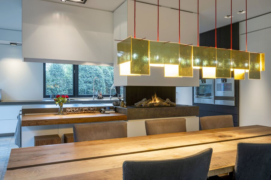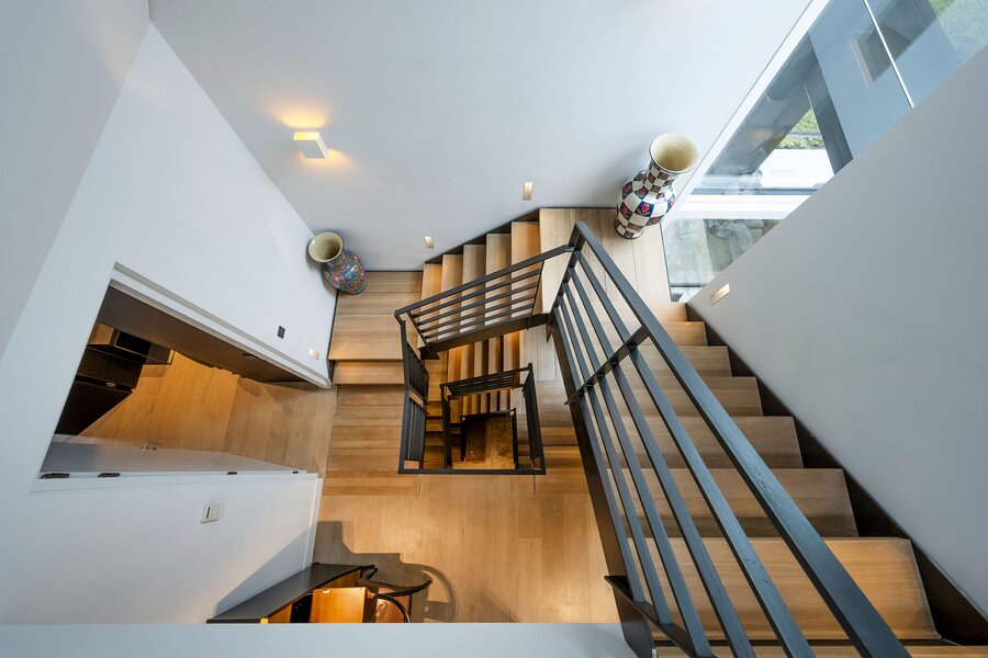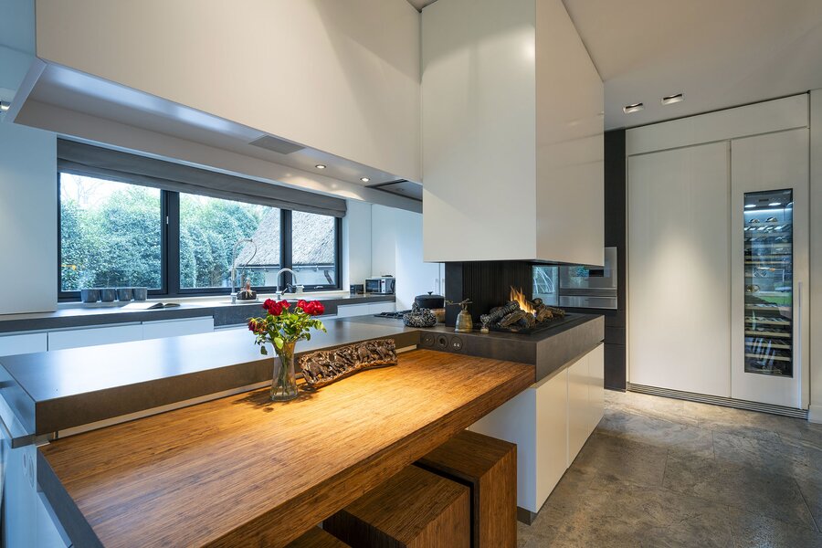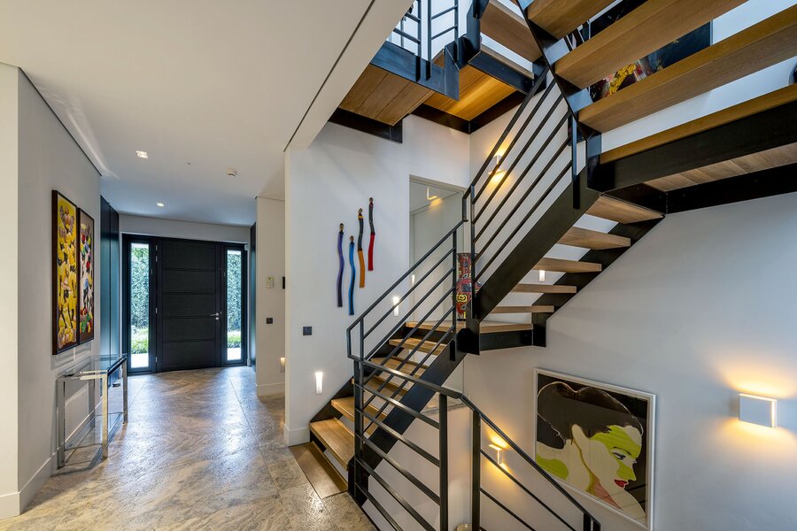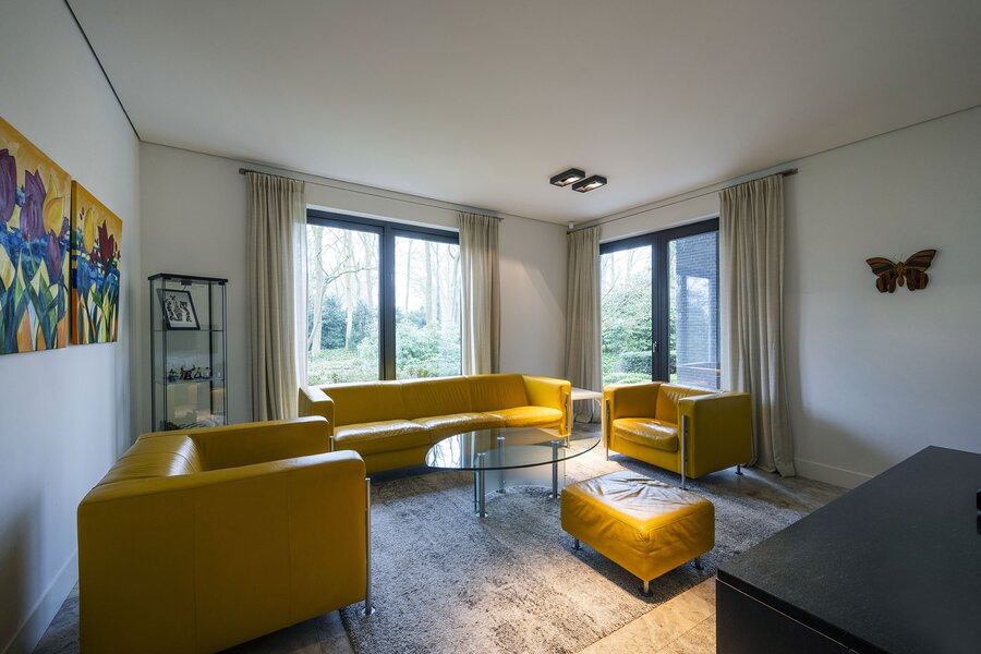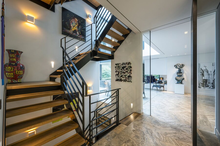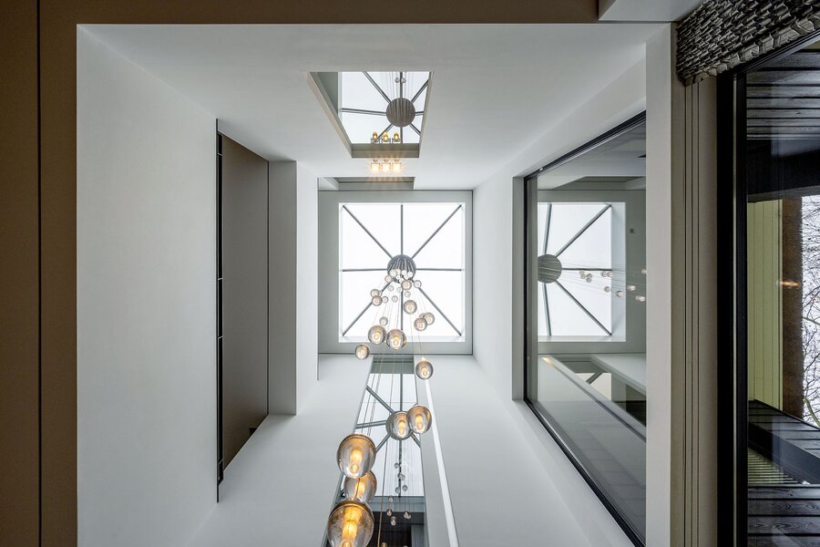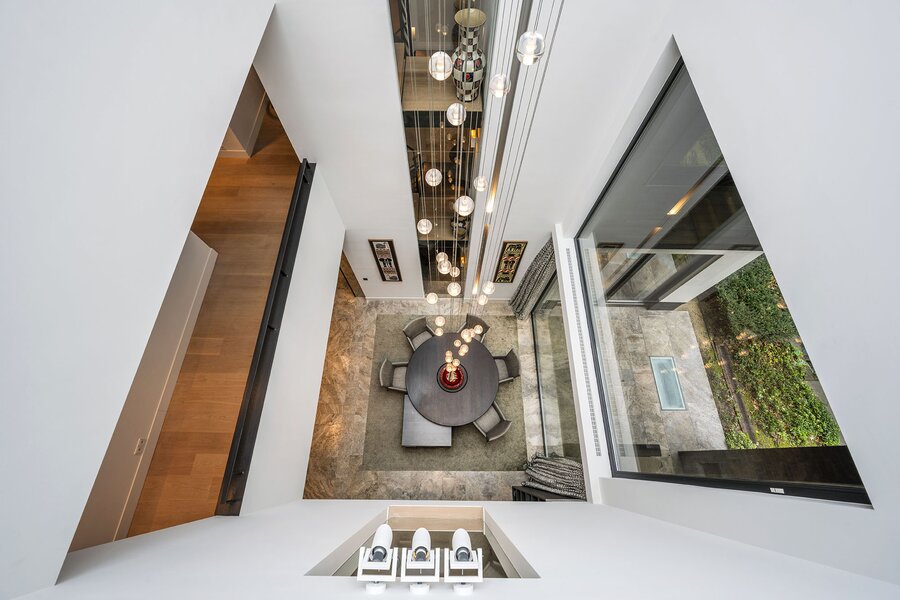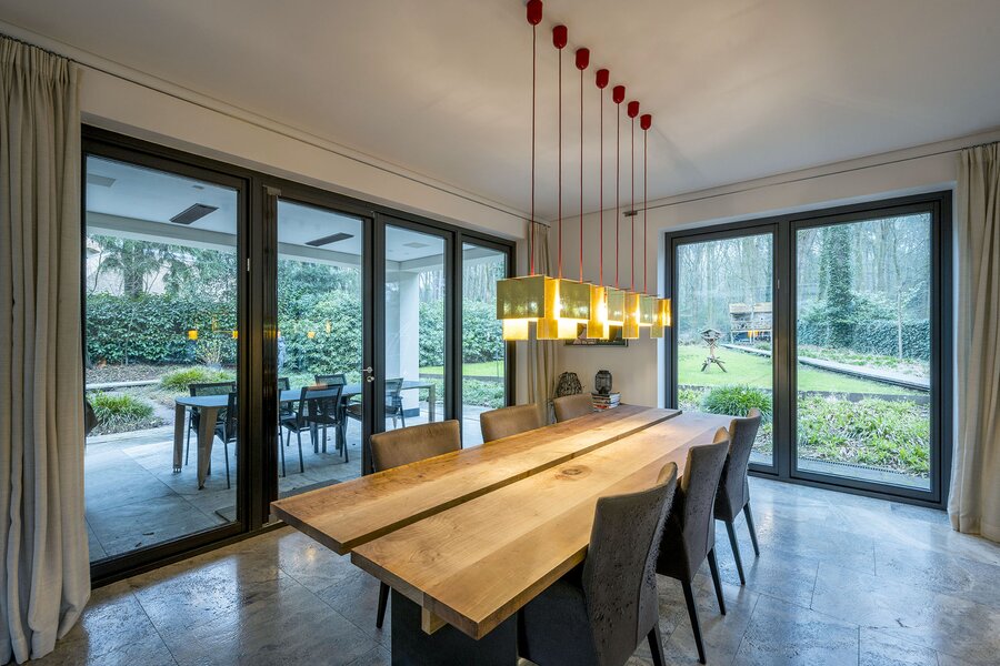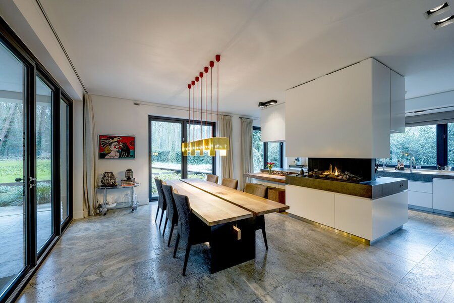 Bij aankomst treft u direct achter de toegangspoort parkeerruimte voor minimaal vier auto’s waarna een buitentrap u leidt naar de hoofdentree op de begane grond. Deze geeft toegang tot een studeerkamer en een zogenaamde Family-Room welke voorheen bedoeld was als speelkamer voor de kinderen. In de hal bevindt zich een indrukwekkend en licht trappenhuis wat de vier bouwlagen met elkaar verbindt. Via een taatsdeur komt u in de centrale ruimte met een groot atrium, oorspronkelijk gepland als eetkamer maar momenteel in gebruik is als centrale leesruimte. Hier lopen ruimtes naadloos in elkaar over, waarbij toch heldere zones gecreëerd zijn door zogenoemde ‘schijven’ – een soort kruising tussen een wand en een room divider – waarin steeds ook een functie is opgenomen. In beide schijven bevindt zich een gashaard, en in één daarvan vindt u op de kop bijvoorbeeld een bar. Bij het ontwerp is rekening gehouden met plaats voor kunst, waarbij ingebouwde vloer spots de kunst optimaal verlicht. Grenzend treft u de woonkamer met zicht op zowel voor- als achtertuin, en toegang tot een riant overdekt voorterras middels openslaande deuren, met open haard van waaruit men prachtig zicht heeft over de fraai aangelegde bostuin. De deels afgeschermde open keuken is ook in gebruik als eetruimte. De keukenapparatuur is Michelin-ster-waardig met Gaggenau keukenapparatuur, een tweetal vaatwassers, twee koelkasten, wijnklimaatkast en diverse andere benodigdheden in een zo’n luxe keuken. Grenzend aan de eetruimte treft u openslaande deuren tot een overdekt buitenterras wat beschikt over ingebouwde audio, heaters en fraai zicht op de diepe achtertuin grenzend aan een bos.