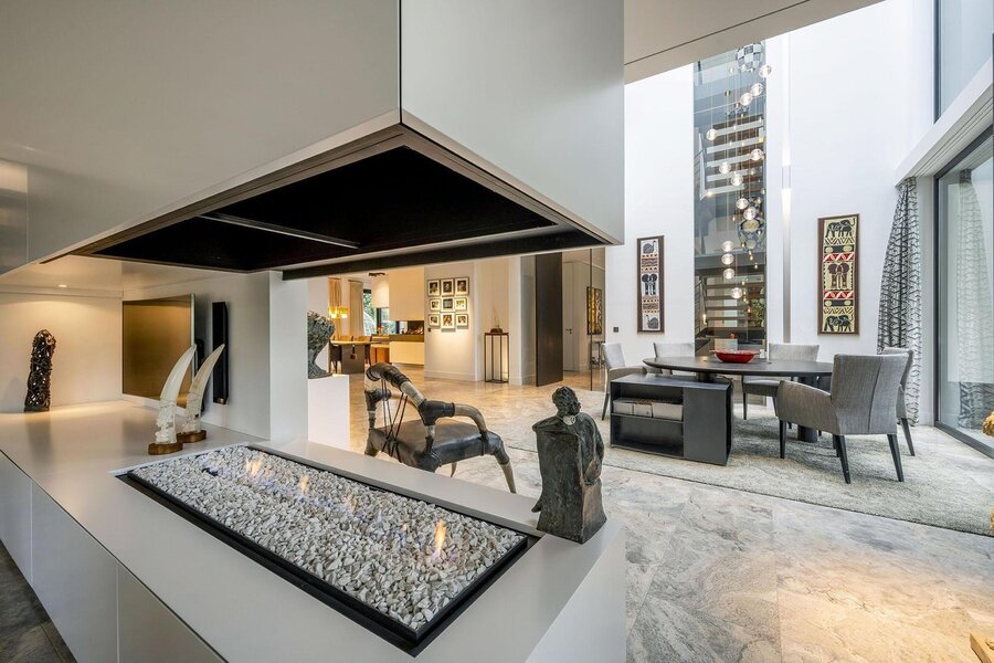 Vanaf de toegangspoort rijdt u de bosrijke tuin in waarbij direct opvalt dat de villa is gelegen aan de voet van de tafelberg, en zodanig gepositioneerd dat het glooiende karakter maximaal tot zijn recht komt. De villa heeft een zeer hoog afwerkingsniveau en verkeert in een uitstekende staat van onderhoud. Het ontwerp is een perfecte combinatie van een modern klassieke buitenkant met onder meer een steile indrukwekkende rieten kap, en een moderne binnenkant welke wordt gedomineerd door een negen meter hoog atrium. Door de toepassing van veel glas aan de binnenzijde verstrooit het licht vanuit boven door de gehele villa. Het hoogwaardige materiaalgebruik geeft ongekende luxe en overal perfectie tot in de details. Het interieur straalt rust uit door een heldere lijn in kleurstelling en materialen welke consequent zijn doorgezet tot in de kleinste ruimten. De woning kent een prettige en logische indeling, met vloeiende overgangen tussen ruimten en een optimale verhouding in grootte tussen de verschillende vertrekken. De achterzijde van het perceel grenst aan privé natuurgebied en de woning is op zodanige afstand van de weg gelegen dat optimale privacy is gegarandeerd. Het souterrain is verzonken ín het glooiende terrein en opent zich middels een tweetal taluds met veel binnenvallend licht naar het westen en oosten. De vloer van het souterrain ligt feitelijk dus op straatniveau. Dat souterrain is ook waar u in de carport of in de inpandige garage, uit uw auto stapt.