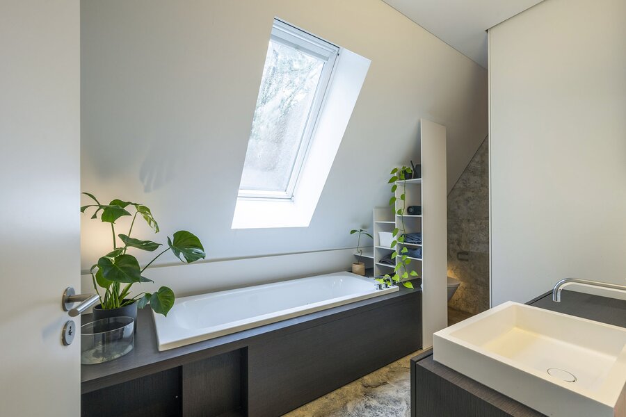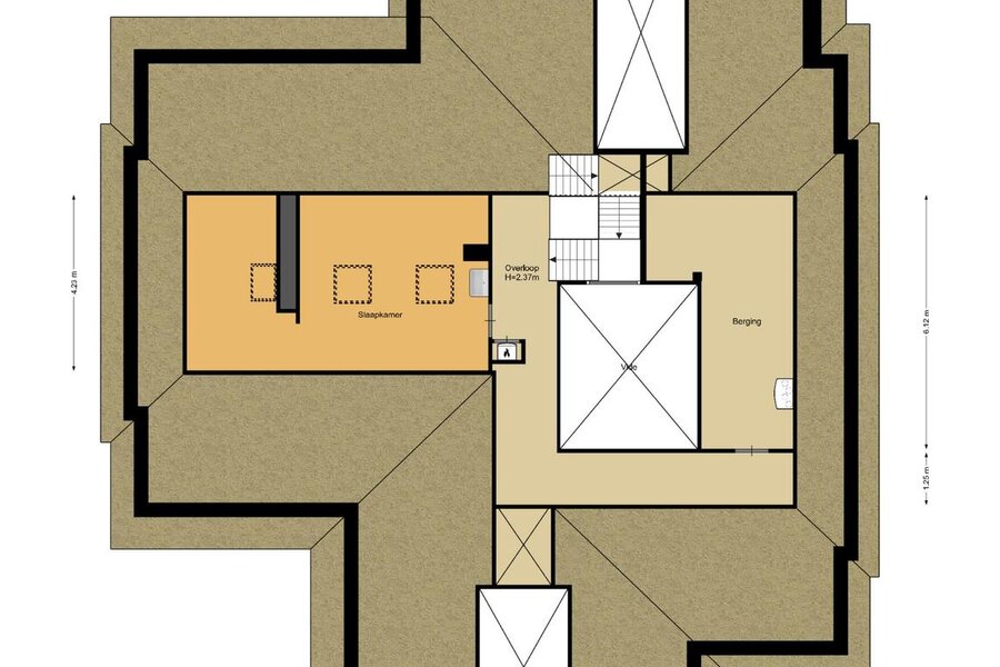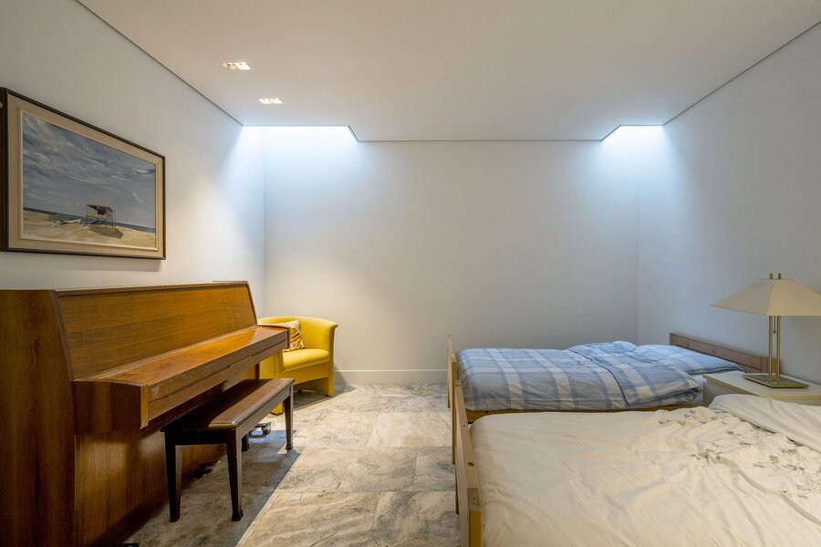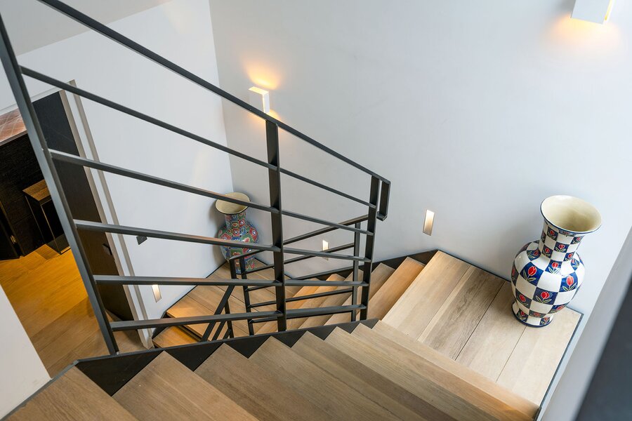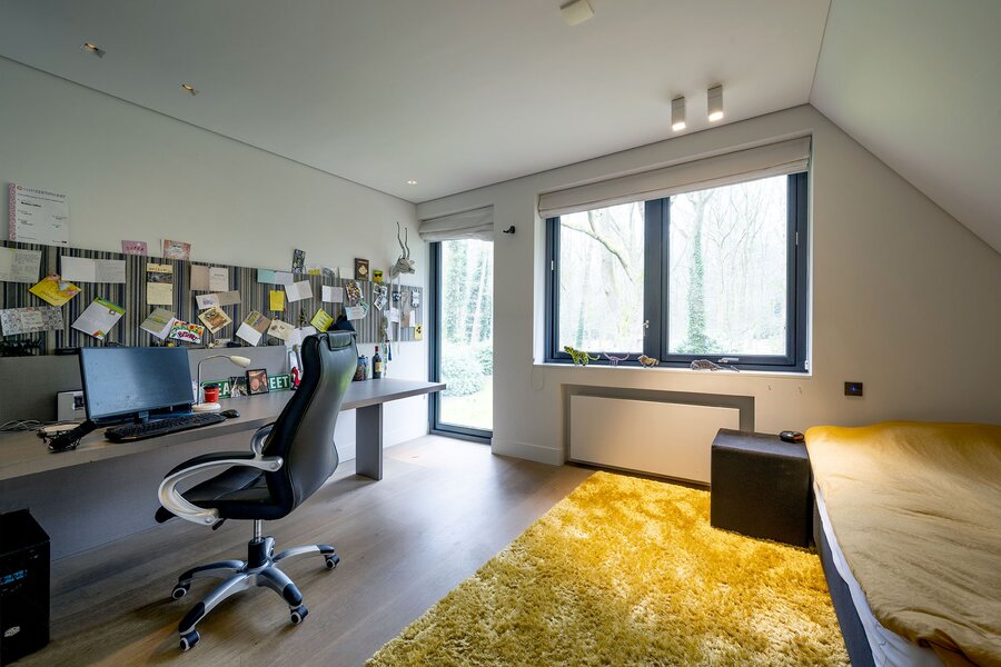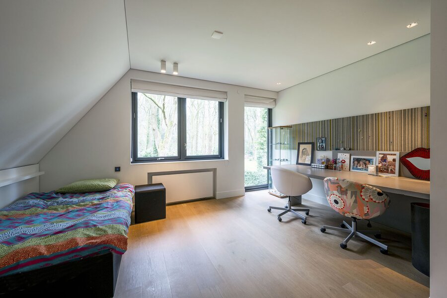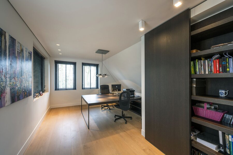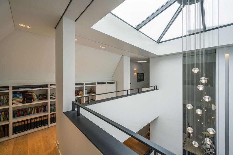 Bij aankomst op een overloop heeft u zicht op het ruimtelijk atrium. Hier bevindt zich ook een bibliotheek, en toegang tot een grote bergzolder met onder meer techniek, en tot een grote slaapkamer welke kan worden aangepast tot een zelfstandige studio (bijvoorbeeld voor een au-pair).