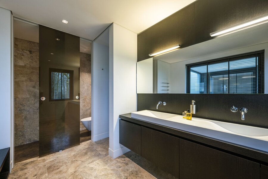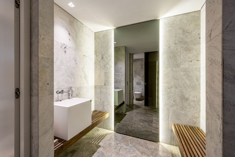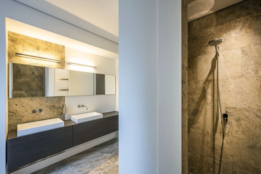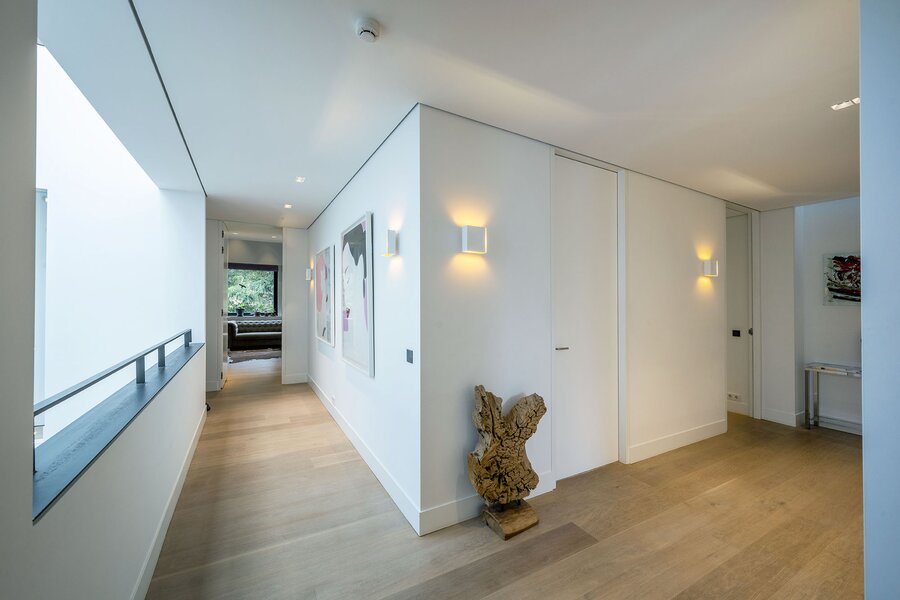 We lopen naar boven en komen op de ruime overloop welke in open verbinding staat met het atrium. Vanaf hier hebben we toegang tot drie vleugels met in totaal vijf slaapkamers, drie badkamers en een waskamer. Ieder kamer heeft ingebouwde kastruimtes en in de masterbedroom bevinden zich twee walk-in closets en treft u een aangrenzend buitenbalkon.